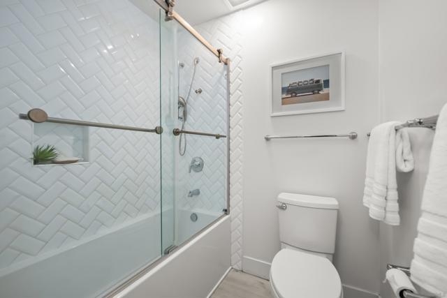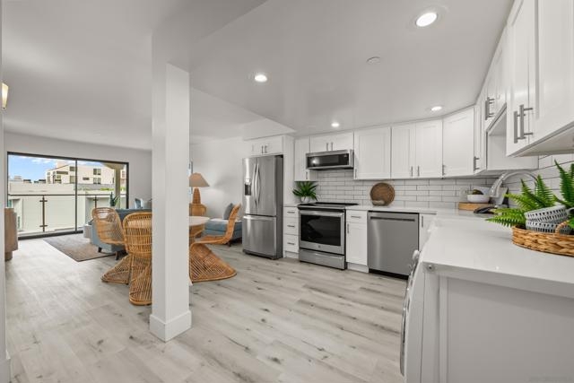 Live Steps from Sail Bay in Pacific Beach! Experience coastal living at its finest in this condo with direct beach and spa access. The stunning kitchen features sleek stainless steel appliances, quartz countertops, and abundant cabinet space and an in-unit washer/dryer combo for convenience. Enjoy vinyl waterproof flooring throughout and custom-built closets in both bedrooms. The beautifully updated bathroom includes a double vanity, herringbone subway tile, and a modern glass-enclosed tub/shower. Elegant shaker doors and premium LED lighting. Relax on your private balcony and take in the serene water views — the ultimate beachside retreat!