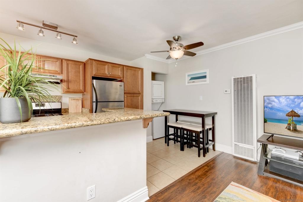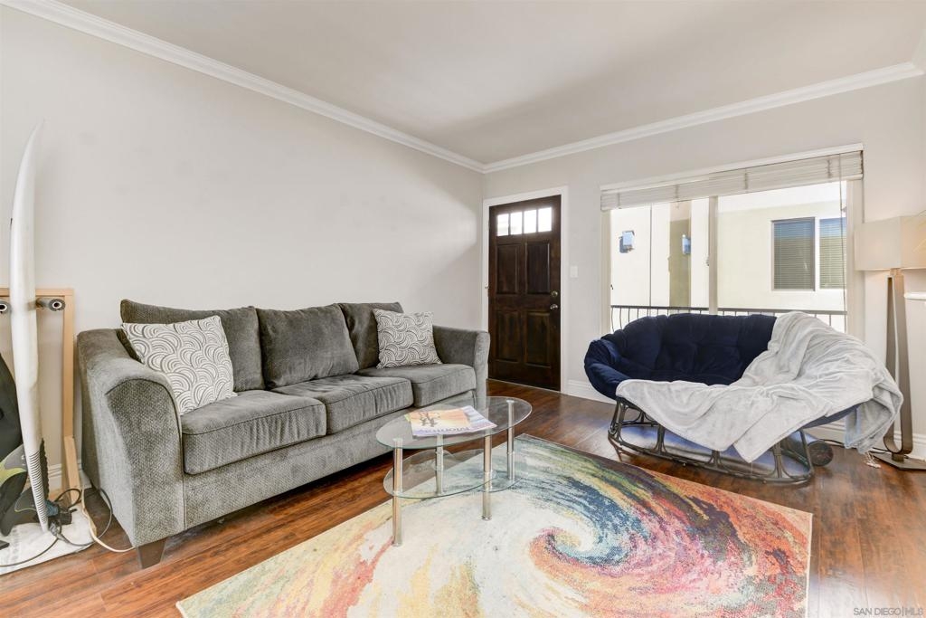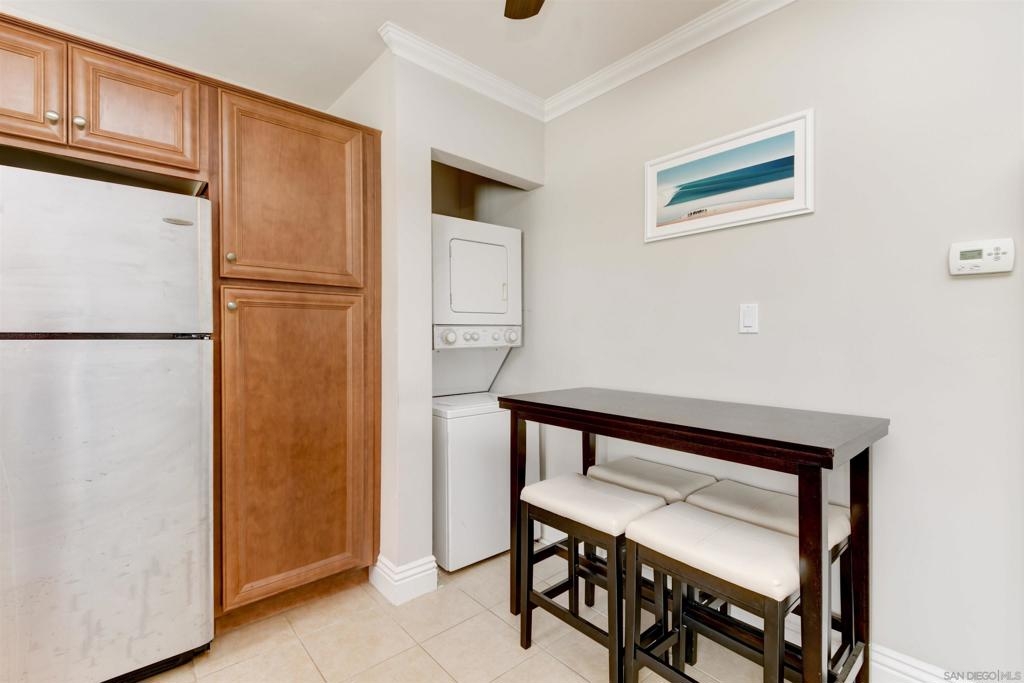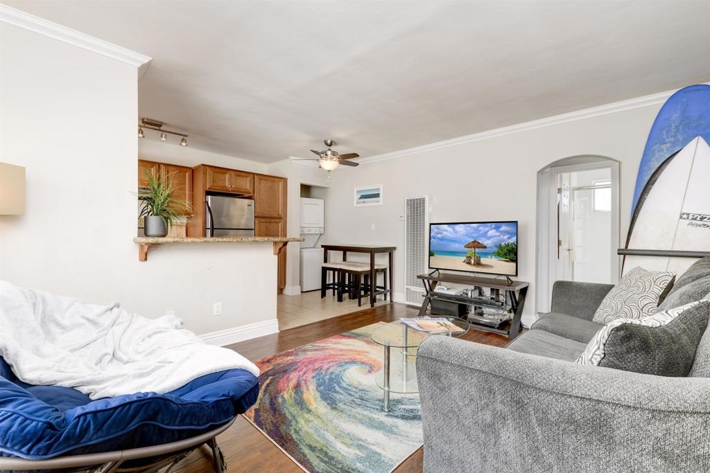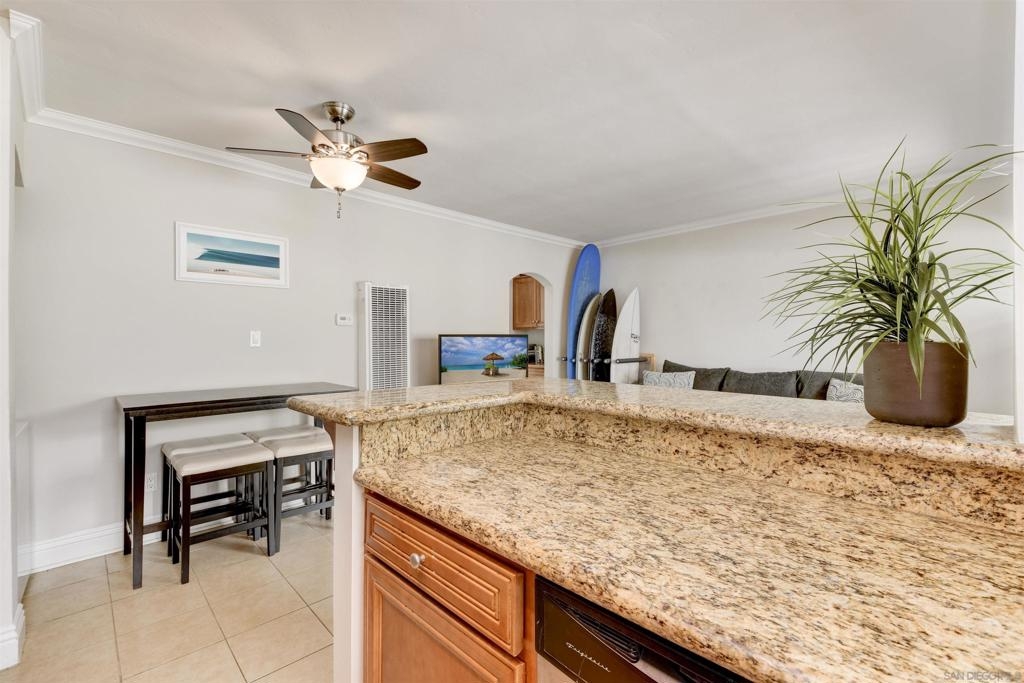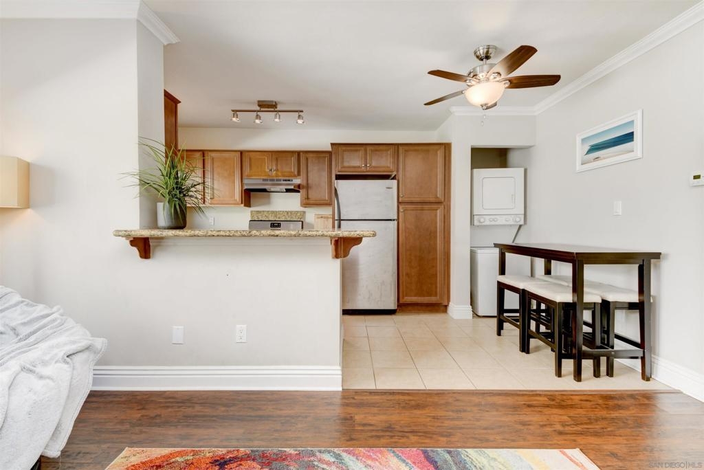 This top-floor, one-bedroom condo is an absolute gem in the heart of Pacific Beach. With the beach .7 miles away and a retail paradise (including Trader Joe's, Sprouts, and Donut Bar) a mere .3 miles from your doorstep, convenience has never looked so enticing. Granite countertops, storage aplenty, and stainless steel appliances create a culinary haven. In the spacious, west-facing bedroom, natural sunlight dances through the windows, illuminating floor-to-ceiling closets. The light and airy bathroom, your personal sanctuary, boasts a stand-up shower and vanity storage that will make your morning routine a delightful experience. And guess what? The cherry on top is having your very own private washer and dryer conveniently located inside the condo, bidding farewell to laundromat adventures. Parking woes? Not here! Your chariot will find its designated spot in the assigned off-street parking space, ready and waiting for your next adventure. Tucked away, this exclusive 7-unit community is the epitome of charm with complete security to keep your worries at bay.