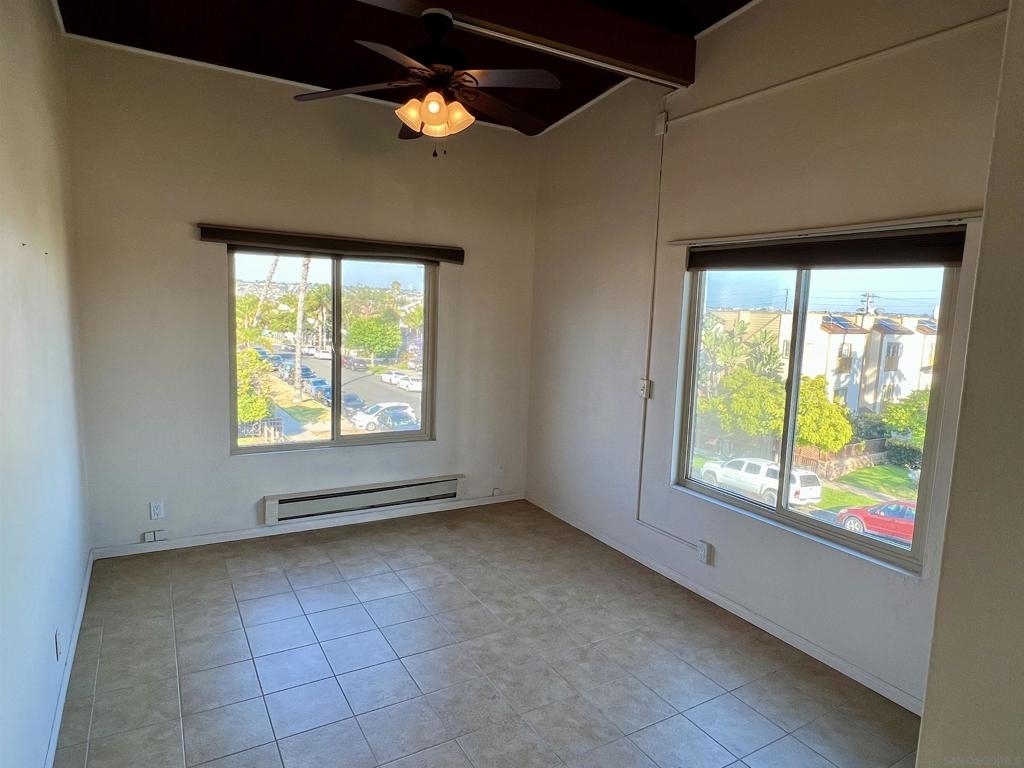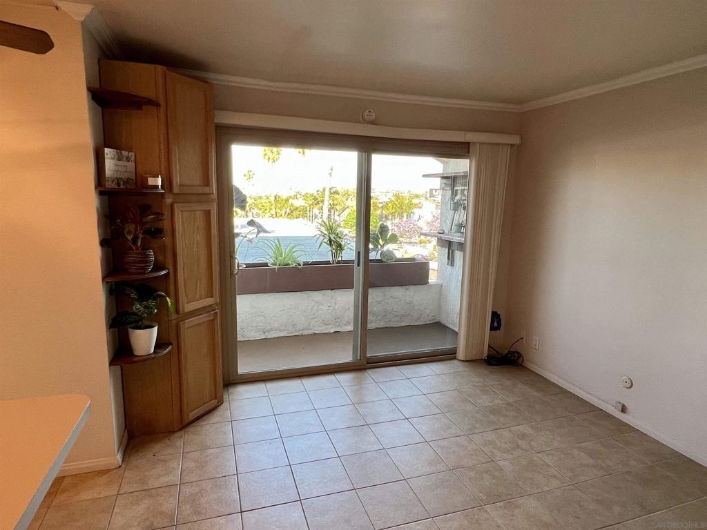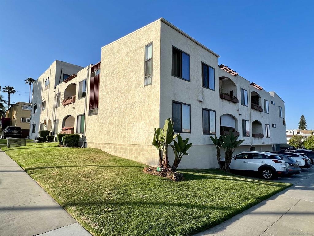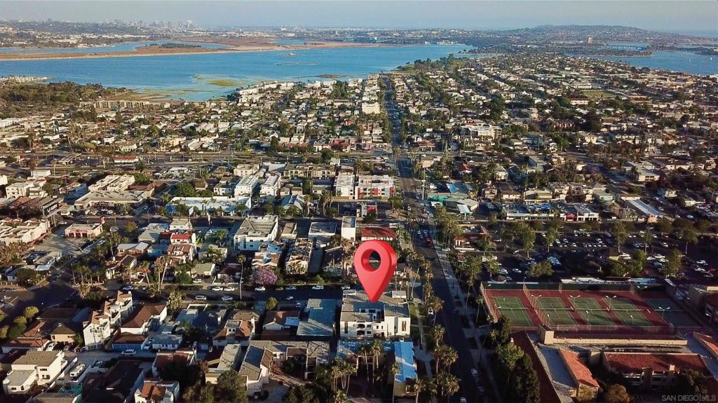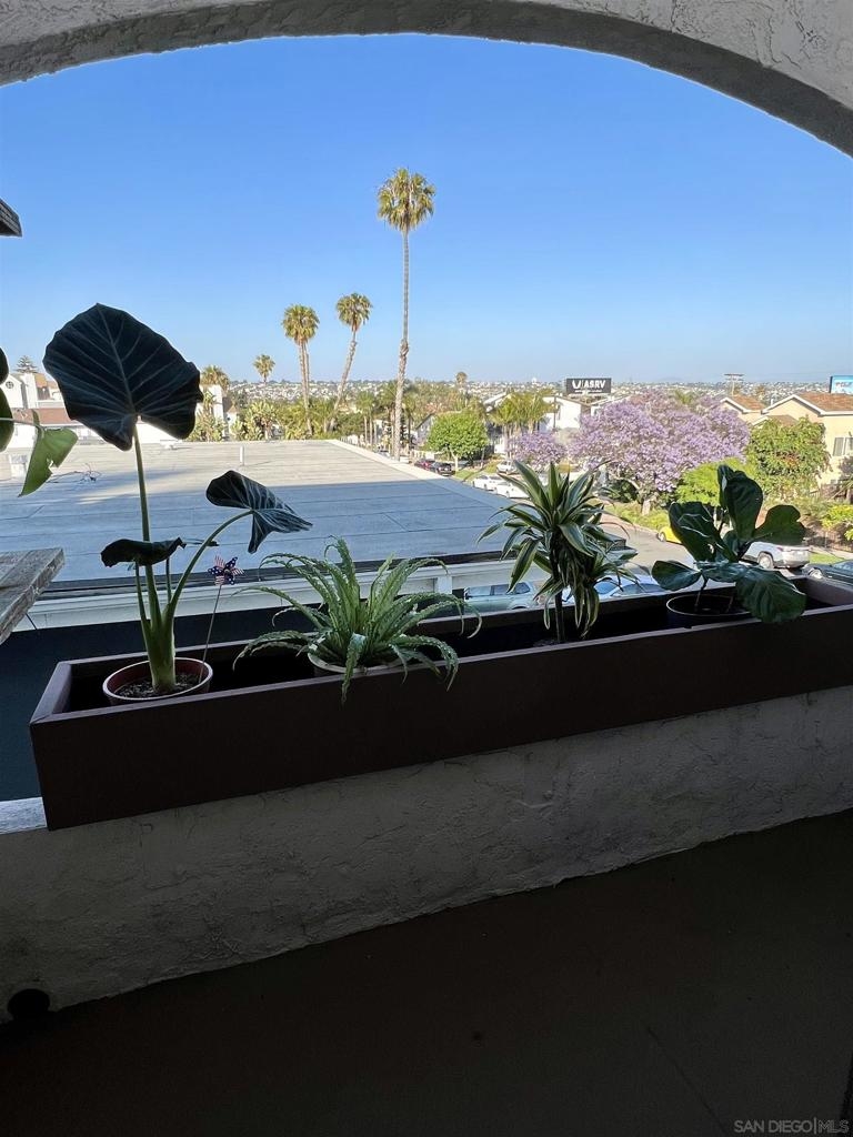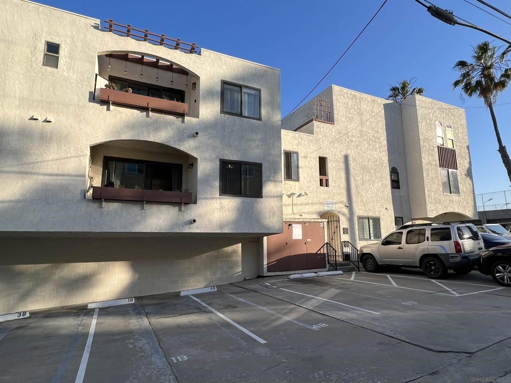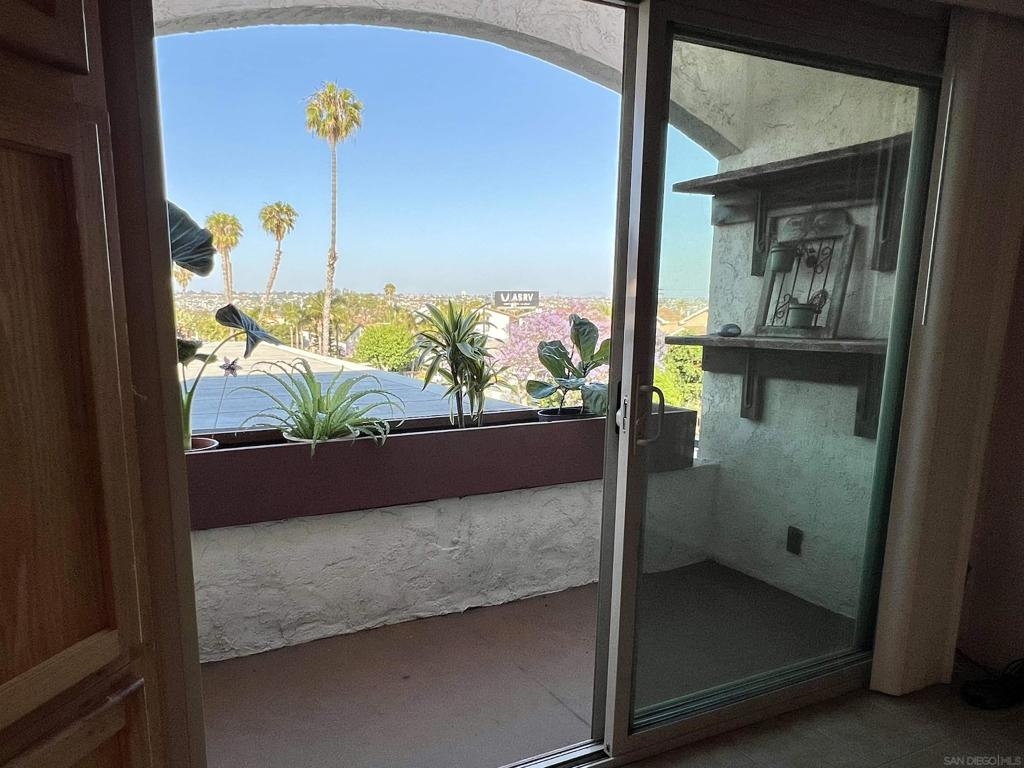 Wonderful location. Relax with cool breezes and peekaboo views of both Mission Bay and the Pacific Ocean from your top floor hideaway. Enjoy SeaWorld fireworks from your bedroom window! This one bed, one bath home will captivate you with an inviting patio balcony featuring morning light and a large planter box for your green thumb. Sliding glass doors and tile flooring leads you to spacious countertop kitchen seating area and an efficient layout of maple cabinets and enchanting lighting. A hidden efficient office will allow you to work comfortably from home, with built-in desks and ample fresh air and/or window light. You will also enjoy secured storage, assigned parking (some residents park TWO CARS - tandem style!) All this, in a cozy building, just walking distance to restaurants, shopping, nightlife - and all the fun that the Beach and Bay have in store!