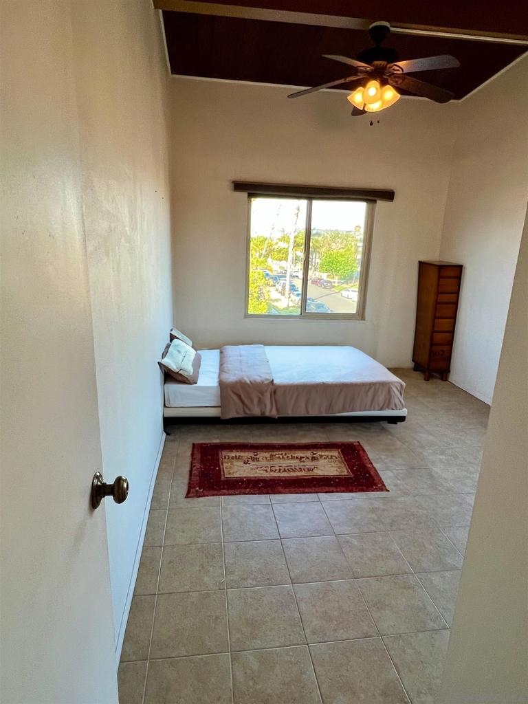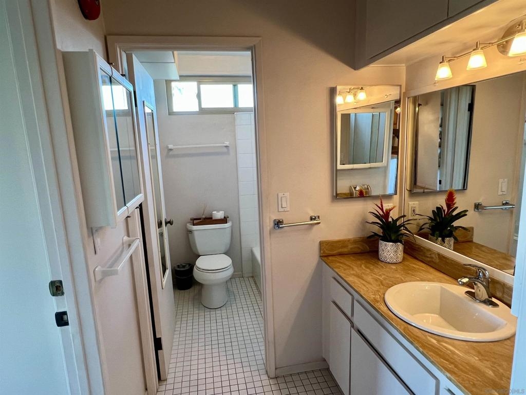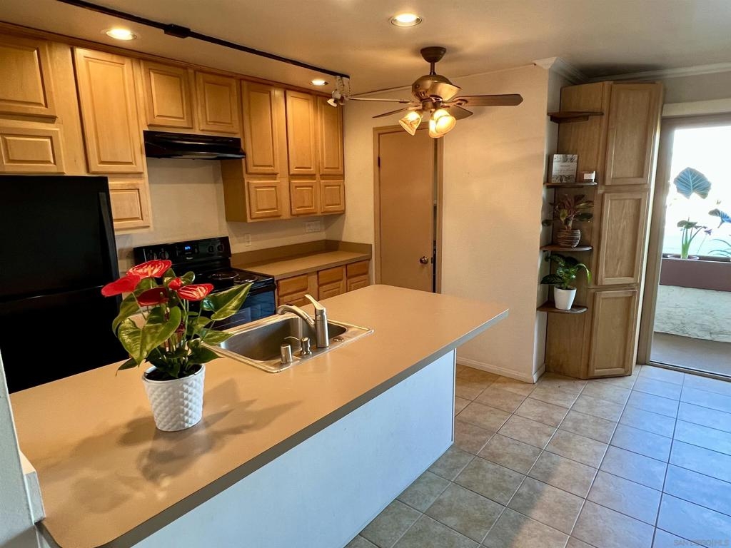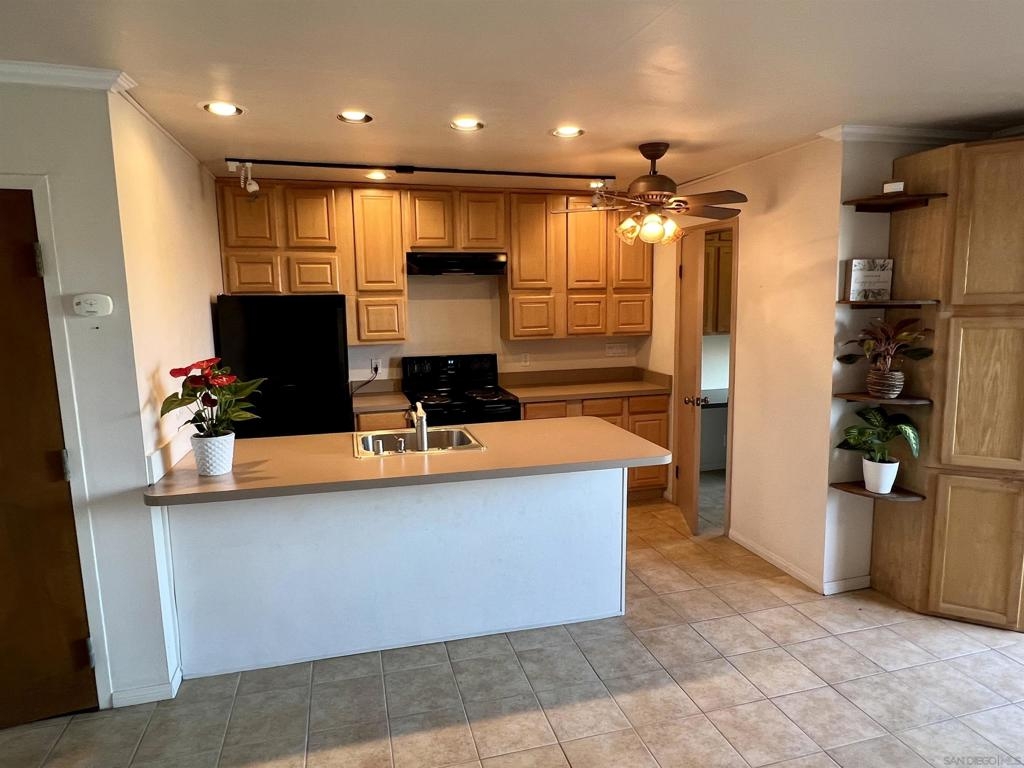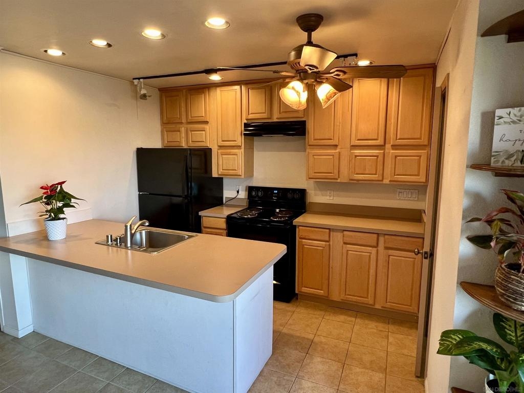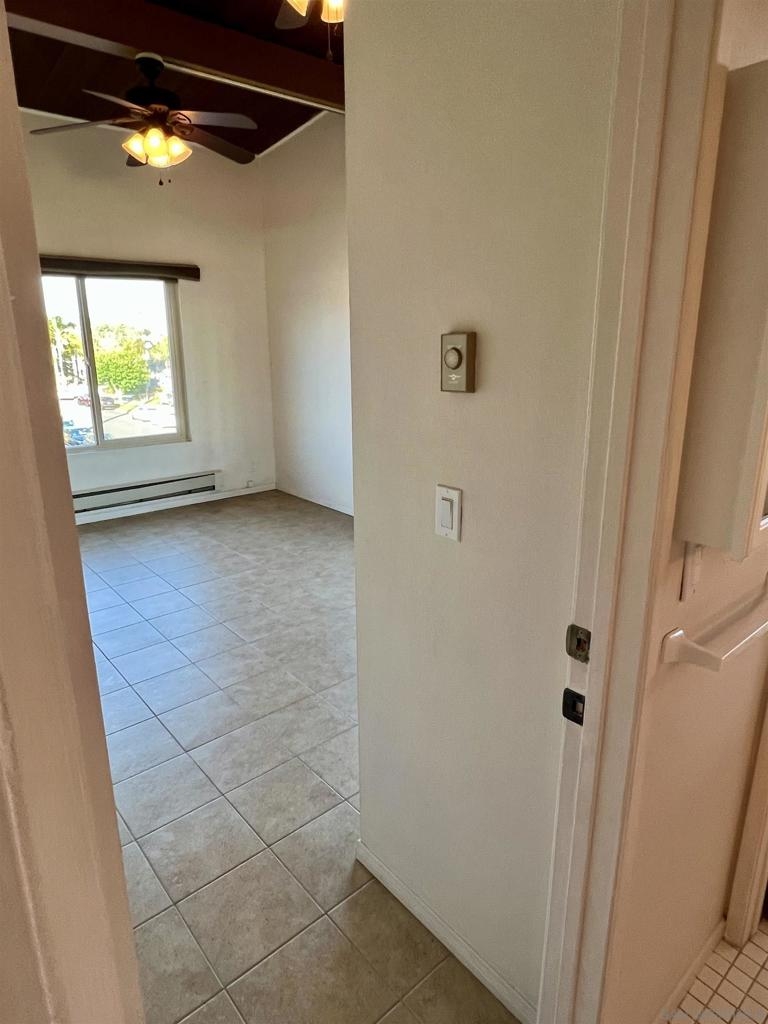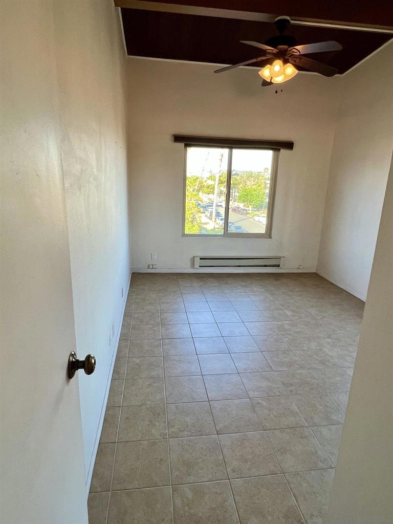 Wonderful location. Relax with cool breezes and peekaboo views of both Mission Bay and the Pacific Ocean from your top floor hideaway. Enjoy SeaWorld fireworks from your bedroom window! This one bed, one bath home will captivate you with an inviting patio balcony featuring morning light and a large planter box for your green thumb. Sliding glass doors and tile flooring leads you to spacious countertop kitchen seating area and an efficient layout of maple cabinets and enchanting lighting. A hidden efficient office will allow you to work comfortably from home, with built-in desks and ample fresh air and/or window light. You will also enjoy secured storage, assigned parking (some residents park TWO CARS - tandem style!) All this, in a cozy building, just walking distance to restaurants, shopping, nightlife - and all the fun that the Beach and Bay have in store!