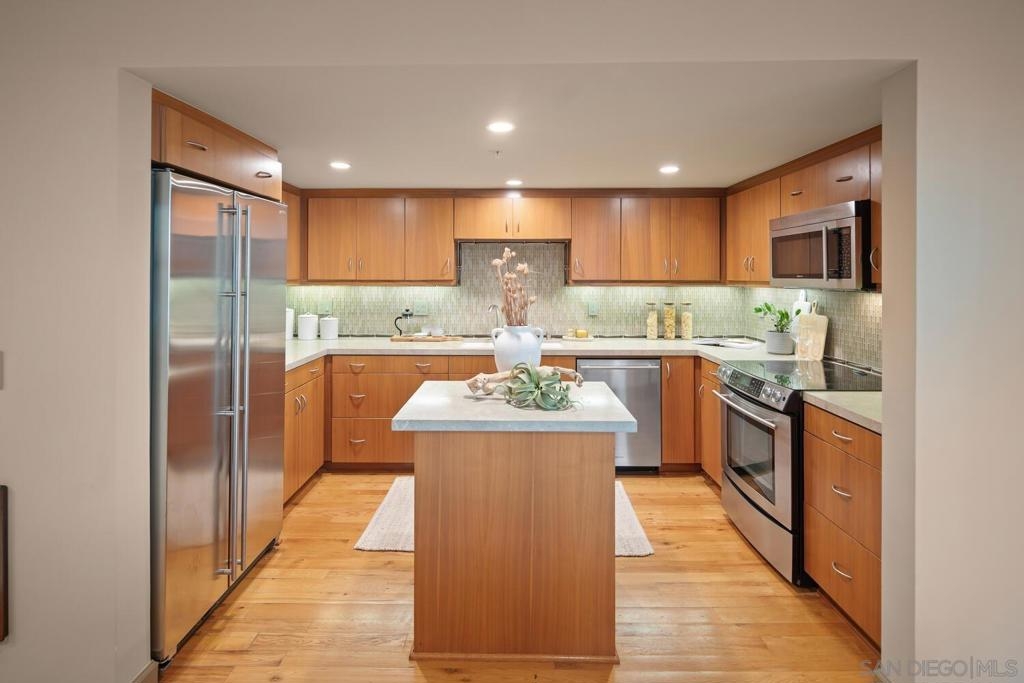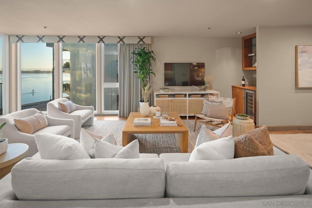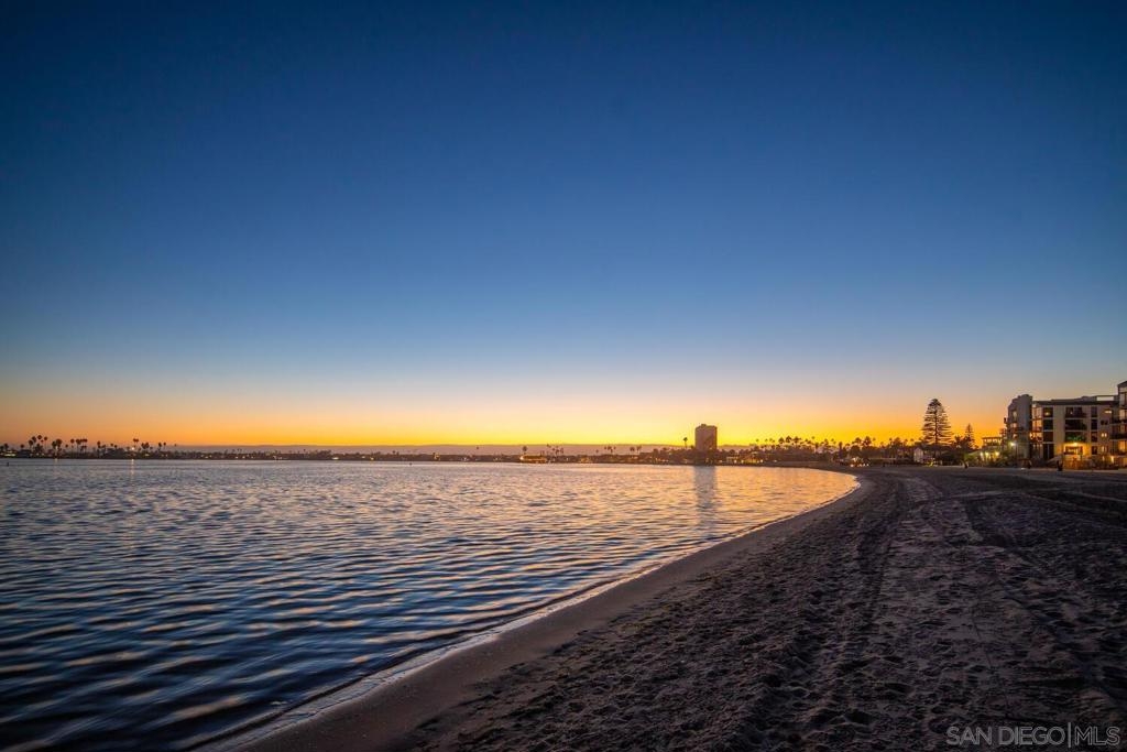 Experience luxurious bay front living in this beautifully upgraded residence featuring breathtaking panoramic views of Sail Bay with direct access to the sand. Embrace the dream coastal lifestyle in this two bedroom, two bathroom condo, where you can relax on your private balcony and take in captivating views of the sparkling bay, saltwater pool and spa, and glowing sunsets. The gourmet kitchen features limestone countertops, custom cabinetry, and premium stainless steel appliances. The primary en-suite and hall bath are both luxuriously appointed with quartz countertops, custom tile, and marble flooring and showers. A large built-in desk adjacent to the dining room provides an ideal workspace. Additional upgrades include reclaimed oak wood flooring, cozy fireplace, floor to ceiling windows, bar area with beverage fridge, cedar lined California Closets, new LED lighting, and Lutron lighting controls. Enjoy the convenience of a full size washer and dryer tucked away in a spacious storage closet with built in shelving. Additional features include 1 assigned underground parking space with storage locker, community bike storage, and storage closet on the private balcony. Enjoy the Sail Bay lifestyle with instant access to bike or stroll along the boardwalk, paddle board or sail right from your doorstep, and lounge in the beachfront saltwater pool and spa. Ideally located near local restaurants, shops, Fanuel Street Park, and just blocks to Pacific Beach, this exceptional home offers a perfect blend of serenity, luxury, and premier bay front living in an unbeatable location.