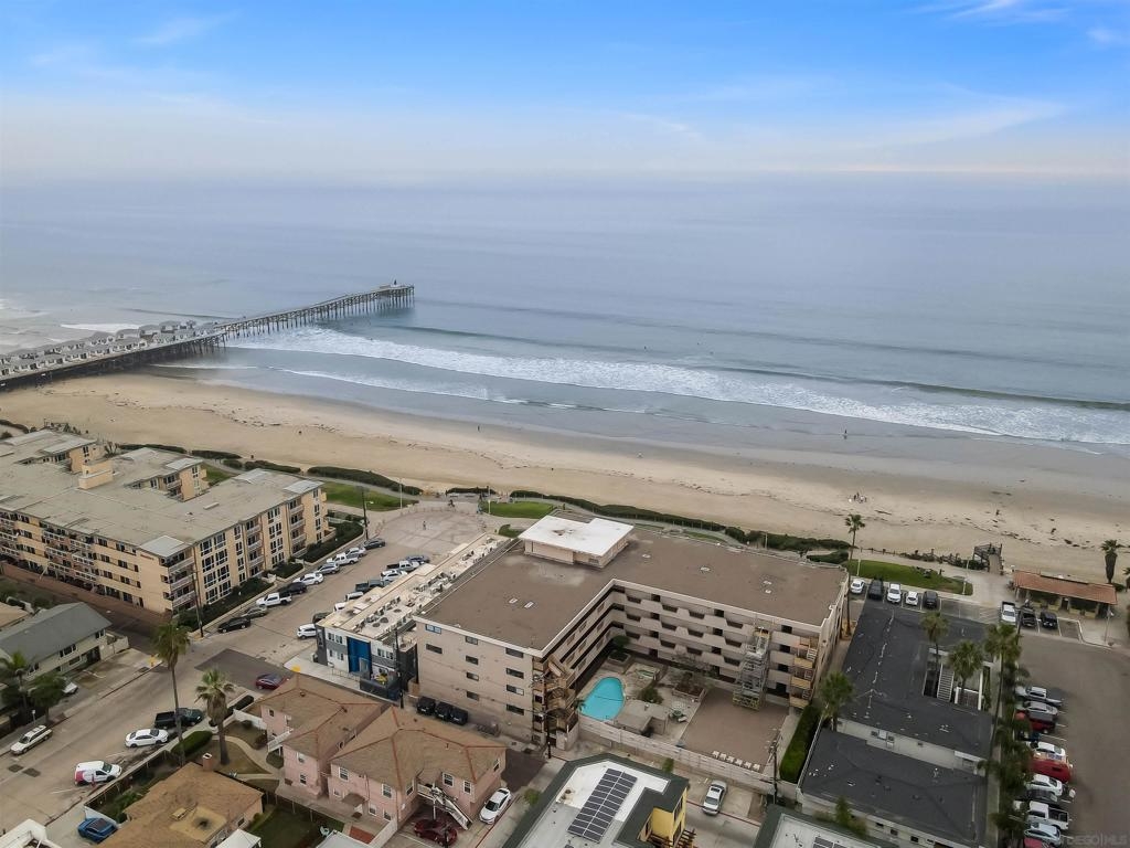 Come enjoy your new beach home seconds from the water and walking distance to all that Pacific Beach has to offer. Ocean front and views of Crystal Pier. Alternatively, this condo has been a lucrative and appreciating investment property, highly sought after by short-term, repeat, monthly, and annual renters with minimal upkeep needed from the owner. 697 sqft, 2 bed, 1 bath, tastefully designed, vinyl flooring, granite countertops in kitchen, stainless steal appliances, recessed lighting, freshly painted interior, and a newly remodeled bathroom. Community pool w/ spa, laundry facility on site, secured garage parking w/ storage. If you want to hear the waves crashing as you fall asleep or wake up, this is the home for you. Complex Features: ,,,, Equipment: Fire Sprinklers Sewer: Sewer Connected Frontage: Ocean/Sand