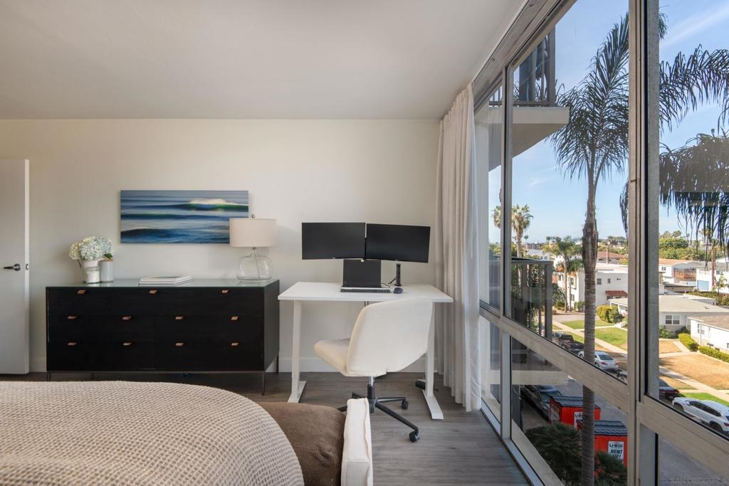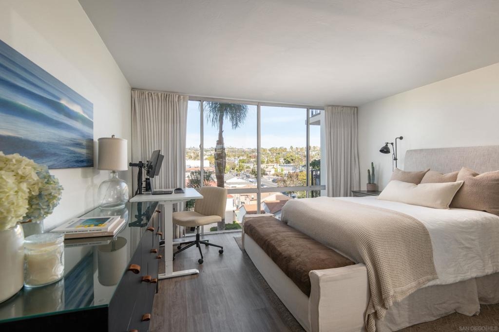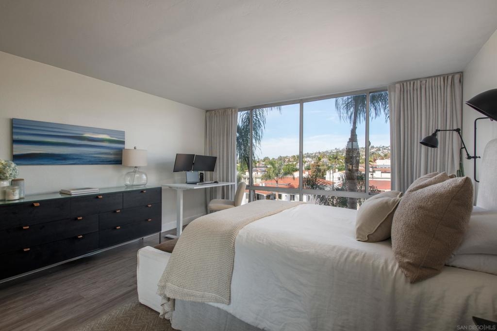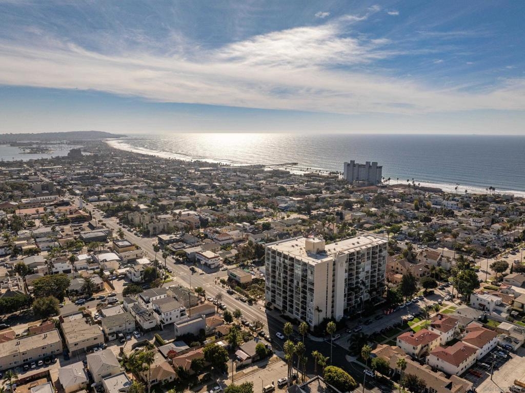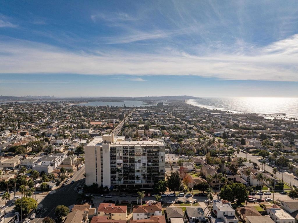 Embrace elevated living and coastal charm from this beautifully remodeled 2-bedroom, 2-bath condominium situated in the vibrant community of Northwest Pacific Beach. Designed with modern upgrades and a beachy charm, the open-concept layout is bathed in natural light from floor-to-ceiling windows in the living room and primary bedroom—creating an ideal setting for relaxation and entertaining. Newly remodeled highlights include a beautiful primary bathroom with a walk-in tiled shower, custom blinds in the living room and primary bedroom, and a stunning handmade Moroccan tile backsplash in the kitchen. Enjoy sweeping southwest views of white water ocean vistas, Mission Bay, Point Loma, and evening lights from the entry and second bedroom. The spacious living room balcony and primary suite provides ocean and expansive La Jolla hillside views creating a serene and luxurious retreat. Located just blocks from renowned beaches, this home places you steps away from vibrant shops, cafes, dining, and nightlife. Pacific Tower offers residents a gated lobby, secure parking garage, elevators, laundry, pool, sauna, fitness center, and recreation room for small gatherings. This is San Diego living at its finest—don’t miss the opportunity to call it yours!