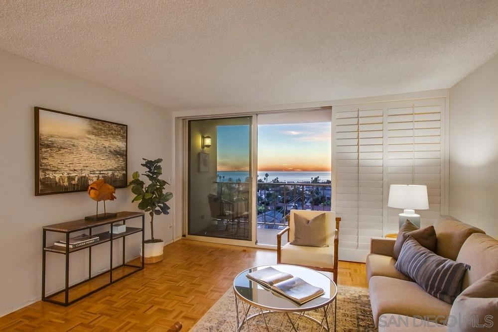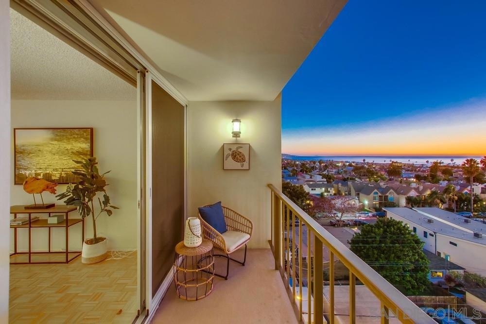 Rarely available Western facing Pacific Towers condo 3 SHORT BLOCKS TO THE BEACH! Hardwood parquet floors, a remodeled kitchen, storage galore, and THAT SPECTACULAR VIEW are just a few of the MANY upgrades in this unit!!! European white cabinetry with soft close, full extension drawers and cabinets, silestone counters with a large pristine sink, brand new dishwasher, built in wine rack, leutron lighting, and bar seating create define this remodeled kitchen space. Look out into the spacious great room... complete with a dining area, ceiling fan, new custom shutters, and display shelving that doubles as a murphy bed for guests! The master bedroom has unparalleled ocean views, 2 built in closets, and new custom shutters for complete privacy when desired. Shelf after shelf of storage allows plenty of room for pantry items, towels, and belongings outside of the bathroom and kitchen. The bathroom has oversized mirrored medicine cabinets, a new low flow shower head, grab bars outside of the bath, and beautifully tiled flooring and countertops. Dual pane windows throughout the unit provide excellent insulation and sun protection and eliminate sound. Feel secure with a new top of the line front door lock, your own parking spot in the gated parking garage, and your own large storage locker in the 7th floor laundry room. Experience Pacific Towers, one of the two high rise buildings in Pacific Beach, with highly desired amenities and high speed elevators. Brand new washers and dryers in all laundry rooms, a trash chute with daily trash pick up, a pool, a club house room with new exercise equipment, showers, sauna, kitchen, and free wifi, and an on site manager in the lobby. HOA dues include cable TV, water, and trash pick up. Walk three blocks to the gorgeous Pacific Ocean. Experience all that North Pacific Beach has to offer. Hurry, this one won't last! Complex Features: ,,,,, Equipment: Garage Door Opener Other Fees: 0 Sewer: Sewer Connected Topography: LL