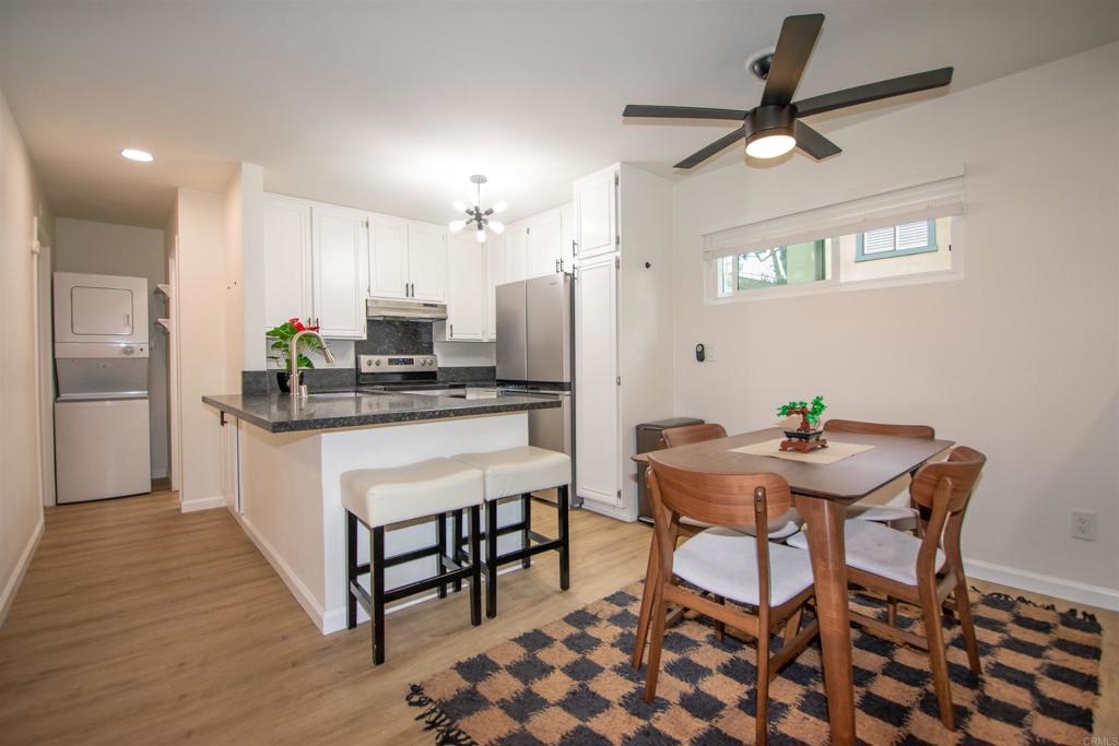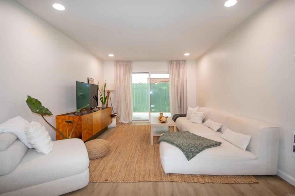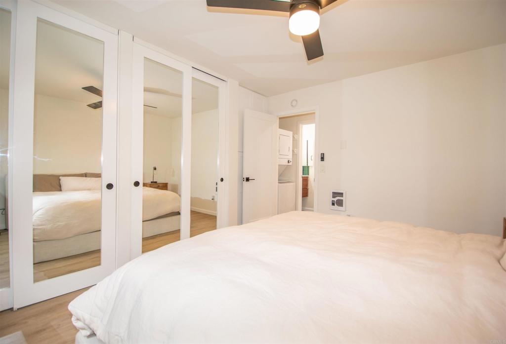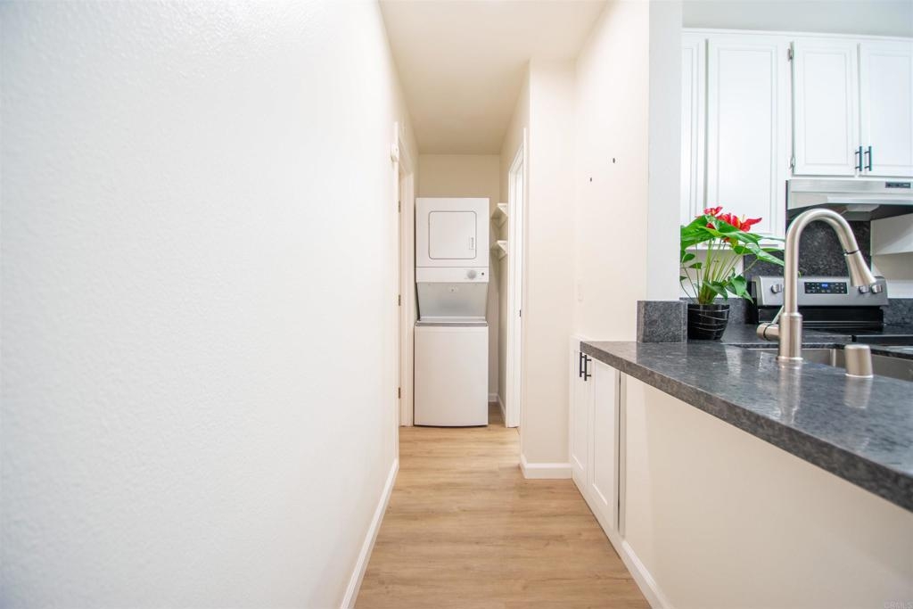 Location, Location, Location! Modern corner unit condo nestled in the heart of Pacific Beach, a short distance away from the vibrant energy of the area. As you step inside, you're greeted by an open-concept layout, with a spacious living area perfect for entertaining. New water proof Luxury Vinyl flooring (LVP) throughout brightens the whole living space. The remodeled kitchen with sleek countertops, farmhouse sink, stainless steel appliances, and new cabinet hardware invites you to whip up delicious meals or craft cocktails while friends join you at the bar or kitchen table. The spacious bedroom offers large closets with high end mirrored doors and a brand new linen cabinet with new doors and hardware to keep everything organized. The newly remodeled bathroom has design elements which include Italian tile, modern vanity and fixtures, skirted toilet and modern glass shower door. A stackable washer/dryer has recently been installed inside the condo, but community laundry is also available. New shaker doors and new vinyl windows throughout plus a large sliding door leads to a spacious patio that offers cool ocean breezes and sunshine both outside and in. The fully fenced private community Pool is a short walk. The Beach, the Bay, Crystal Pier, Kate Sessions Park, Garnet Ave, trendy restaurants, hip cafes, lively bars, and boutique shops are moments away to soak in the coastal atmosphere of Pacific Beach. Yet essential amenities such as grocery stores, pharmacies, banks and public transportation, make daily errands also convenient. Walking distance to coffee shop, new trolly/train transit center, bike path accessible, La Jolla is just over Mt. Soledad and easy access to freeway which leads to liberty station, downtown, Balboa Park, the famous San Diego Zoo, Sea World. Parking and guest parking right in front. Turnkey condo with low HOA won't last long!