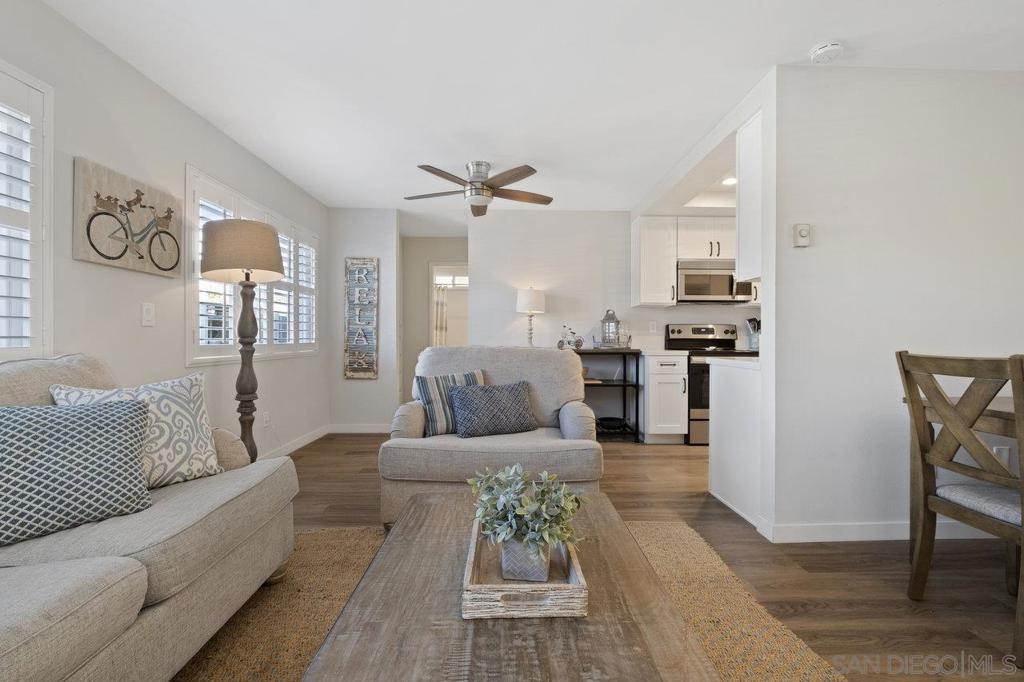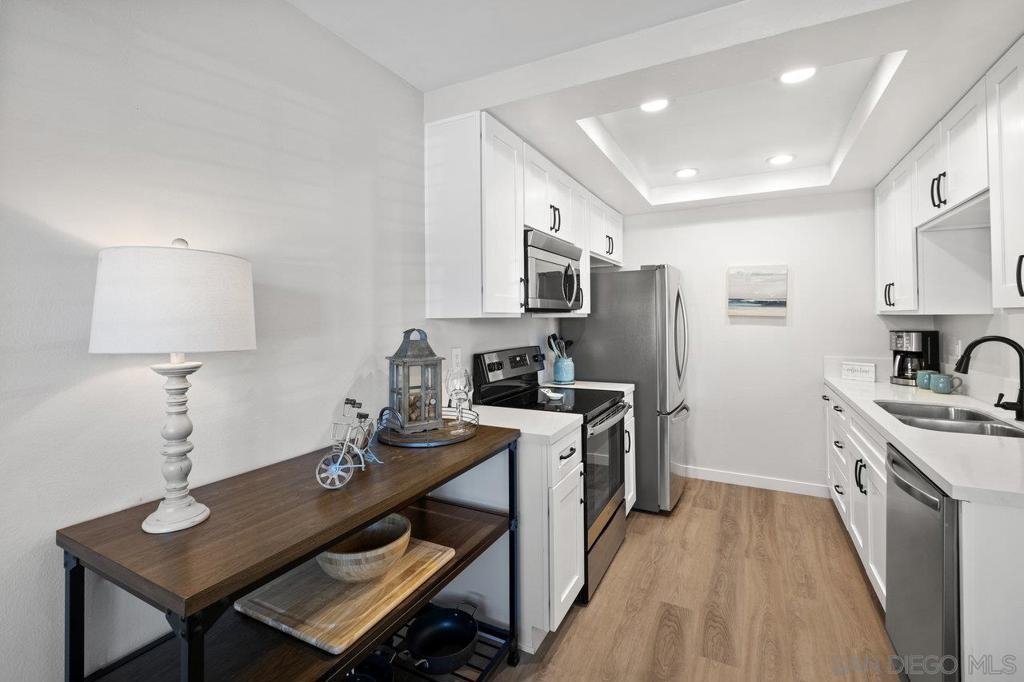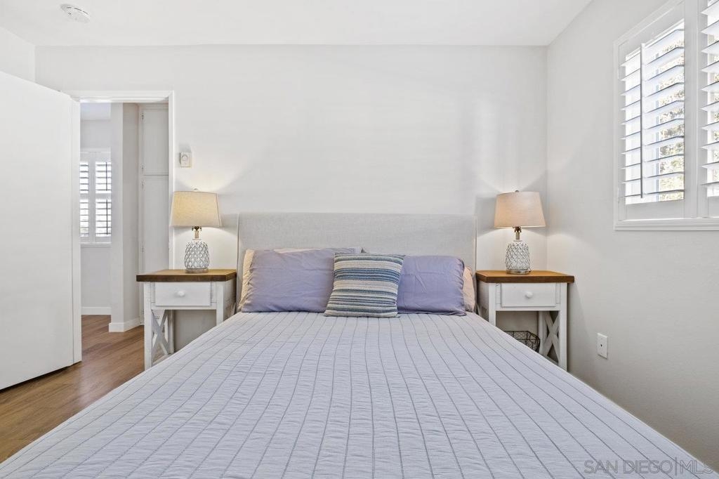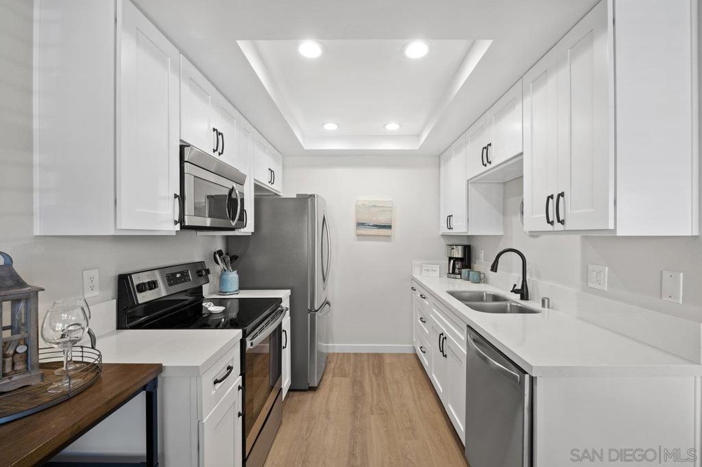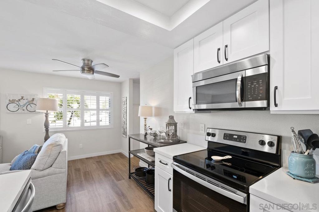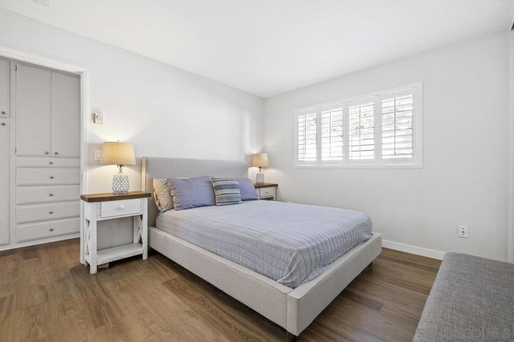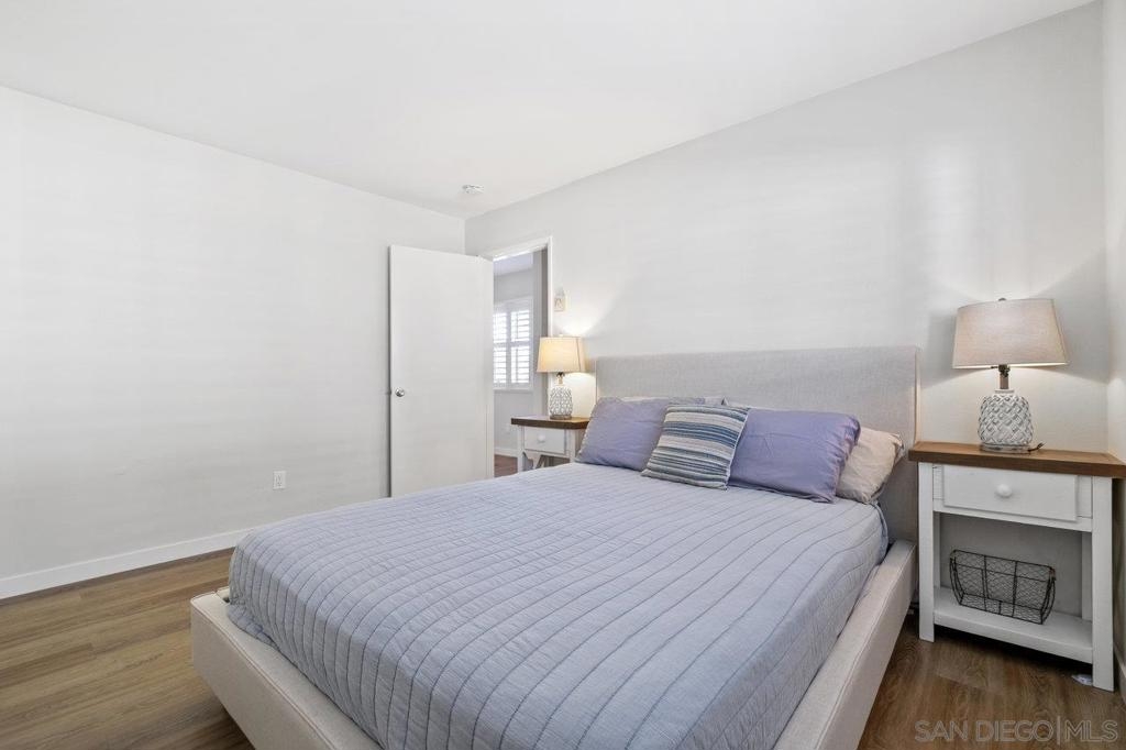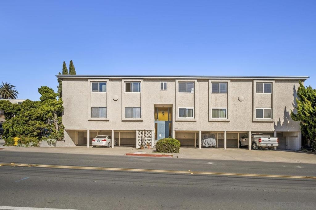 Fully remodeled corner unit 1 bed 1 bath at the bay. Gated community across the street from the Bay. 2 car tandem parking spots next to front entry - one of the spaces is carport covered. 2 large secure storage units in parking area. Adorable remodeled condo features the following upgrades -Dual paned windows, new plantation shutters, laminate flooring, recessed lighting, stainless appliances, ceiling fan, bathroom vanity and countertop, mirrored closet doors in primary. Premier location in PB - walk to Sail Bay, Crown Point Park and all Pacific Beach offers - shopping, restaurants, bike path and more. Move in ready! See Supp remarks for more. Community offers a community patio area with BBQ and bike rack for your beach cruisers. This end unit offers a lot of natural sunlight with wall to wall windows in the living room. Community laundry room with coinless app option. HOA replaced the roof in 2017. Great location and RARE 2 parking spaces for a one bedroom at the beach. Great for the first time buyers or investment opportunity.