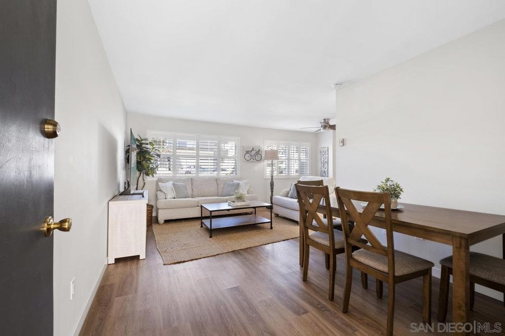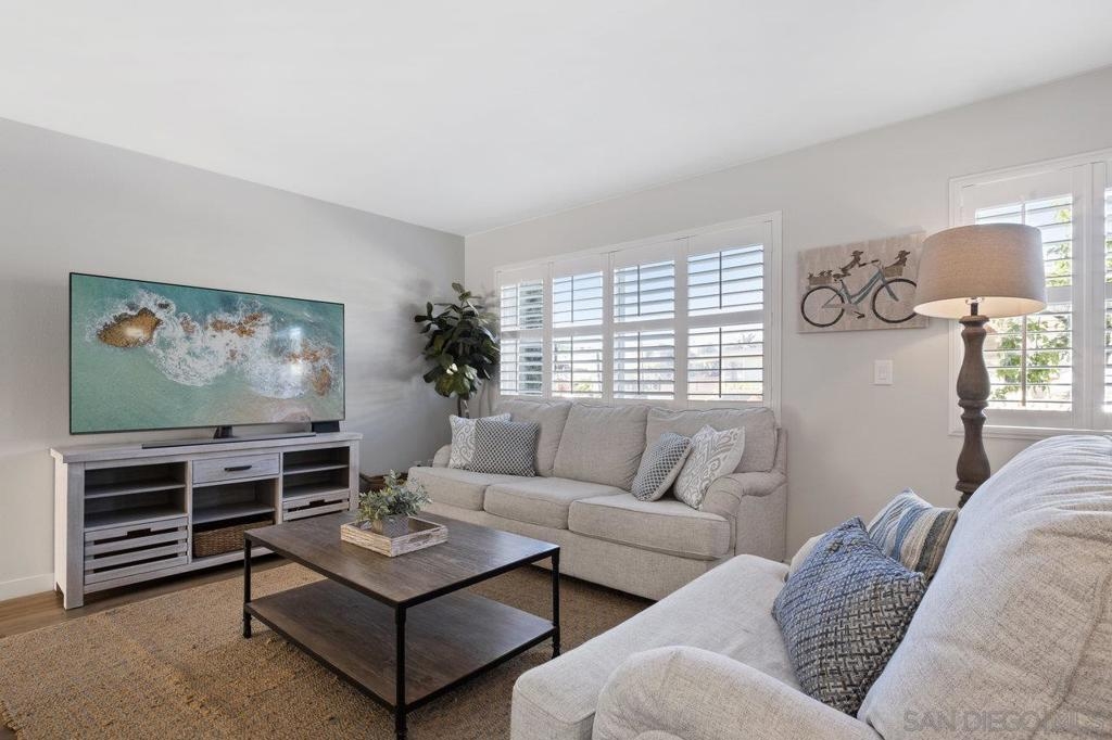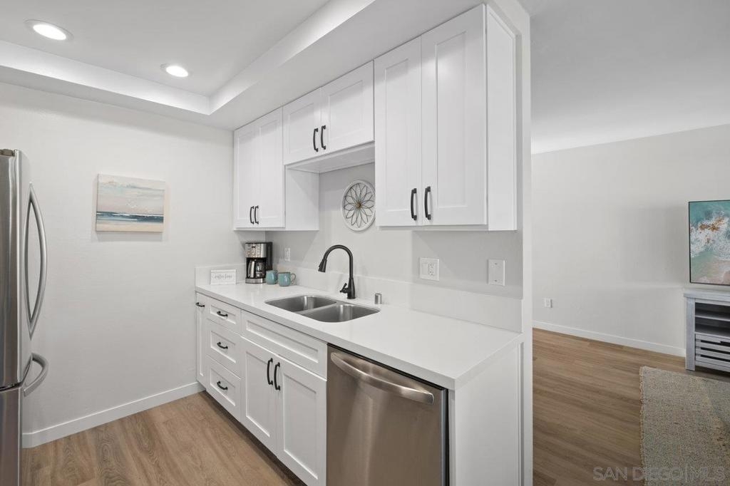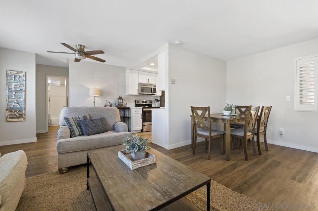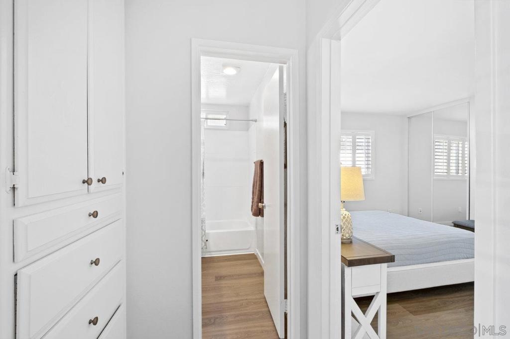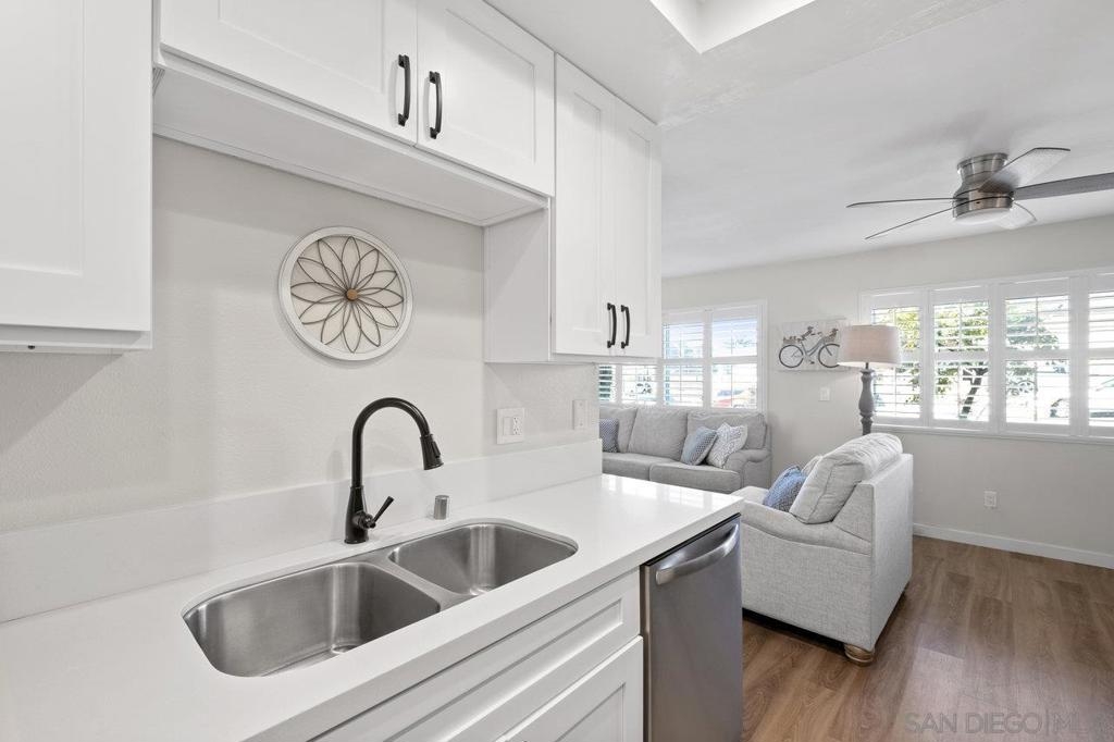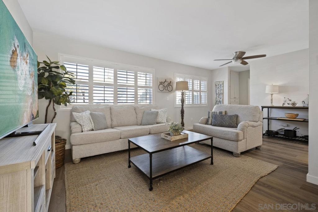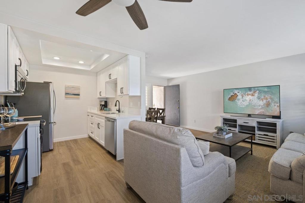 Fully remodeled corner unit 1 bed 1 bath at the bay. Gated community across the street from the Bay. 2 car tandem parking spots next to front entry - one of the spaces is carport covered. 2 large secure storage units in parking area. Adorable remodeled condo features the following upgrades -Dual paned windows, new plantation shutters, laminate flooring, recessed lighting, stainless appliances, ceiling fan, bathroom vanity and countertop, mirrored closet doors in primary. Premier location in PB - walk to Sail Bay, Crown Point Park and all Pacific Beach offers - shopping, restaurants, bike path and more. Move in ready! See Supp remarks for more. Community offers a community patio area with BBQ and bike rack for your beach cruisers. This end unit offers a lot of natural sunlight with wall to wall windows in the living room. Community laundry room with coinless app option. HOA replaced the roof in 2017. Great location and RARE 2 parking spaces for a one bedroom at the beach. Great for the first time buyers or investment opportunity.