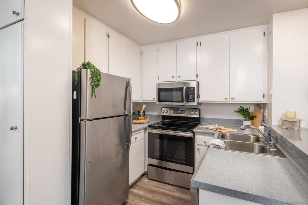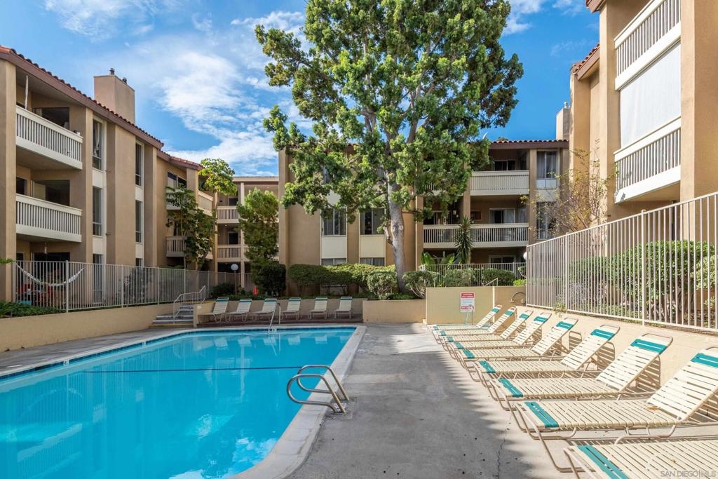 Coveted top floor unit in the resort like setting of the Plaza. Enjoy vaulted ceilings, Northern and Southern exposure light offer all day brightness, views of Kate Sessions and cool ocean breezes. The Plaza offers 4 pools, a fitness center, billiards room and more. Walkable to everything PB has to offer and a short bike ride to the ocean or bay. Don't wait, start living a laidback beach lifestyle in a resort like setting now. Sewer: Sewer Connected Topography: LL