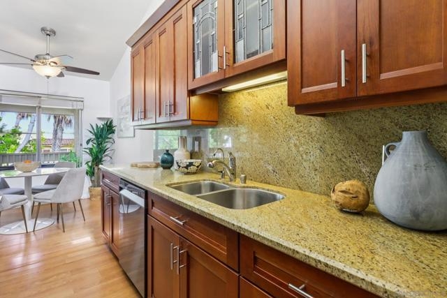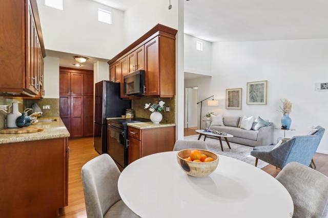 Soaring vaulted ceilings, clerestory windows, and an open floor plan create a bright, airy vibe in this spacious top-floor condo. The living room, dining area, and kitchen flow seamlessly onto an extra-long balcony with Bay Views! The updated kitchen features nearly new Samsung Smart appliances and smart-home compatibility, while the split dual-primary suite layout offers flexibility for guests or roommates. Move-in ready with abundant closet space, a reverse osmosis water system, and two secure parking spaces (one in the garage). Located in The Plaza, a beautifully landscaped gated community with a serene pond, two pools, two spas, tennis courts, a clubhouse, and multiple outdoor gathering areas. Just minutes from both the beach and the bay, you’ll enjoy the best of Pacific Beach living — from boardwalk strolls and water sports to vibrant dining, shopping, and nightlife.