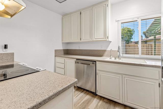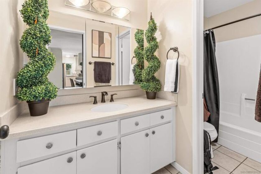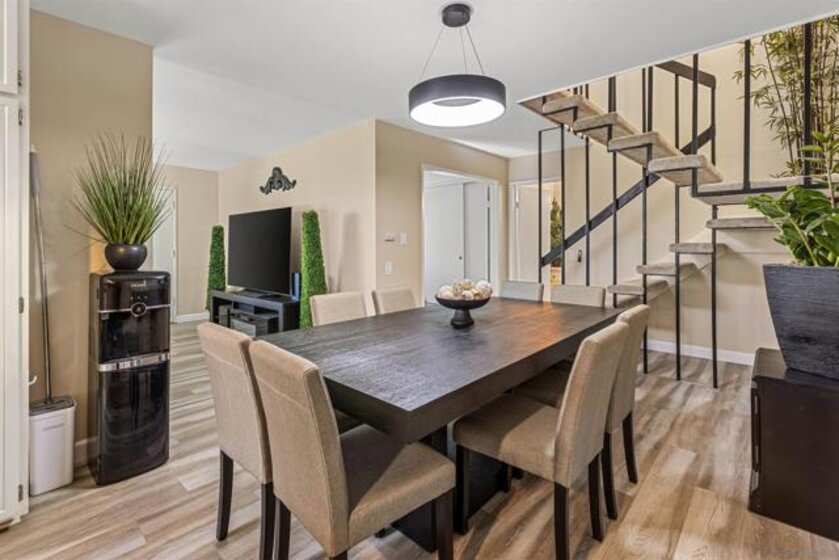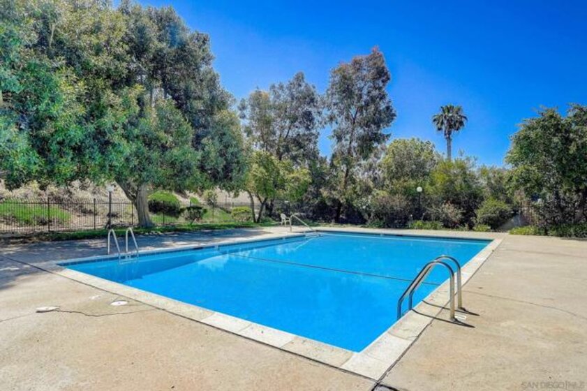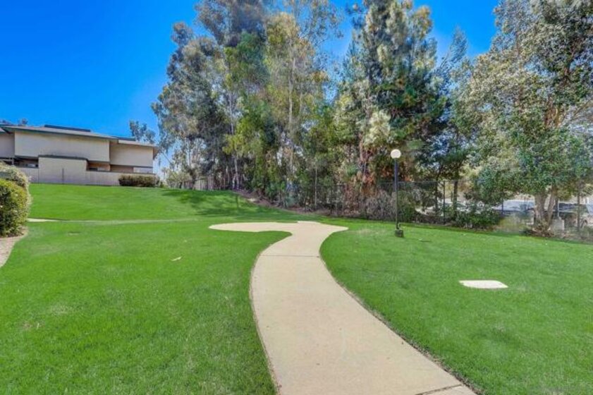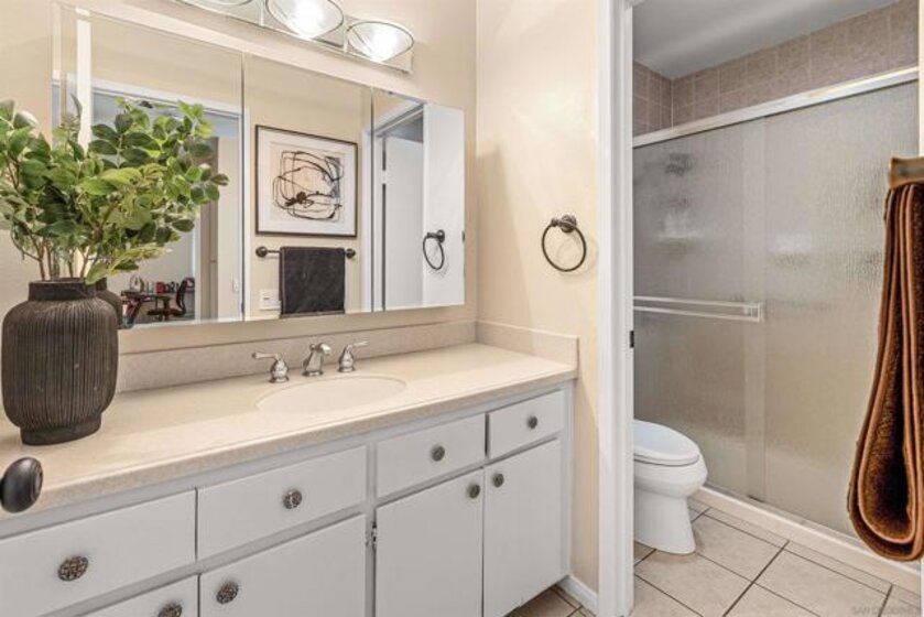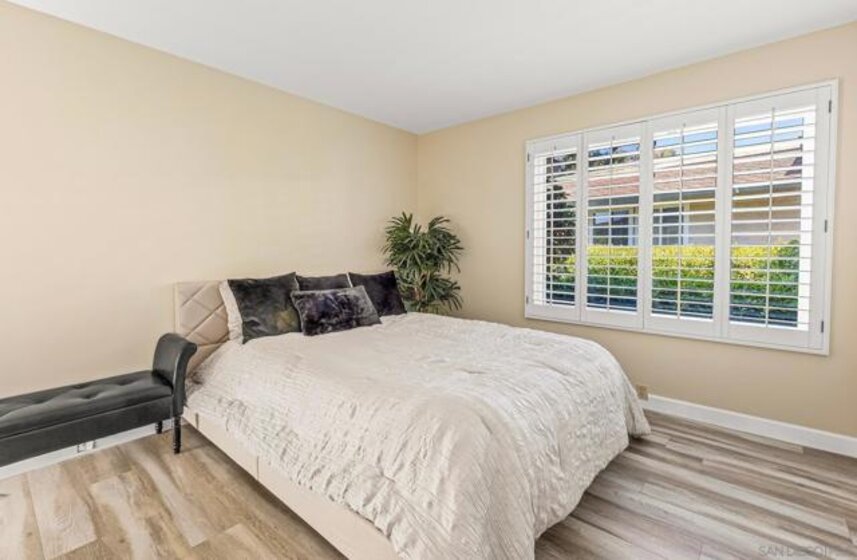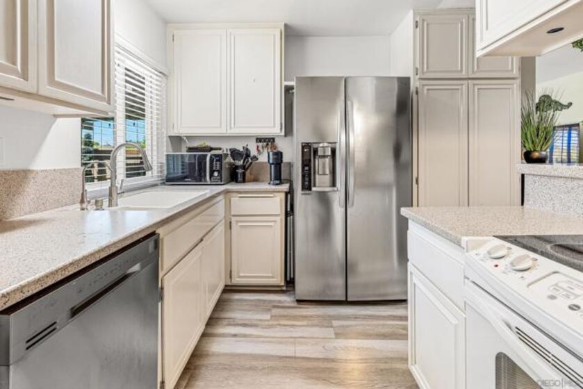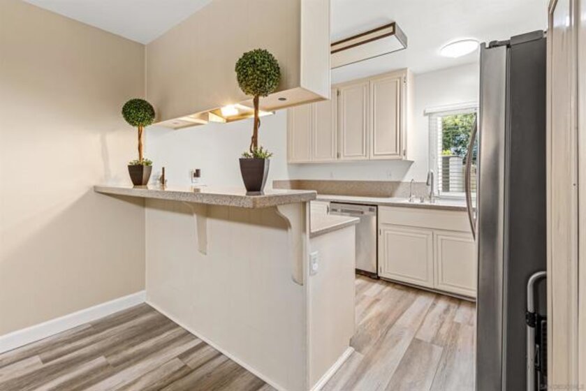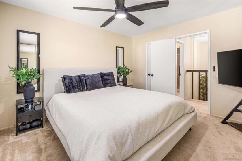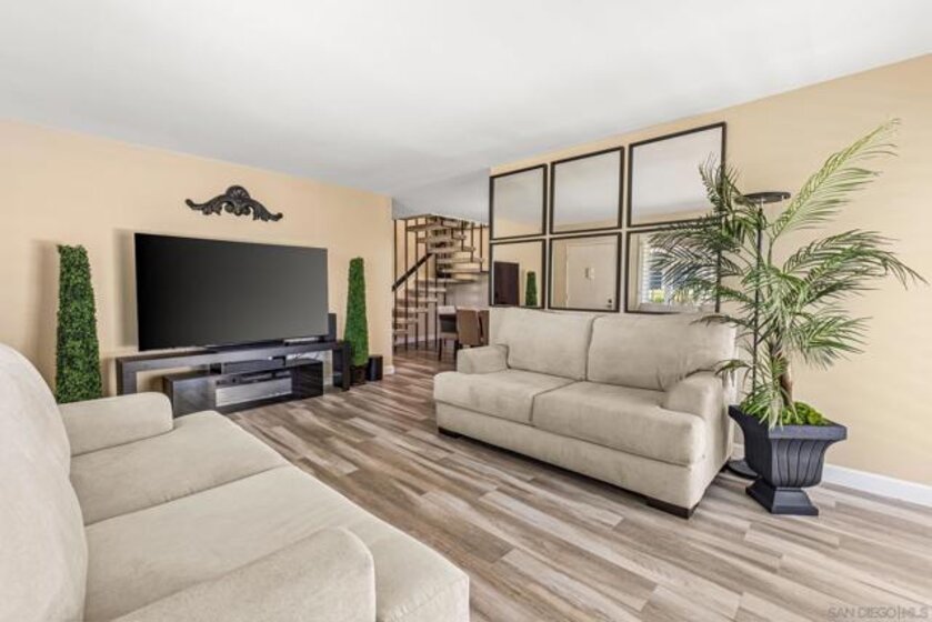 Welcome to this stunning townhome in the highly sought-after Quest Complex of Mira Mesa! Enjoy a premium, quiet location tucked away in the back corner of the community, surrounded by lush greenbelt views. Inside, the open-concept floor plan is enhanced with an A/C system, fresh interior paint, new carpeting, plantation shutters, designer lighting, and luxury vinyl plank flooring. The kitchen features crisp white cabinetry, Corian countertops, and convenient bar seating, while the spacious living room with a cozy fireplace flows seamlessly into the dining area. A downstairs bedroom and full bathroom offer added flexibility for guests or a home office. Meander outside to an expansive private patio—perfect for entertaining, relaxing, or dining al fresco—complete with a laundry closet for added convenience. Two assigned parking spots are located nearby. The community offers resort-style amenities with two swimming pools, two spas, and beautifully maintained park-like grounds. HOA dues include water, trash, and exterior landscaping. Ideally located close to freeways, Lake Miramar, schools including Miramar College, shopping, and dining—this home truly has it all!