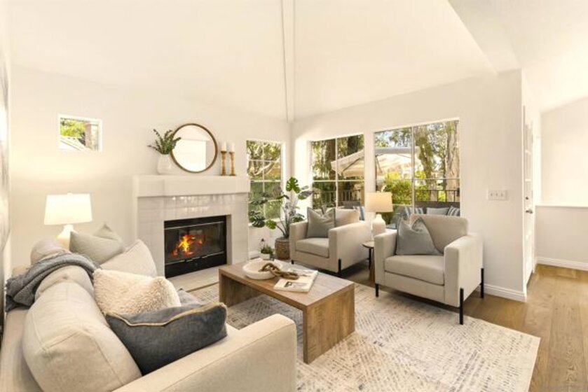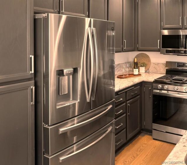 Stunning Upper-Level, 2-Bedroom, 2-Bath Condominium with a Private Corner Location! Features include a bright open floor plan, vaulted ceilings, rich engineered-wood flooring, beautiful kitchen remodel with granite counters and premium stainless steel appliances, large outdoor patio balcony, spacious bedrooms with classic wood shutters, walk-in closet, central heat and air conditioning, one-car attached garage with full-size laundry plus additional covered carport. Enjoy the beautiful Belsera community with sparkling pools, spa, recreation area with volleyball sand court, adjoining Mission Trails Park with endless hiking and biking trails and more!