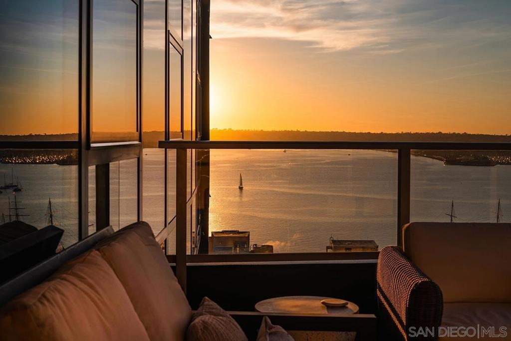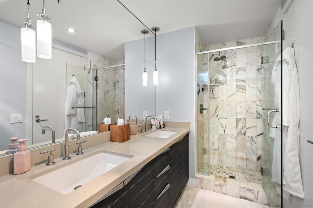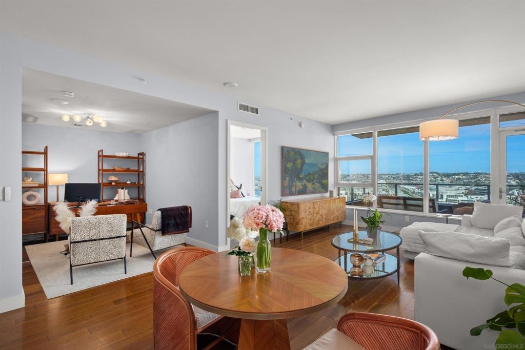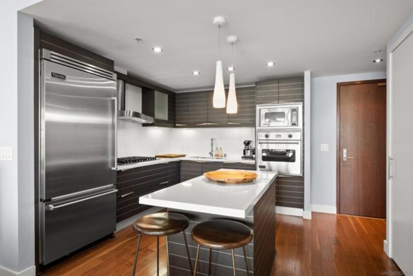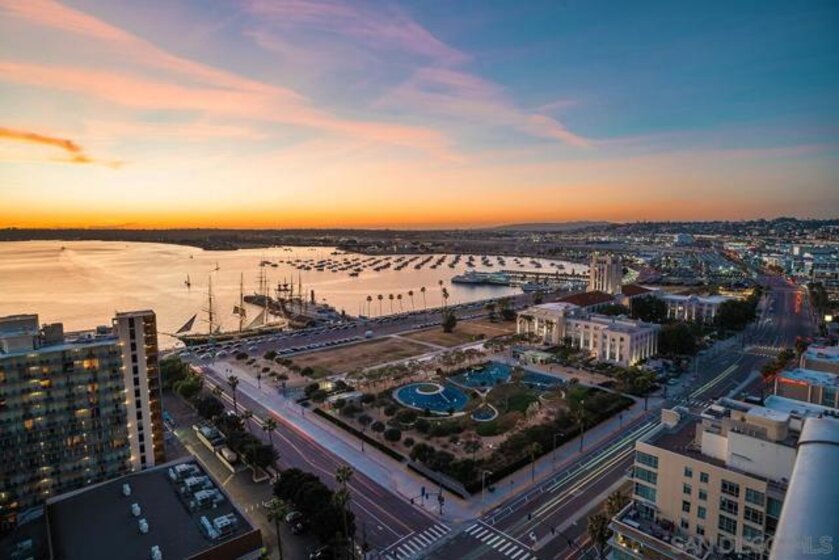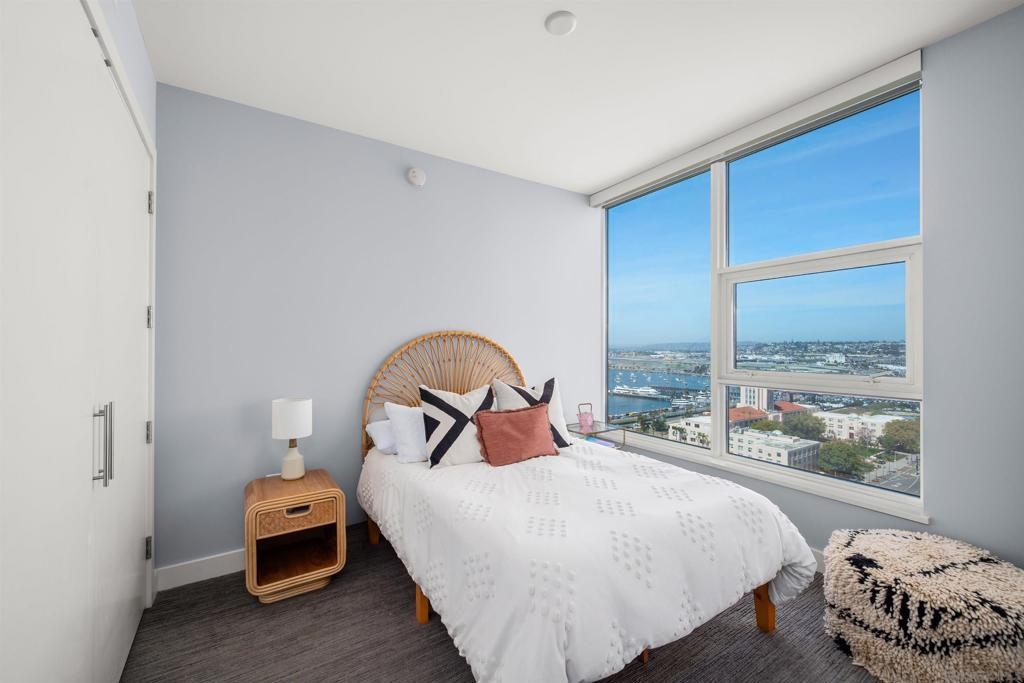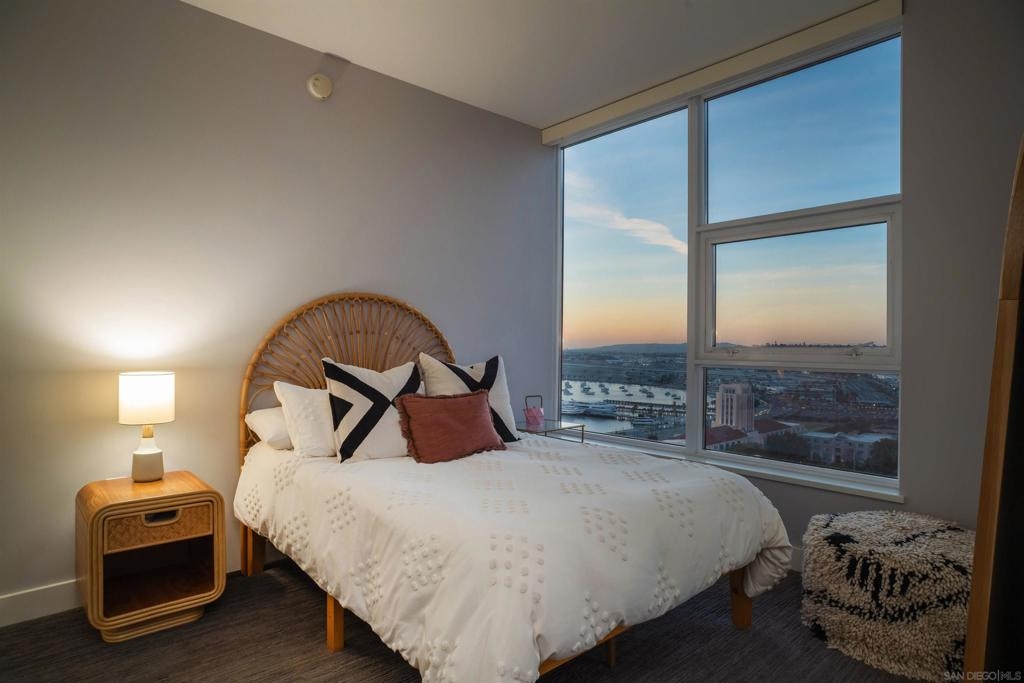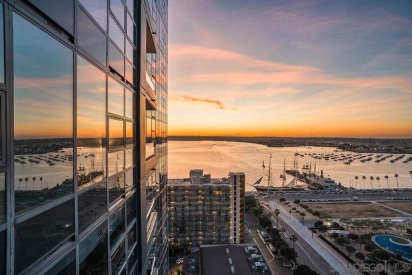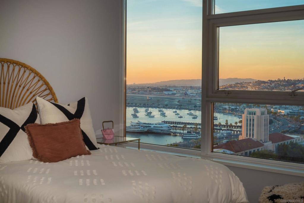 Experience elevated waterfront living at its finest in this impeccably appointed Bayside residence. Sweeping views of San Diego Bay, the harbor, and the city skyline greet you from virtually every room. The generous balcony, ready for outdoor living, captures panoramic bay views from above, with sailboats, sunsets, the Embarcadero, and Point Loma in full display beneath an endless stretch of blue sky. Inside, warm hardwood floors flow through the open-concept great room, anchored by a chef's kitchen that makes no compromises. All Viking appliances, including built-in wine refrigeration, a professional gas cooktop with stainless hood, sleek dark Snaidero Italian cabinetry with horizontal ribbing, and a quartz island with pendant lighting set the tone for a space that is equally suited to quiet mornings and dinner parties. The living and dining areas extend naturally from the kitchen, framing the skyline through floor-to-ceiling glass. Both bedrooms capture light and views with equal generosity. The primary suite offers a serene retreat, with an ensuite spa bath featuring dual vanities, a soaking tub with marble slab surround, and a separate glass-enclosed marble shower. The second bedroom, bright with windows overlooking the bay and cityscape, adapts effortlessly as a guest room, home office, or both. A second full bath with tub and a dedicated in-unit laundry closet with full-size upgraded stacked machines round out the practical comforts. Addtional features include: electronic smart shades on every window (blackout in the bedrooms, sheer sun shades in the living room) controlled by remote or voice command through the smart home system, a Nest thermostat for precision climate control, two side-by-side parking spaces with EV charger, and an extra-large storage unit. With access to Bayside's premier amenities and an address at the water's edge, this residence delivers the quintessential San Diego metropolitan lifestyle. Common areas went through an extensive renovation in 2025. Widely regarded as one of the top buildings in all of San Diego, Bayside enjoys some of the most luxurious amenities Downtown. 24-hour security, resort-style pool and spa, outdoor kitchen with BBQs, fully-equipped exercise room, sauna and steam rooms, theatre, resident lounge with billiards & full kitchen, conference room, and a unique wine lounge including an oversized wine-chiller for a unique entertainment venue. All this in addition to the coveted lifestyle amenities coastal metropolitan living offers with the Embarcadero, Waterfront Park, and Little Italy all merely steps from your door! Farmers Market and numerous bars and restaurants all nearby! PLUS: Some of the most reasonable HOA dues for a premier tower in all of Downtown San Diego.