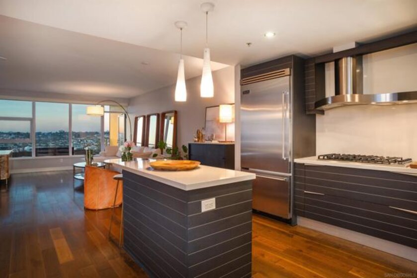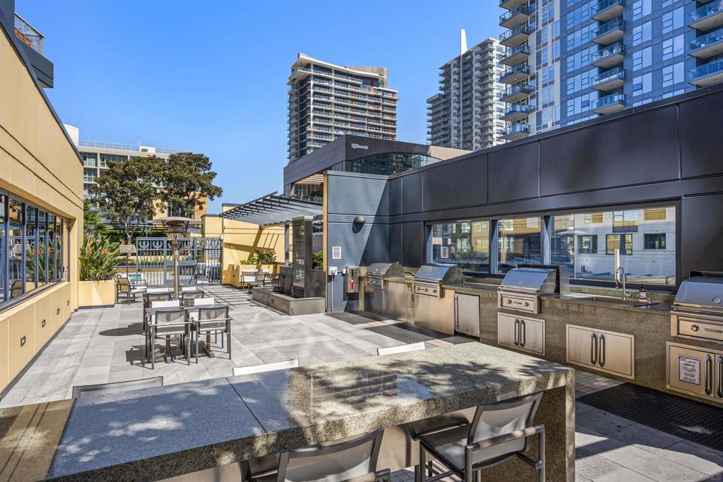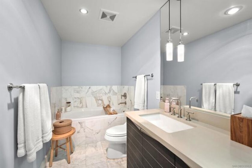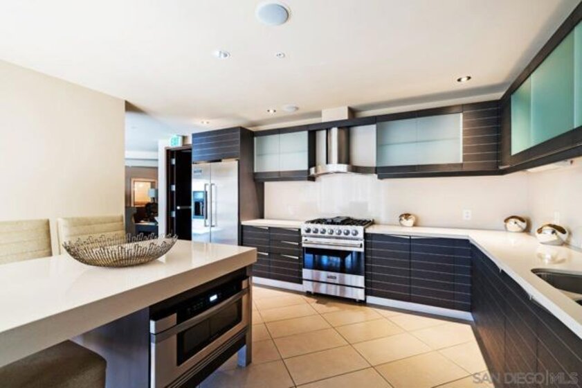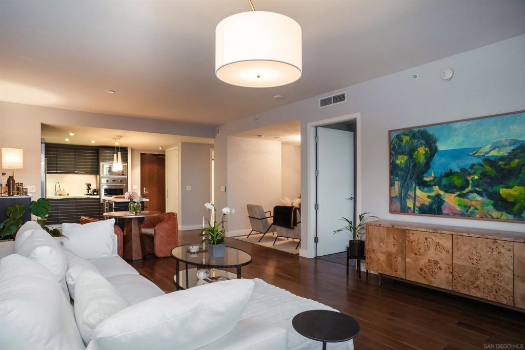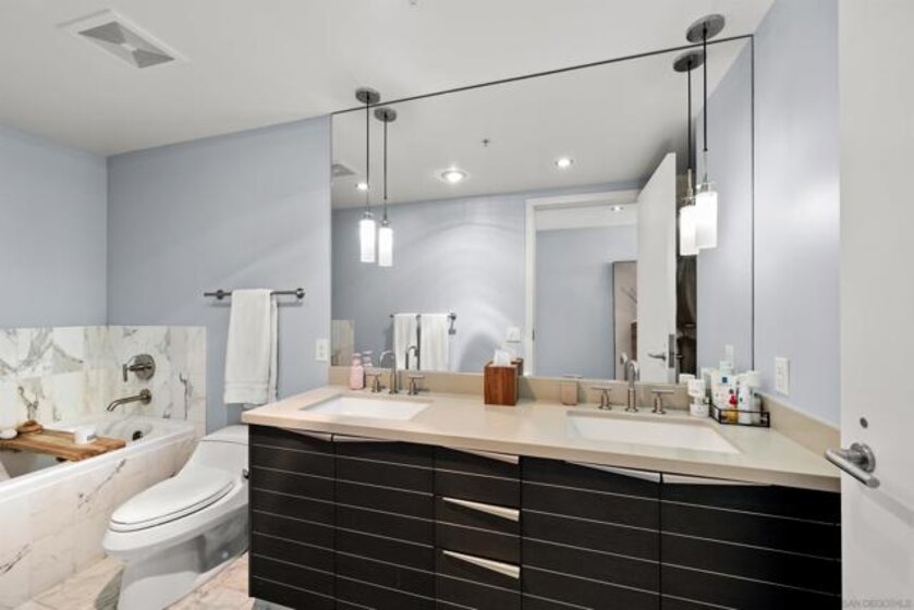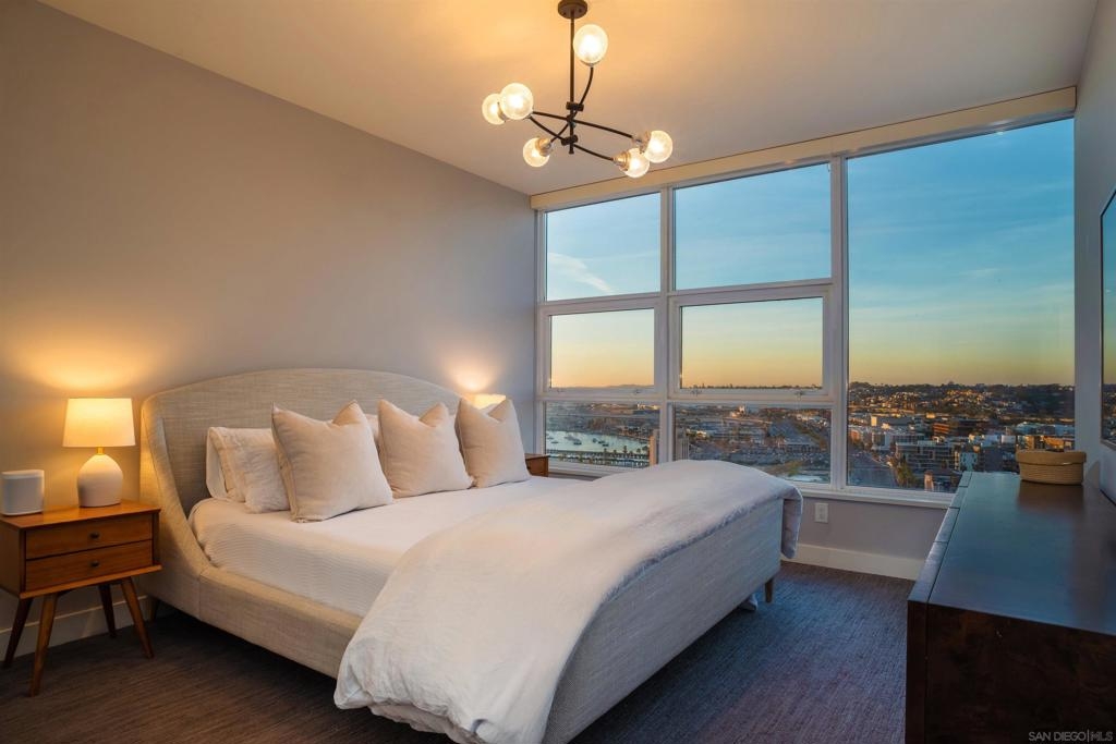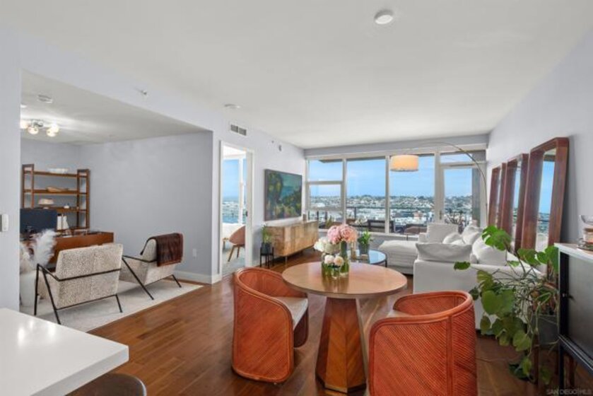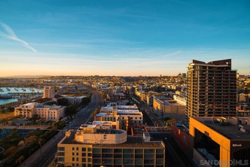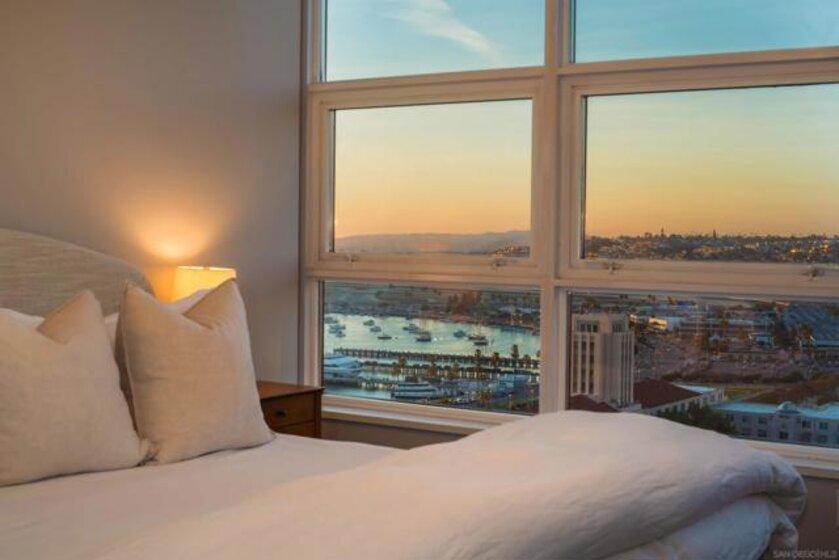 Experience elevated waterfront living at its finest in this impeccably appointed Bayside residence. Sweeping views of San Diego Bay, the harbor, and the city skyline greet you from virtually every room. The generous balcony, ready for outdoor living, captures panoramic bay views from above, with sailboats, sunsets, the Embarcadero, and Point Loma in full display beneath an endless stretch of blue sky. Inside, warm hardwood floors flow through the open-concept great room, anchored by a chef's kitchen that makes no compromises. All Viking appliances, including built-in wine refrigeration, a professional gas cooktop with stainless hood, sleek dark Snaidero Italian cabinetry with horizontal ribbing, and a quartz island with pendant lighting set the tone for a space that is equally suited to quiet mornings and dinner parties. The living and dining areas extend naturally from the kitchen, framing the skyline through floor-to-ceiling glass. Both bedrooms capture light and views with equal generosity. The primary suite offers a serene retreat, with an ensuite spa bath featuring dual vanities, a soaking tub with marble slab surround, and a separate glass-enclosed marble shower. The second bedroom, bright with windows overlooking the bay and cityscape, adapts effortlessly as a guest room, home office, or both. A second full bath with tub and a dedicated in-unit laundry closet with full-size upgraded stacked machines round out the practical comforts. Addtional features include: electronic smart shades on every window (blackout in the bedrooms, sheer sun shades in the living room) controlled by remote or voice command through the smart home system, a Nest thermostat for precision climate control, two side-by-side parking spaces with EV charger, and an extra-large storage unit. With access to Bayside's premier amenities and an address at the water's edge, this residence delivers the quintessential San Diego metropolitan lifestyle. Common areas went through an extensive renovation in 2025. Widely regarded as one of the top buildings in all of San Diego, Bayside enjoys some of the most luxurious amenities Downtown. 24-hour security, resort-style pool and spa, outdoor kitchen with BBQs, fully-equipped exercise room, sauna and steam rooms, theatre, resident lounge with billiards & full kitchen, conference room, and a unique wine lounge including an oversized wine-chiller for a unique entertainment venue. All this in addition to the coveted lifestyle amenities coastal metropolitan living offers with the Embarcadero, Waterfront Park, and Little Italy all merely steps from your door! Farmers Market and numerous bars and restaurants all nearby! PLUS: Some of the most reasonable HOA dues for a premier tower in all of Downtown San Diego.