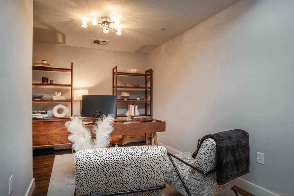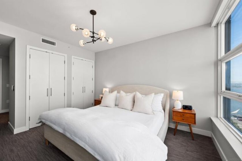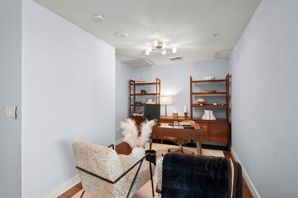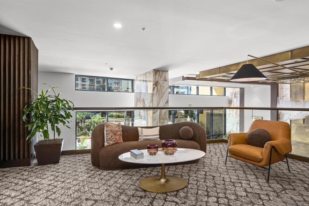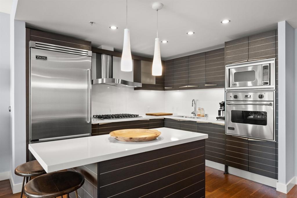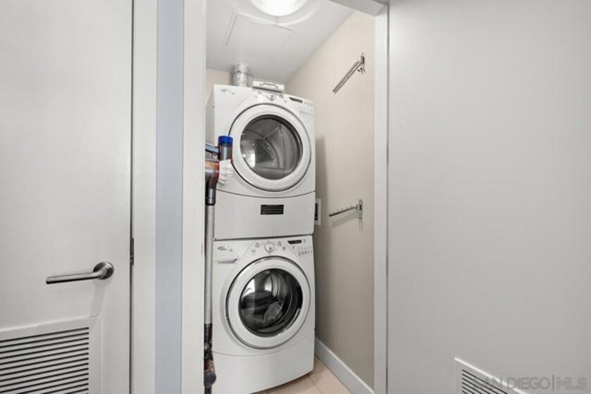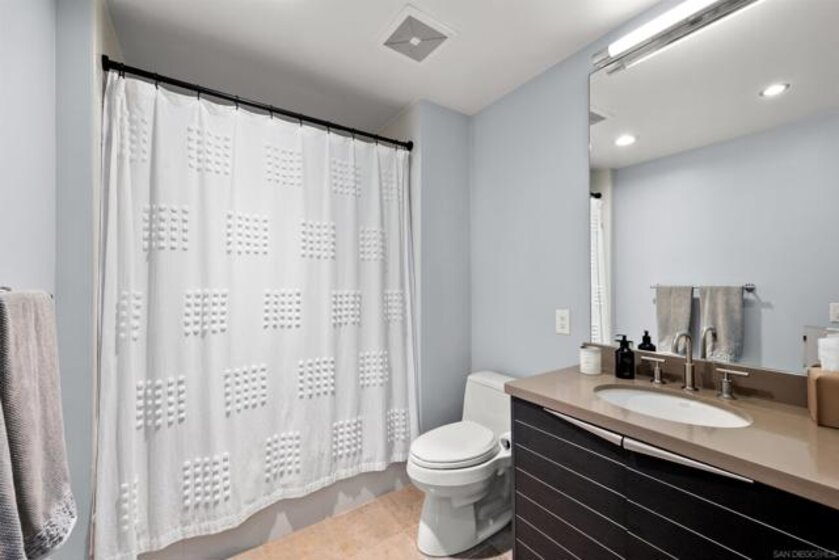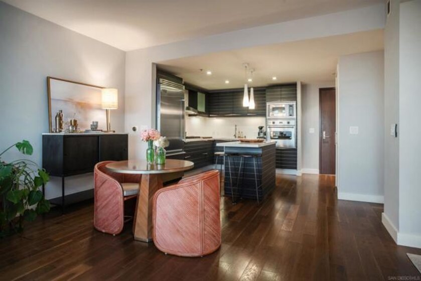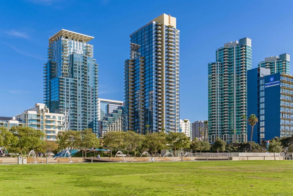 Experience elevated waterfront living at its finest in this impeccably appointed Bayside residence. Sweeping views of San Diego Bay, the harbor, and the city skyline greet you from virtually every room. The generous balcony, ready for outdoor living, captures panoramic bay views from above, with sailboats, sunsets, the Embarcadero, and Point Loma in full display beneath an endless stretch of blue sky. Inside, warm hardwood floors flow through the open-concept great room, anchored by a chef's kitchen that makes no compromises. All Viking appliances, including built-in wine refrigeration, a professional gas cooktop with stainless hood, sleek dark Snaidero Italian cabinetry with horizontal ribbing, and a quartz island with pendant lighting set the tone for a space that is equally suited to quiet mornings and dinner parties. The living and dining areas extend naturally from the kitchen, framing the skyline through floor-to-ceiling glass. Both bedrooms capture light and views with equal generosity. The primary suite offers a serene retreat, with an ensuite spa bath featuring dual vanities, a soaking tub with marble slab surround, and a separate glass-enclosed marble shower. The second bedroom, bright with windows overlooking the bay and cityscape, adapts effortlessly as a guest room, home office, or both. A second full bath with tub and a dedicated in-unit laundry closet with full-size upgraded stacked machines round out the practical comforts. Addtional features include: electronic smart shades on every window (blackout in the bedrooms, sheer sun shades in the living room) controlled by remote or voice command through the smart home system, a Nest thermostat for precision climate control, two side-by-side parking spaces with EV charger, and an extra-large storage unit. With access to Bayside's premier amenities and an address at the water's edge, this residence delivers the quintessential San Diego metropolitan lifestyle. Common areas went through an extensive renovation in 2025. Widely regarded as one of the top buildings in all of San Diego, Bayside enjoys some of the most luxurious amenities Downtown. 24-hour security, resort-style pool and spa, outdoor kitchen with BBQs, fully-equipped exercise room, sauna and steam rooms, theatre, resident lounge with billiards & full kitchen, conference room, and a unique wine lounge including an oversized wine-chiller for a unique entertainment venue. All this in addition to the coveted lifestyle amenities coastal metropolitan living offers with the Embarcadero, Waterfront Park, and Little Italy all merely steps from your door! Farmers Market and numerous bars and restaurants all nearby! PLUS: Some of the most reasonable HOA dues for a premier tower in all of Downtown San Diego.