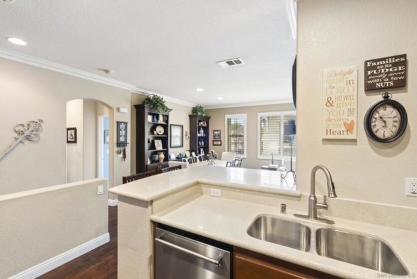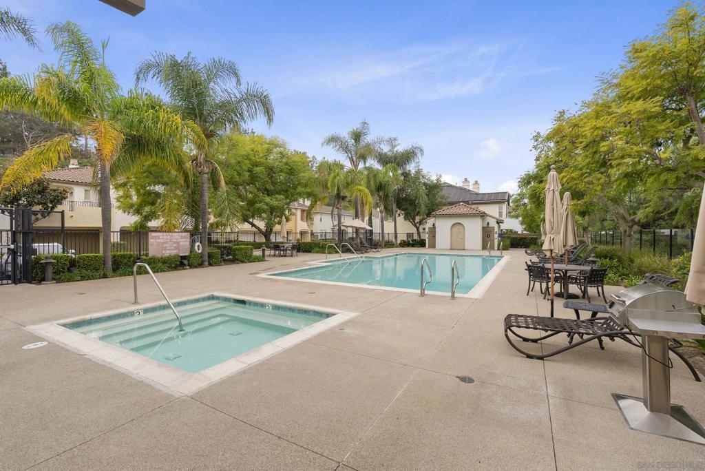 Top-floor end-unit living in the highly desirable Cypress Greens community of Carmel Mountain Ranch. Built by Shea Homes in 2008 and still owned by the original buyer, this 2-bedroom, 2-bath residence is ideally positioned above the garages with no units below and windows on three sides—delivering exceptional privacy, natural light, and a floor plan that lives more like a single-family home. With only three units per building, the setting feels quiet, open, and rarely available. (see suppl) Inside, the home offers thoughtfully upgraded living space with hand-scraped engineered hardwood flooring throughout the main living areas, bedrooms, and kitchen. The kitchen blends style and functionality with quartz countertops, stainless steel appliances, a recently installed quiet-run dishwasher and microwave, and a convenient two-seat eat-at bar. A custom built-in storage and shelving feature enhances the dining area with both character and practicality. The living room is framed by a wall of southeast-facing windows with plantation shutters, filling the space with soft morning light, while the fireplace creates a comfortable place to unwind. The private patio—one of the larger options in the community—offers direct access from both the living room and primary suite, making indoor-outdoor living easy. Additional highlights include a security system, direct-access one-car garage with overhead storage, and a second deeded parking space. Located directly across from the pool, spa, and community gathering areas, with no Mello-Roos, and close proximity to shopping, dining, top-rated schools, and freeway access, this home delivers comfort, privacy, and everyday convenience in a prime San Diego location.