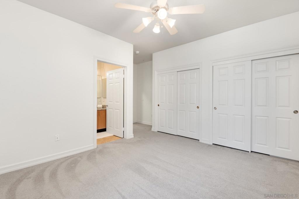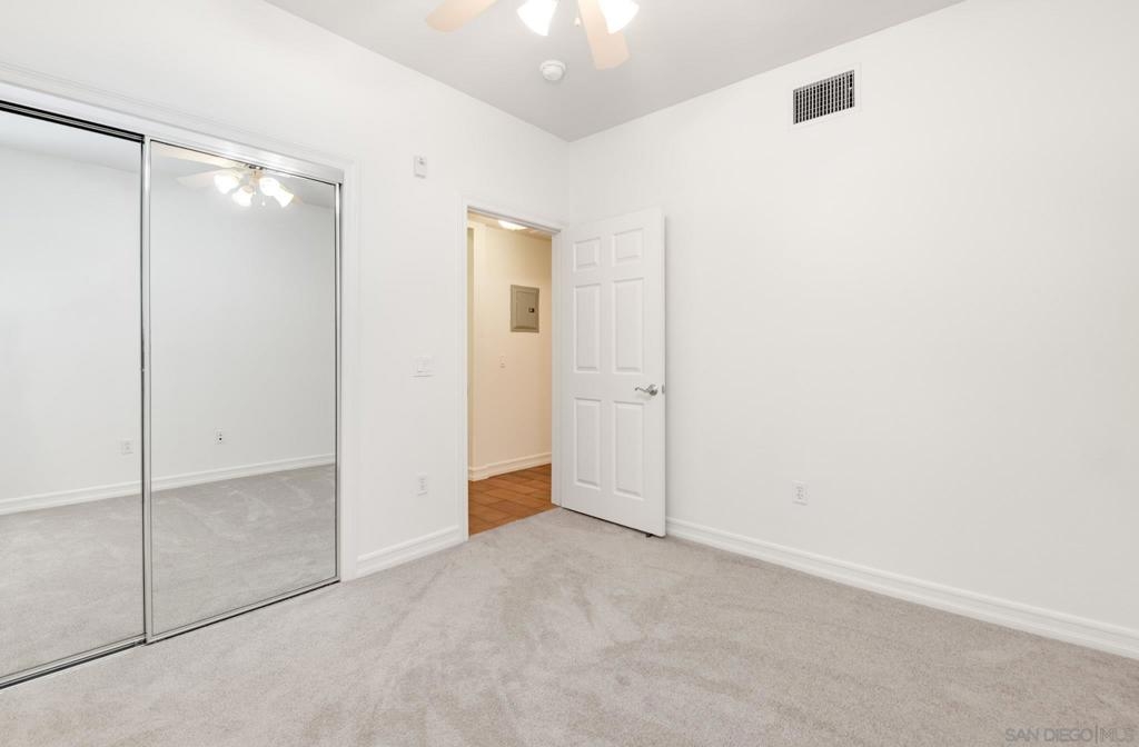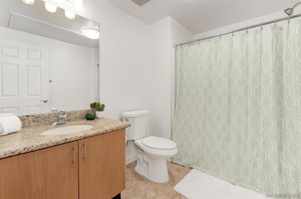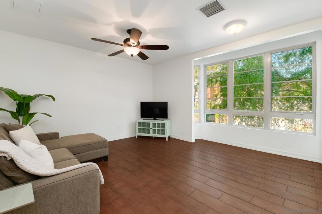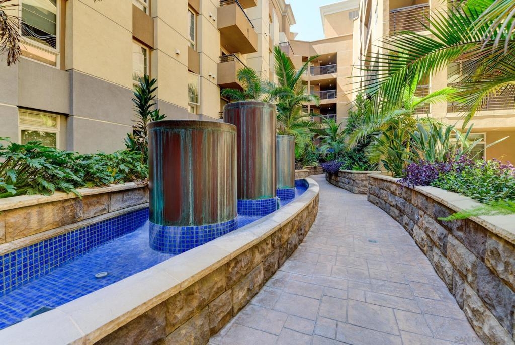 Welcome to Union Square at Broadway, a VA-approved community that combines the convenience and excitement of city living in a neighborhood-like setting. This spacious end-unit condo offers two-bedrooms and two-bathrooms in a rarely available layout with private patio area. The great room boasts expansive bay windows that look out on breathtaking mature trees. This property is located in a prime location to enjoy all Downtown has to offer, just steps to San Diego City College and within walking distance of Petco Park and the future East Village Green (Phase 1 Opening in 2025). Enjoy a kitchen that is both stylish and functional with sleek granite countertops and Whirlpool appliances, with upgraded gas range and built-in microwave. Sleek wood-look tile flooring runs throughout the kitchen, living room, and hallway, while both bedrooms have plush carpeting. The primary bedroom with ensuite features two closets and custom Closet World built-ins. The secondary bedroom features mirrored closet doors and looks out on the community’s tropical landscaping. Both bathrooms include shower/tub combos, granite countertop vanities, and upgraded modern light fixtures. Residents of Union Square enjoy access to an impressive array of amenities, including onsite management, a fully equipped gym with sauna and jacuzzi, BBQ areas, a party room, community EV charging stations, and an active social committee that hosts year-round events such as a St. Patrick’s Day party and an End of Summer social. Don’t miss this rare opportunity to own in one of San Diego’s most desirable downtown communities. This unit has two dedicated tandem parking spaces with storage cage in the community’s secure gated parking garage. Other unit features include in-unit laundry, central heating and air conditioning and ceiling fans in both bedrooms and living room. This condo is in the ideal location for commuters and those who utilize public transit, providing easy access to the Trolley and freeways. The area also plays host to frequent community events like the East Village Block Party, Oktoberfest, Taste of East Village, and the annual Tree Lighting and Holiday Market. Enjoy top rated restaurants right in your neighborhood, including Calle, Cowboy Star, Lola 55, IZOLA, Bar Kamon, Sovereign Thai, Bottle Rocket and more.