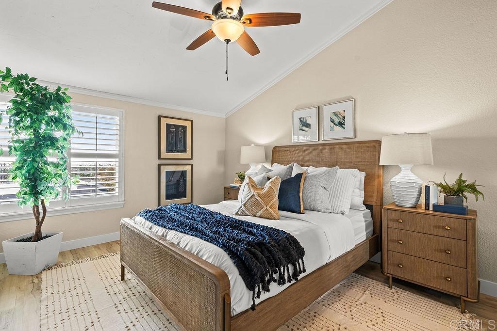 Live in the gem of PB, on Diamond St! Enjoy a true resort lifestyle at The Plaza. This top floor condo is located in one of Pacific Beach’s most sought-after communities and offers panoramic views of the Pacific Ocean, Mission Bay and Sea World fireworks! The sunny south facing layout brings in beautiful natural light, and the extra high ceilings create an open, spacious feel. The home has been tastefully updated with brand new vinyl flooring, Ceiling fans, fresh paint, a lovely kitchen featuring shaker style cabinetry, quartz counters with a waterfall edge, stainless steel appliances, stone backsplash tiles in a tasteful herringbone pattern and recessed lighting. The refreshed bathroom includes quartz countertops along with new fixtures and finishes for a clean, modern look. The bedroom is generously sized with two closets and includes plantation shutters and crown molding. The living room features a cozy electric fireplace, vaulted ceiling and access to a large balcony where you can take in the panoramic views and enjoy the ocean breezes. Unit comes with a dedicated covered parking space in the secured garage. The Plaza offers an impressive collection of amenities including 4 heated pools, hot tubs, a fitness center, tennis / pickleball courts, a billiards room, library, movie room, lounge spaces, BBQ areas, a tropical lagoon, and a 24-hour on-site security. The community is also FHA and VA approved. Living in Pacific Beach means having endless options close by, from casual beachside cafés to upscale dining, lively nightlife, local boutiques, surf shops, and convenient grocery stores like Vons and Trader Joe’s. Outdoor lovers will appreciate nearby parks and recreational areas such as Kate Sessions Park, known for its sweeping city and bay views. The area also hosts regular community events and local farmers markets, adding to its vibrant coastal charm.