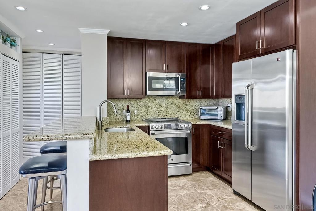 Spacious, ground-level 2 BR/2BA end unit condo in The Plaza resort-style community. Enjoy the ocean breeze: West facing and only 1.5 miles from the beach. Features open kitchen/dining area, recessed lighting, and stainless steel appliances. Complex features clubhouse, movie theater, billiards room, lagoon, swimming pools/spas, BBQ grills, and tennis courts. Located in the heart of Pacific Beach, close to shopping, restaurants, and entertainment. Two assigned garage parking spaces. VA/FHA approved. Complex Features: ,,,,,,,,, Sewer: Sewer Connected Topography: LL