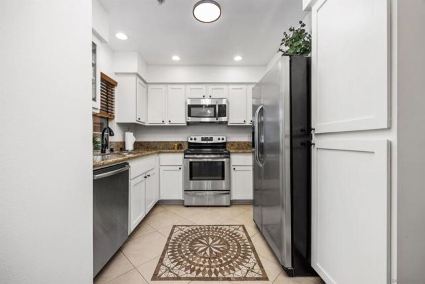 Approximately 716 square feet, this one-bedroom, one-bathroom top floor condominium features a spacious and charming layout with abundant natural light and inviting architectural details. The home boasts dark bamboo flooring throughout the living areas and primary suite, complemented by custom mosaic ceramic tile in the kitchen and tile in the bathroom. The bright and cheerful interior is enhanced by ample cabinetry, stainless steel appliances and a cozy fireplace, creating a warm and welcoming atmosphere. The primary suite offers a large walk-in closet with built-ins, providing excellent storage space. The bathroom is similarly spacious, with upgraded lighting and fixtures. In unit laundry for convenience. The home's exterior showcases lush landscaping, a spacious balcony with scenic views of the greenbelt and mature trees, offering a private and serene retreat. The community amenities are resort-style, featuring pools, spas, a fitness center, tennis courts, pickleball, a recreational room and a clubhouse near a picturesque pond. The gated community also provides assigned parking in front of the building, as well as plenty of guest parking, ensuring convenience for residents. Ideally located with easy freeway access and close to shopping, this condominium offers a comfortable and well-appointed living experience. Acclaimed Poway Unified Schools.