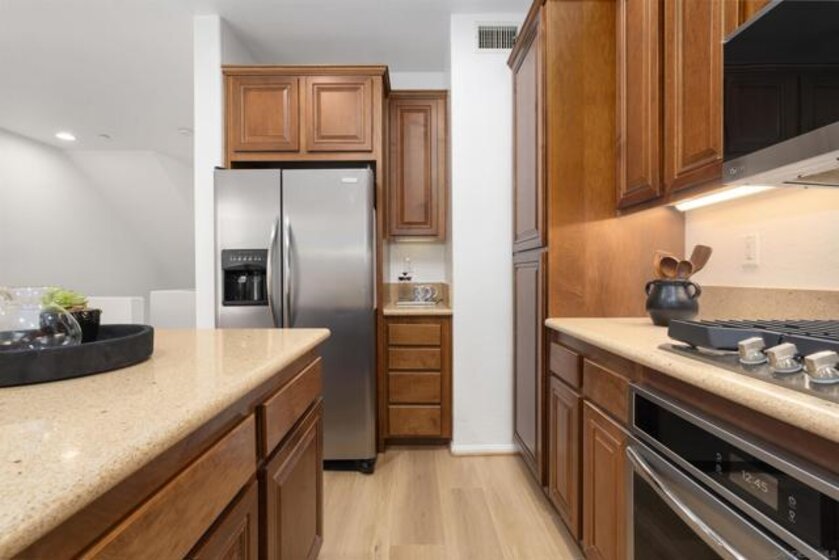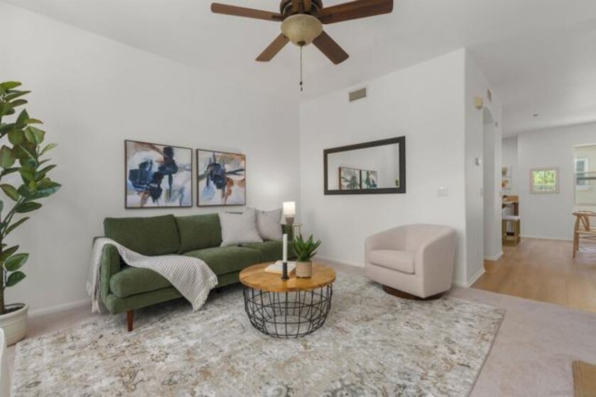 Come experience the best of Mission Valley-living in this beautiful, rarely available Terraces townhome at Escala! Tucked in this amenity-rich community is our latest offering, a gorgeous tri-level townhome that is turn-key and waiting for its new owner. Upon entry, you'll immediately notice the handy flex-space room that could be an office, den, or bedroom. Fresh paint and carpet greet you throughout as you move upstairs to the main living area where you'll find your generously sized chef's kitchen with its island, updated appliances, and plentiful cabinet & counter space. Your adjacent dining room and living area feature lovely natural light and a cozy fireplace for memorable meals and fun movie nights. You'll appreciate the new LVP flooring throughout this area, and the convenient in-unit laundry and half bath. Move upstairs to two more bedrooms and baths in a user-friendly split floor plan, assuring privacy in each room. If you don't know Escala, you've been missing out! With its gorgeous pool area, walking trails, dog park, clubhouse and more, this community features some of the best amenities available, all in an uber-convenient location close to Fashion Valley mall, Hazard Center, USD, freeways, and more. Come see before it's gone!