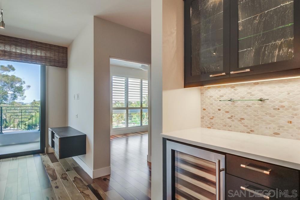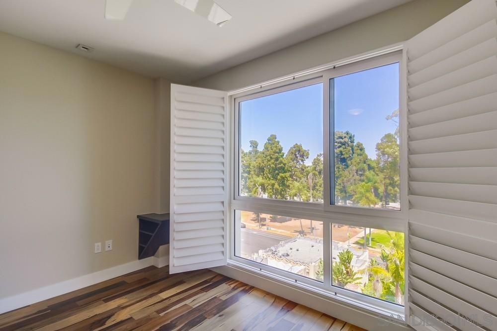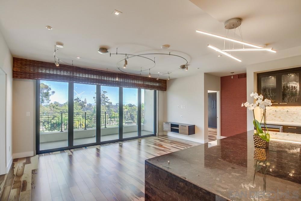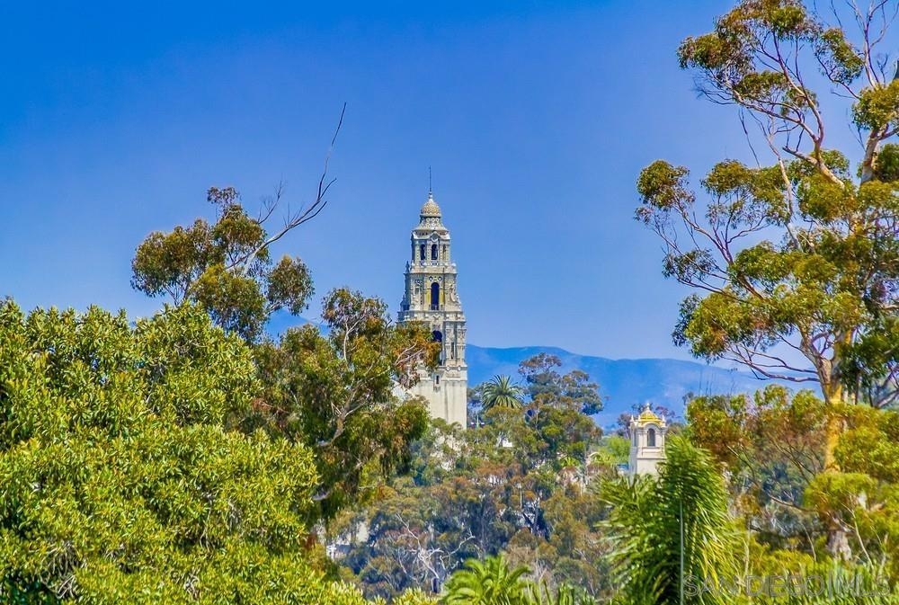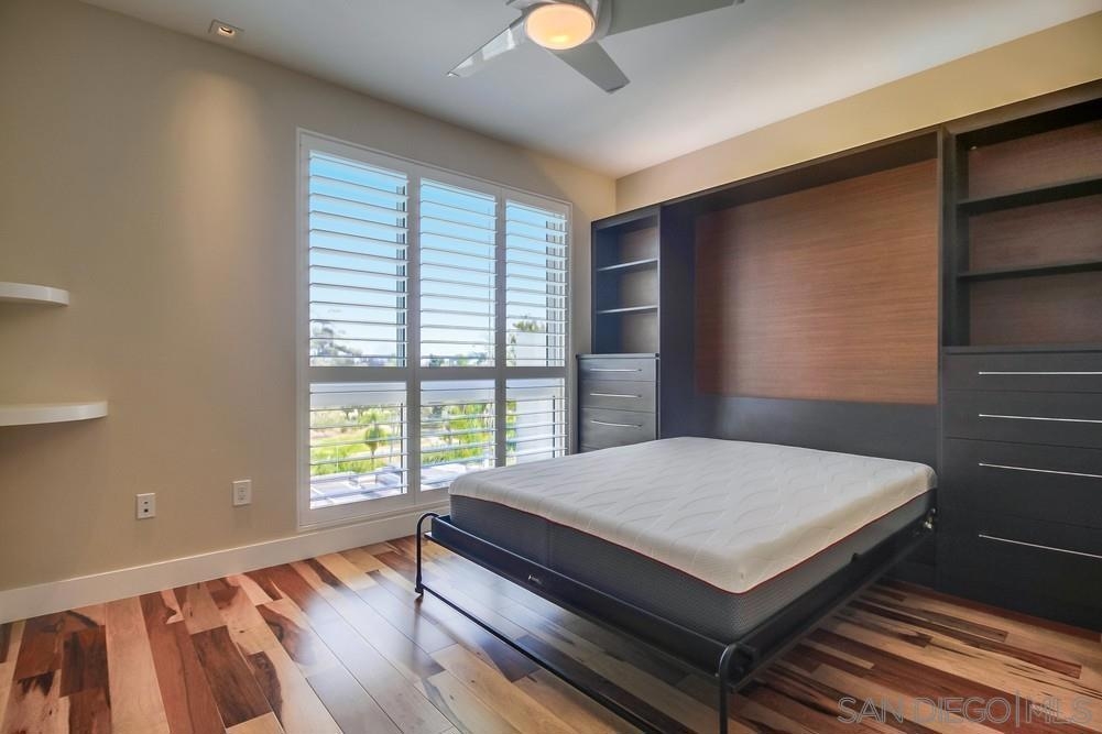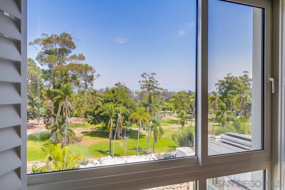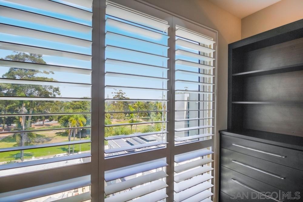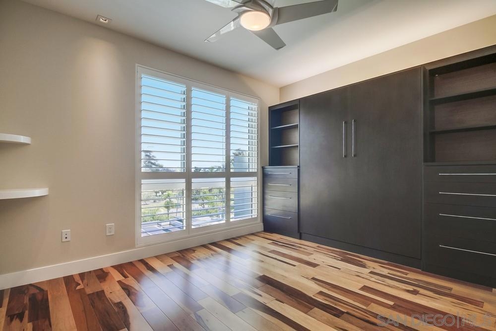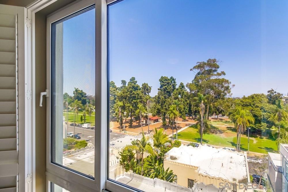Perfection on the Park: perfect in every detail. East facing on 6th floor with tree top views of Balboa Park and CA tower from all living areas and balcony. This home was design by a former custom home builder whose attention to detail is amazing. Extensive upgrades include pecan hardwood floors, kitchen island has granite with waterfall edge, extensive custom lighting throughout, custom designed built-in wine cooler with cabinets, extended banks of kitchen cabinets, primary bedroom built-ins: bookshelves and bedside tables widened to support CA King bed, custom backsplash in both bathrooms – sink and shower, CA Closet built-ins in Primary closet and guest closet, 4 inch shutters in both bedrooms, valence and two automatic screens (bug and solar) at accordion door, CA Closet Murphy bed in second bedroom, custom wallpaper at entry and accent wall, and EV charger.
