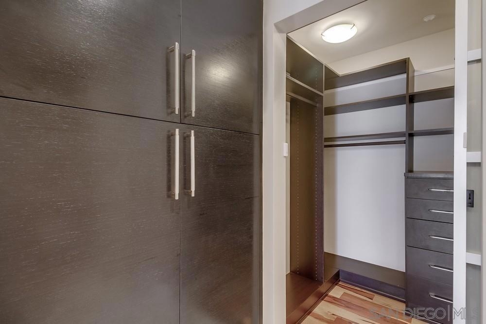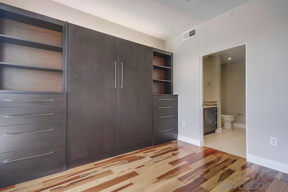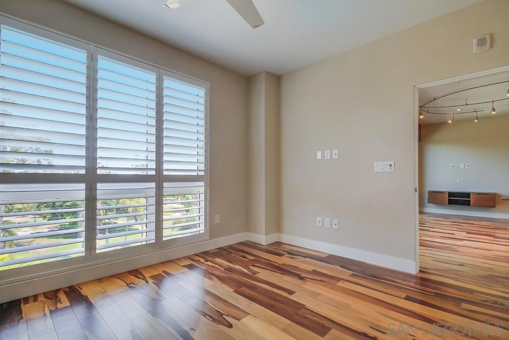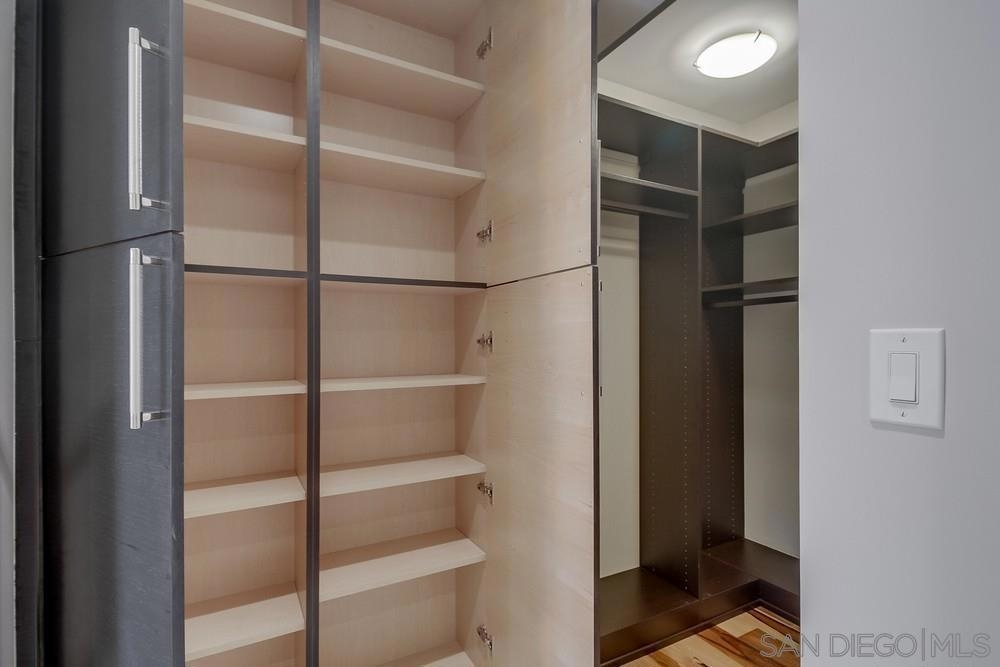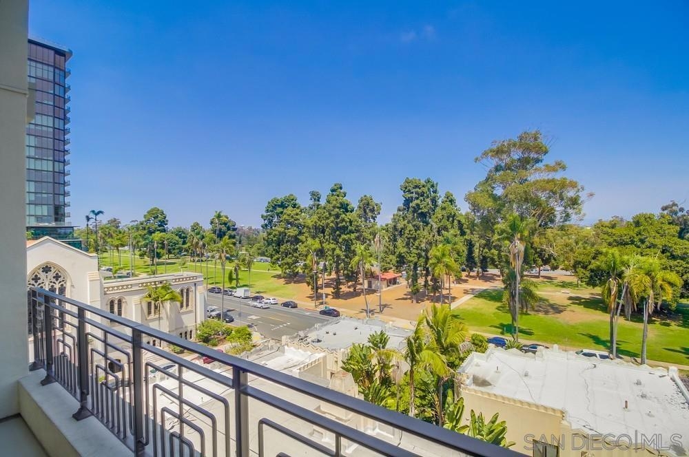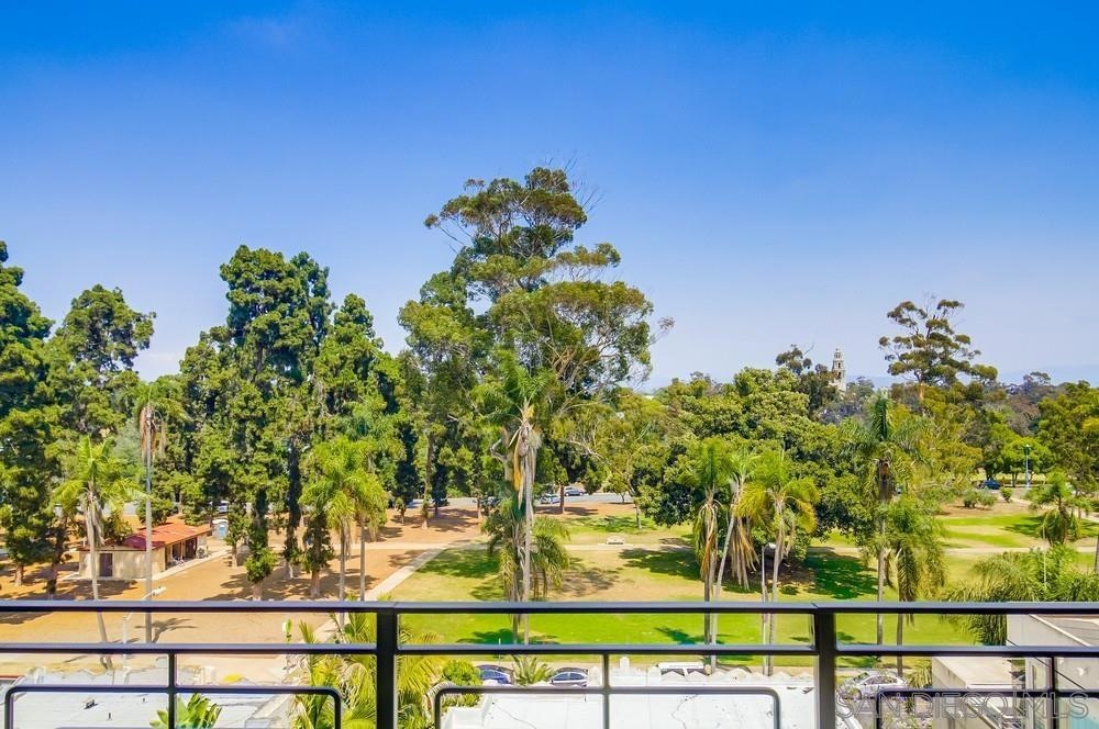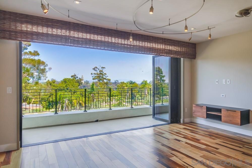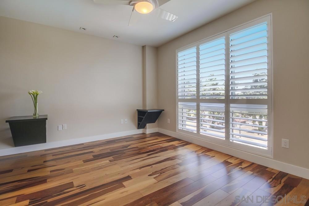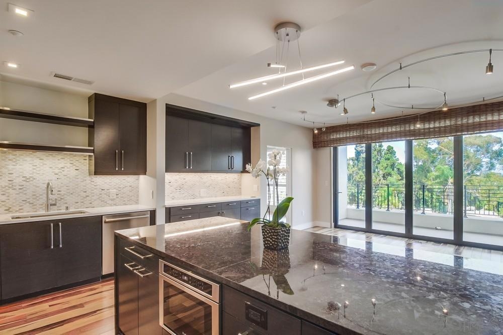 Perfection on the Park: perfect in every detail. East facing on 6th floor with tree top views of Balboa Park and CA tower from all living areas and balcony. This home was design by a former custom home builder whose attention to detail is amazing. Extensive upgrades include pecan hardwood floors, kitchen island has granite with waterfall edge, extensive custom lighting throughout, custom designed built-in wine cooler with cabinets, extended banks of kitchen cabinets, primary bedroom built-ins: bookshelves and bedside tables widened to support CA King bed, custom backsplash in both bathrooms – sink and shower, CA Closet built-ins in Primary closet and guest closet, 4 inch shutters in both bedrooms, valence and two automatic screens (bug and solar) at accordion door, CA Closet Murphy bed in second bedroom, custom wallpaper at entry and accent wall, and EV charger.