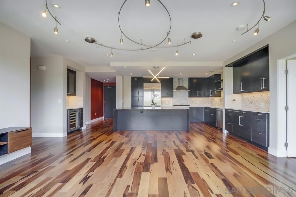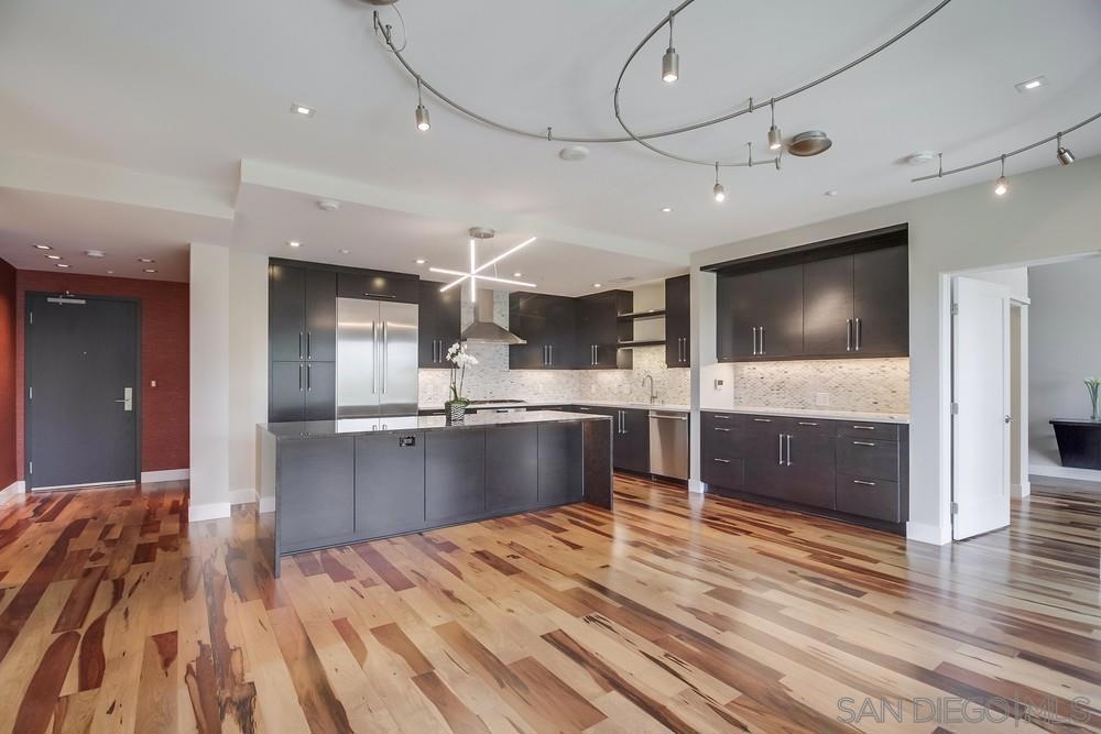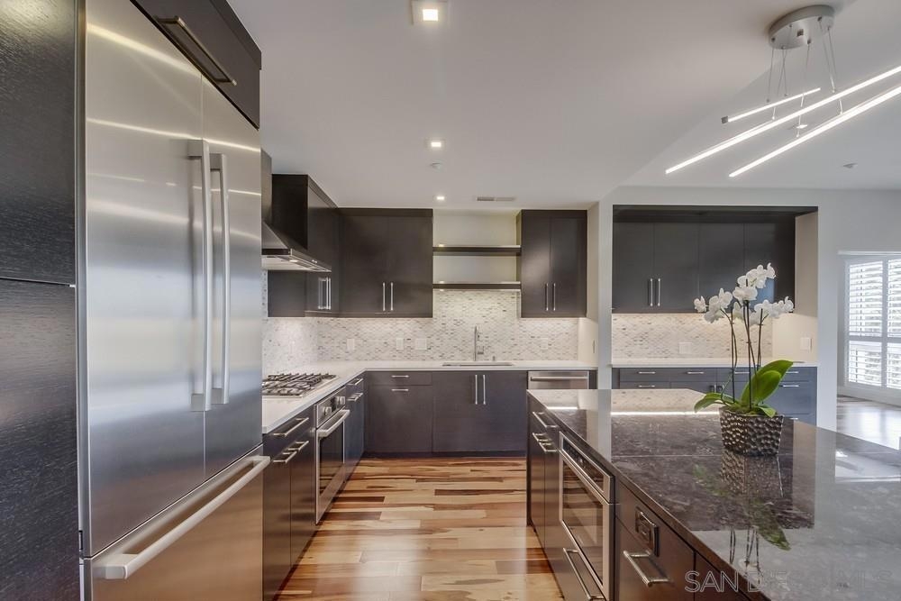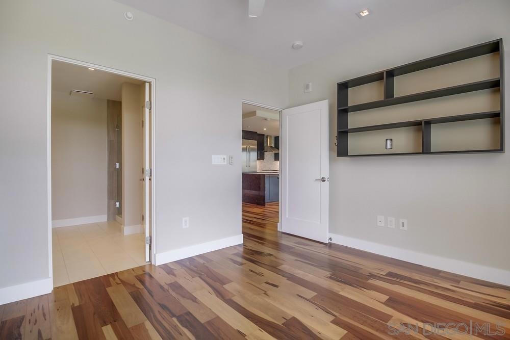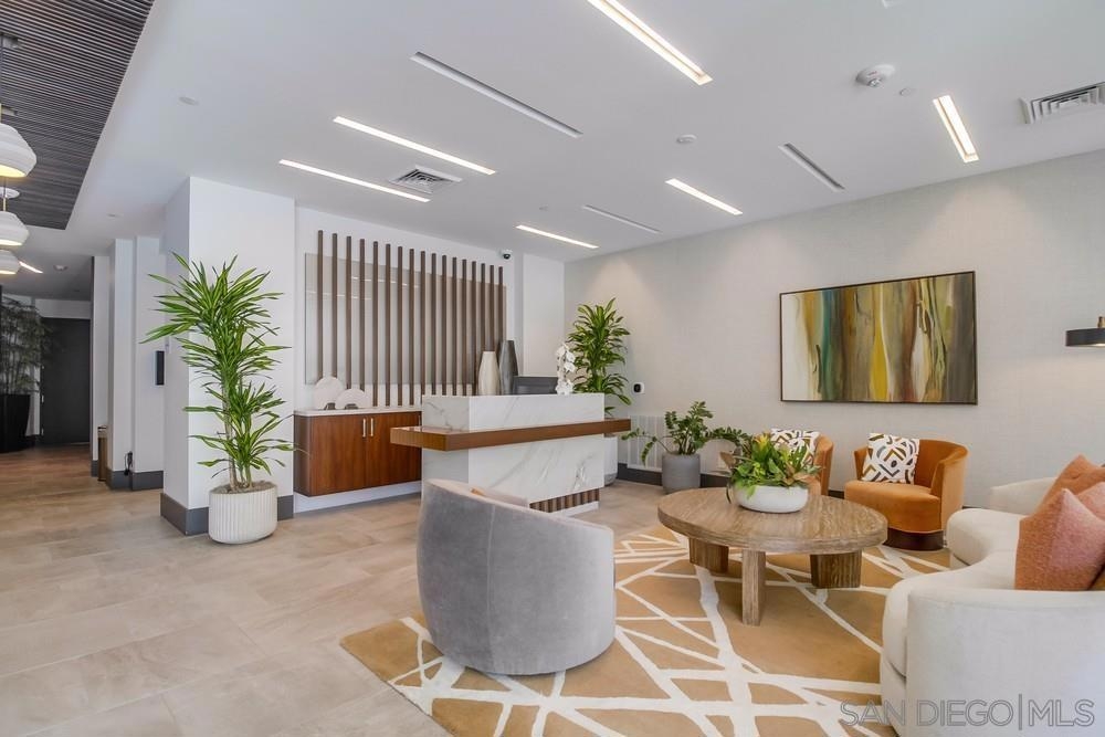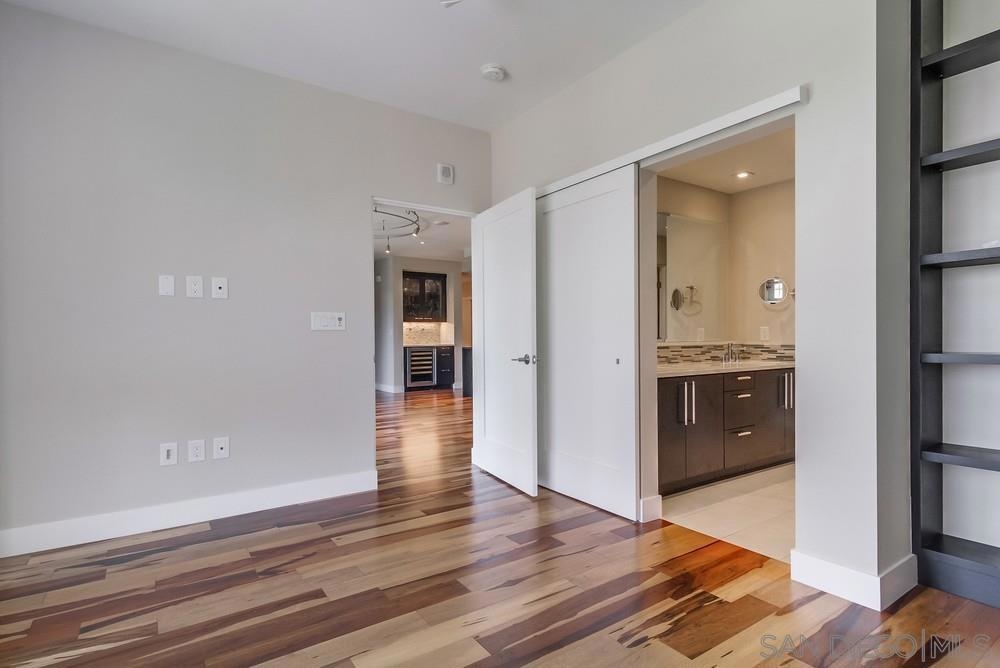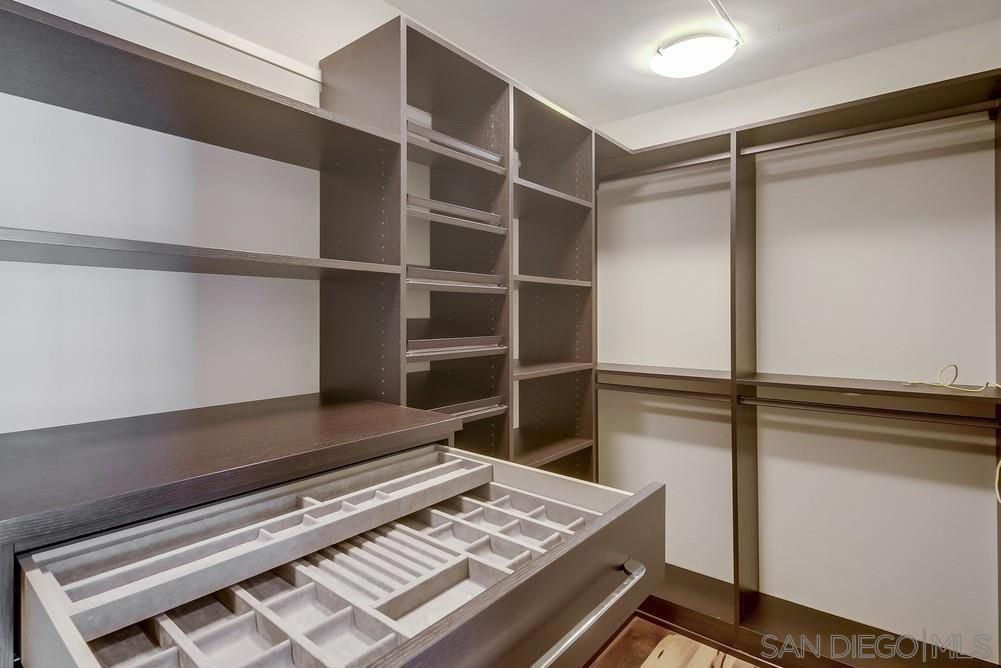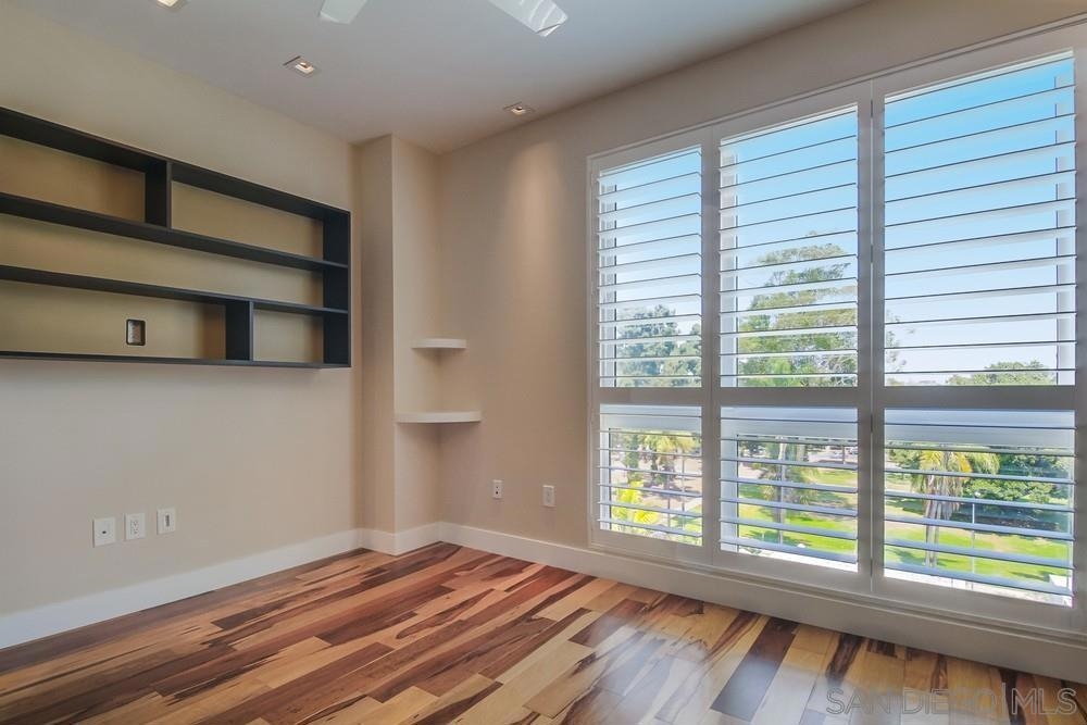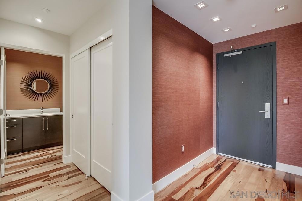 Perfection on the Park: perfect in every detail. East facing on 6th floor with tree top views of Balboa Park and CA tower from all living areas and balcony. This home was design by a former custom home builder whose attention to detail is amazing. Extensive upgrades include pecan hardwood floors, kitchen island has granite with waterfall edge, extensive custom lighting throughout, custom designed built-in wine cooler with cabinets, extended banks of kitchen cabinets, primary bedroom built-ins: bookshelves and bedside tables widened to support CA King bed, custom backsplash in both bathrooms – sink and shower, CA Closet built-ins in Primary closet and guest closet, 4 inch shutters in both bedrooms, valence and two automatic screens (bug and solar) at accordion door, CA Closet Murphy bed in second bedroom, custom wallpaper at entry and accent wall, and EV charger.