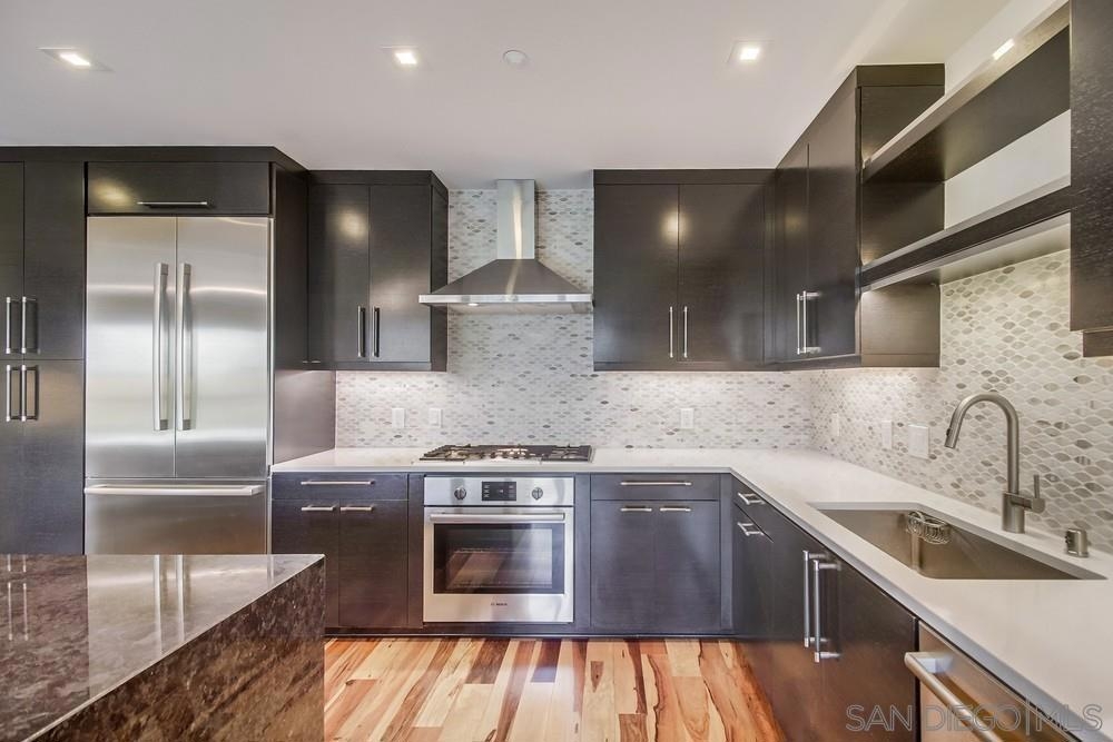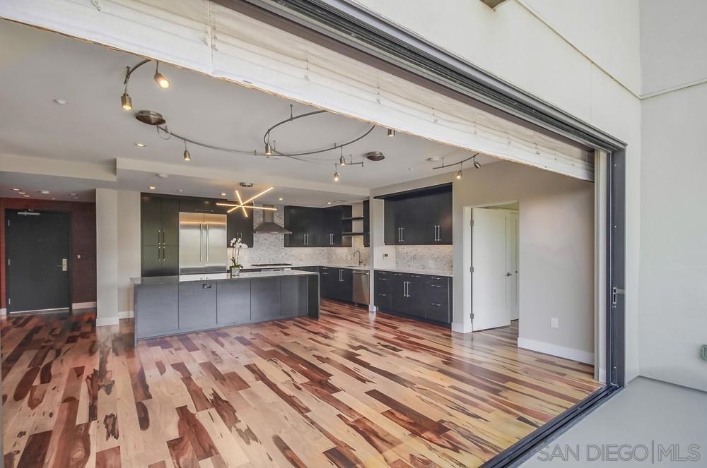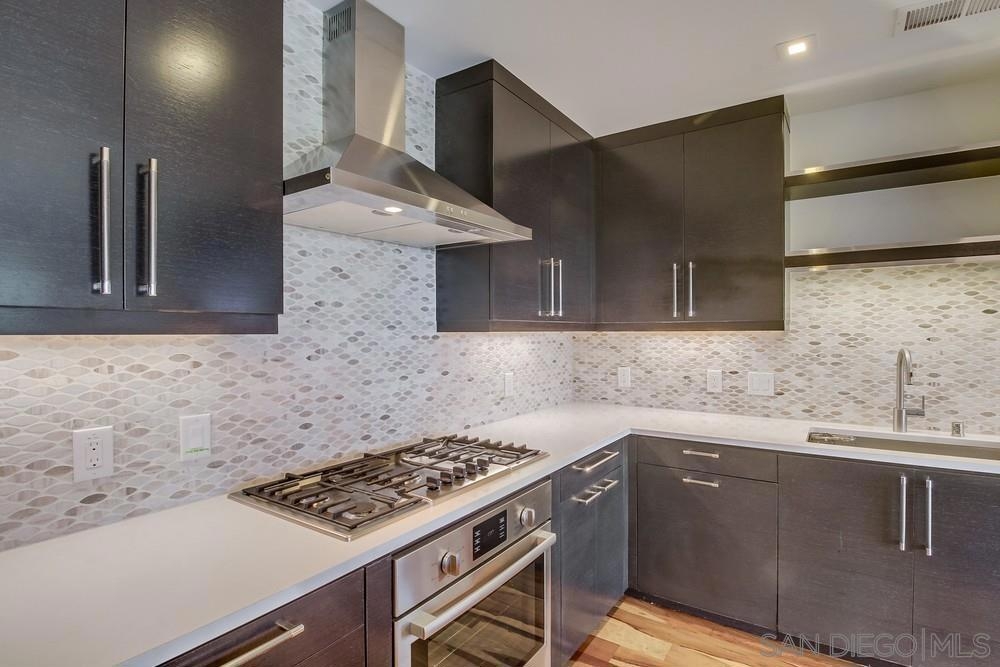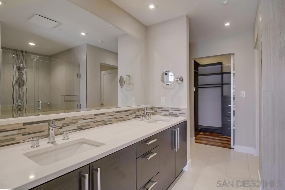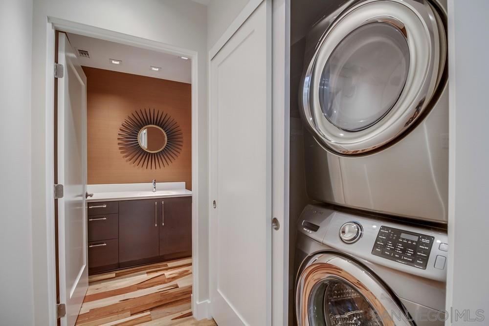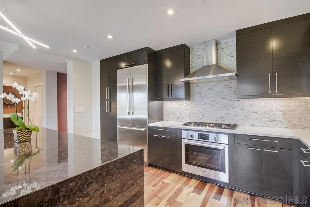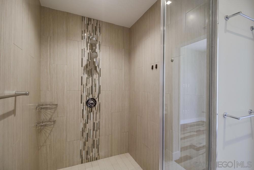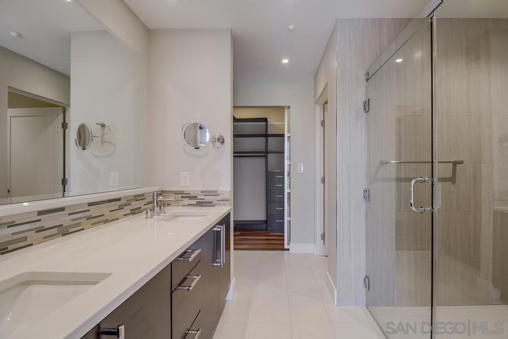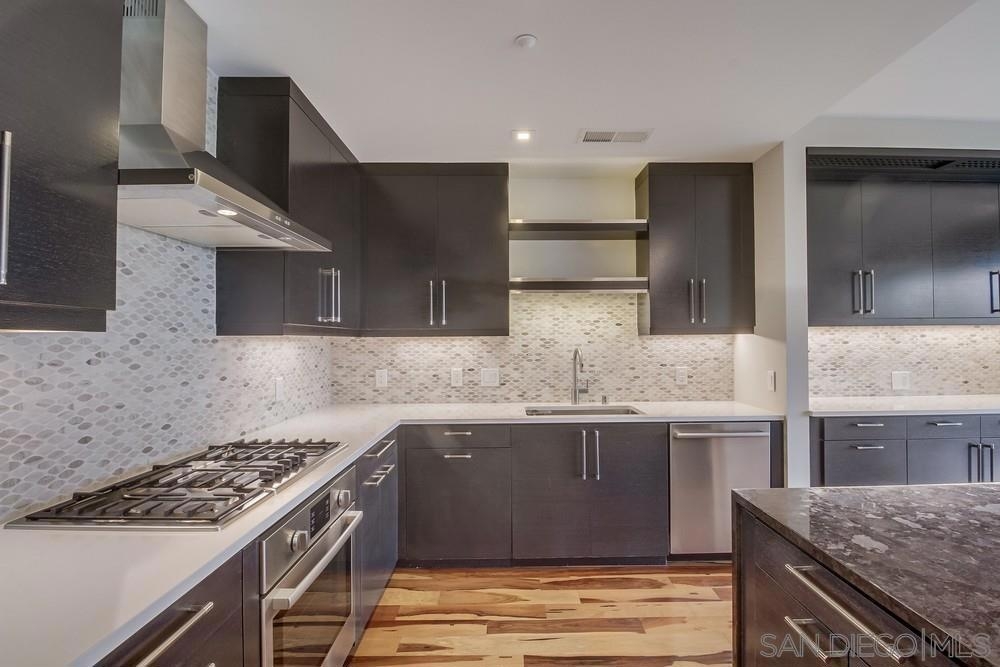 Perfection on the Park: perfect in every detail. East facing on 6th floor with tree top views of Balboa Park and CA tower from all living areas and balcony. This home was design by a former custom home builder whose attention to detail is amazing. Extensive upgrades include pecan hardwood floors, kitchen island has granite with waterfall edge, extensive custom lighting throughout, custom designed built-in wine cooler with cabinets, extended banks of kitchen cabinets, primary bedroom built-ins: bookshelves and bedside tables widened to support CA King bed, custom backsplash in both bathrooms – sink and shower, CA Closet built-ins in Primary closet and guest closet, 4 inch shutters in both bedrooms, valence and two automatic screens (bug and solar) at accordion door, CA Closet Murphy bed in second bedroom, custom wallpaper at entry and accent wall, and EV charger.