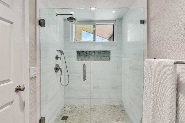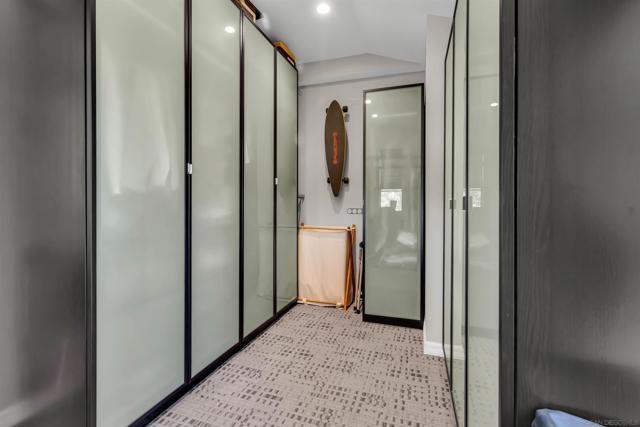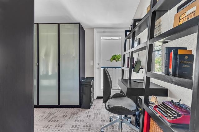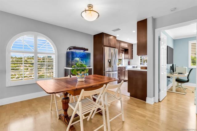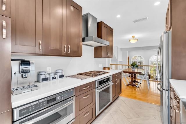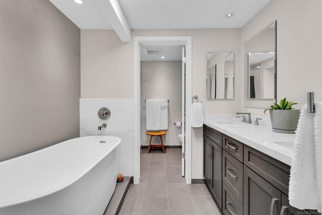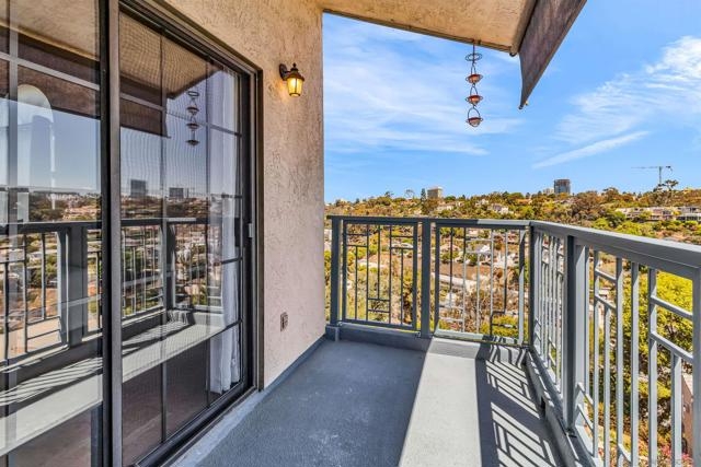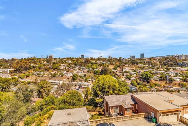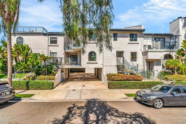 Stunningly updated Mission Hills townhome that offers a rare combination of modern upgrades, energy efficiency, and exceptional outdoor living. The home showcases dramatic vaulted ceilings, arched windows, and a flowing floor plan that connects the remodeled kitchen, dining area, and living room. The living room opens to a large, private terrace with sweeping views—an ideal setting for entertaining or relaxing. The primary suite is a true retreat with vaulted ceilings, a spa-inspired bathroom, and two private balconies that capture natural light and neighborhood charm. Upgrades include a remodeled kitchen with KitchenCraft cabinetry, Thermador appliances, and a gas stove, plus a luxurious primary bathroom with a freestanding tub, custom shower, and dual vanities. A deck conversion created a spacious walk-in closet, while another was reimagined as a private office with maple cabinetry. Energy efficiency is unmatched with fully owned solar installed in 2024—16 Panasonic panels with a 25-year warranty—keeping the average annual power bill around $600 while charging two electric cars and running A/C in the summer. The roof was replaced in 2021, and a rare two-car garage provides convenience and additional storage. The $525 monthly HOA covers water, trash, recycling, gardening, roof maintenance, high-speed internet, and exterior building upkeep. Perfectly located just minutes from downtown, the airport, Balboa Park, and Mission Hills’ charming shops and dining, this home blends sustainability, style, and an unbeatable location.