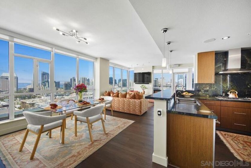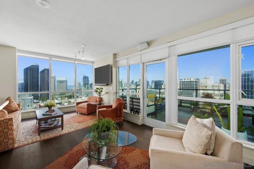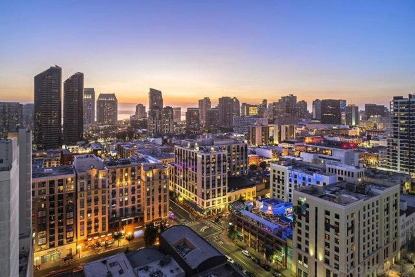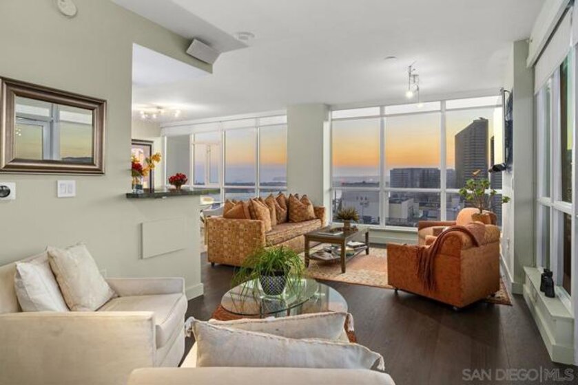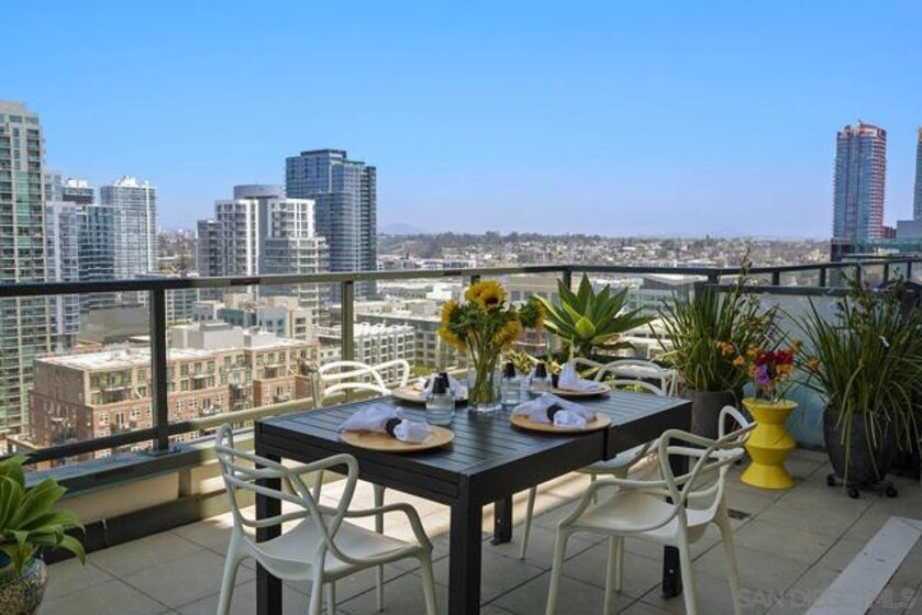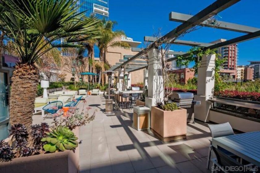 The epitome of Downtown living! Footsteps to the convention center, Gaslamp Quarter, restaurants, and Petco Park is realized in this extraordinary northwest corner penthouse residence on the 21st floor of The Legend with a nearly 400 SQ FT ROOFTOP TERRACE! Stunning views span to the bay, ocean, and city skyline. Boasting a highly desirable floor plan with 2 separated bedrooms for enhanced privacy. 2 side-by-side parking spaces plus a motorcycle space (owners have parked 3 cars in the spaces), 1 storage room and 1 storage cage! Complete with recently installed wood floors, upgraded lighting, ceiling fans, pre-wired for surround sound, and a stainless/granite kitchen with Sub-Zero refrigerator, you will love where you live. Quite possibly the best unit in the entire building with the combination of the views and roof deck – enjoy Petco Park events from ‘Club Legend’ but then retreat to the quietest corner of the building for some rest and relaxation! Dynamic views are framed by expansive windows in this fabulous residence at the Legend. An entertainer’s dream, you will love the space and functionality offered in this condo. Delight in a spacious kitchen with stainless steel appliances, granite counters including an eat-at bar, a convenient pantry closet, Sub-Zero refrigerator, and desirable gas range. Retreat to the primary bedroom boasting a generous walk-in closet with custom organizers. The primary en-suite bath features a dual vanity with upgraded granite counters, a walk-in shower, plus a Toto Washlet. Complete with additional storage and 2 side-by-side parking spaces plus a 3rd space for a motorcycle, this is an idyllic Downtown dwelling. The Legend is the only residential high-rise to be built inside the gates of our Major League Ballpark and the only residential tower to be built on the three-acre Park at the Park! This iconic building overlooking the Padres Ballpark will be treasured for generations with historic detailing preserved by Bosa to create a world-class residential tower. Enjoy a premium central location only steps away from the Gaslamp Quarter and Marina District for convenient access to endless shopping and dining options. The Legend’s amenities include a second-floor rooftop deck looking out over Park at the Park complete with pool and spa, a fully-equipped fitness room, rooftop garden, barbecue area, steam, sauna and changing rooms. Your guests and clients will also love 'Club Legend' located on the seventh floor, complete with a huge deck overlooking the ballpark and an outdoor fireplace lounge. An elegant courtyard entrance, creating a private enclave approaching the lobby provides a fitting and impressive sense of arrival for residents and their guests. The concierge service and 24-hour security add a sense of belonging while an ambiance of refinement and contemporary sophistication is apparent throughout the building.Builder's brochure indicated 1587 sqft, assessor's record indicates 1439 sqft.