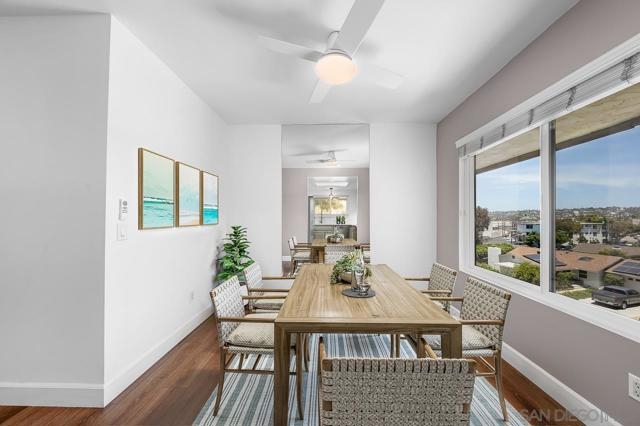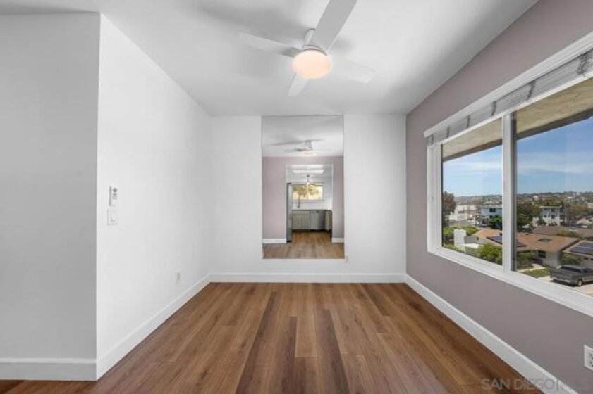 Top floor, end unit condo just steps from the bay and within walking distance to vibrant restaurants! Offering the perfect blend of style, comfort, and convenience. Step inside to find a open floor plan featuring spacious living and dining areas. The modern kitchen boasts new quartz countertops and stainless steel appliances. Additional highlights include freshly painted walls and ceilings, new vinyl plank flooring and baseboards, and newer dual pane windows! Corner unit adds additional window and natural light with views to Mount Soledad!. The primary bedroom has a peek-a-boo view of Mission Bay and Seaworld fireworks! Two parking spaces await, one covered and one uncovered, with an elevator for easy access to your new home. Located just minutes from shopping, dining, public transportation, and major freeways makes this a very desirable location!