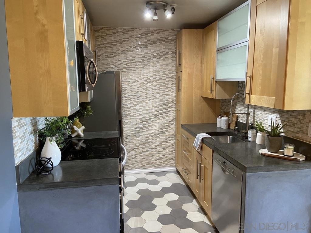 Impeccable, bright, airy, spacious condo with fantastic views in a perfect location close to everything in Pacific Beach! Bedrooms on either side of the open concept living area. Hardwood & custom tile floors throughout- all just refinished. Modern kitchen, new stainless appliances. Huge closets with custom ELFA organizers. Enjoy morning coffee or evening wine from your private balcony. Nothing left to upgrade- move right in and live the quintessential SoCal beach life! Equipment: Fire Sprinklers,Garage Door Opener, Range/Oven Other Fees: 0 Sewer: Public Sewer Topography: GSL