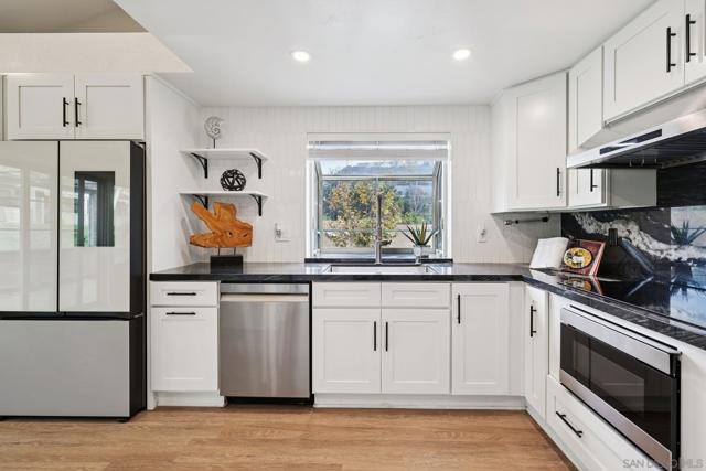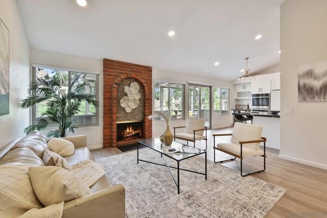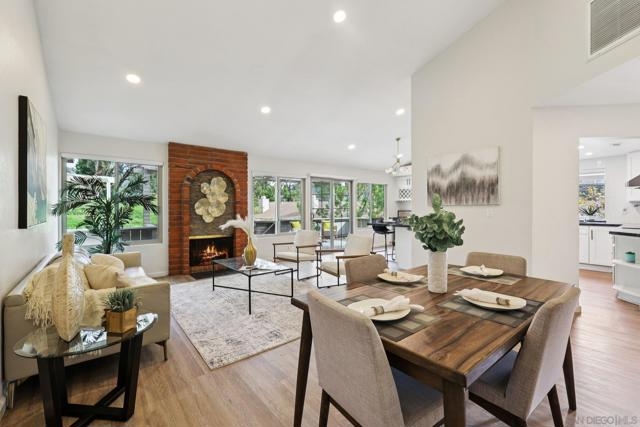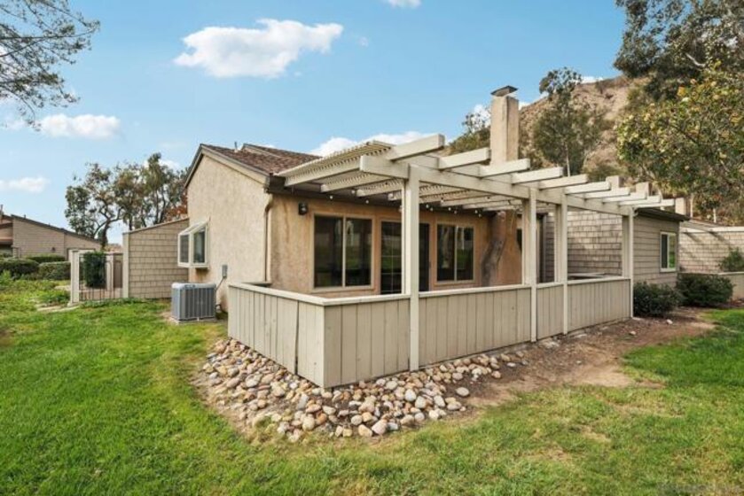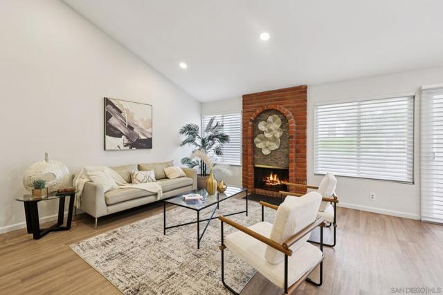 RARE CORNER UNIT SINGLE STORY HOME IN SMOKE TREE COMMUNITY * BEAUTIFULLY UPGRADED * MOUNTAIN AND SDSU VIEW * PAID OFF 15 PANEL SOLAR SYSTEM EV READY * 3 PATIOS AREA * 2 CAR GARAGE! Welcome to this rare single-story corner unit in the highly desirable Smoke Tree community, offering privacy, style, and effortless indoor-outdoor living. This beautifully updated three-bedroom, two-bath home features three separate patio areas, perfect for relaxing, gardening, or entertaining while enjoying a park-like setting with open mountain and SDSU views. The house is equipped with a paid-off 15-panel Baker Electric solar system and an EV-ready outlet, ensuring low energy costs and high convenience. Step inside to a bright, open layout with vaulted ceilings, recessed LED lighting, and custom motorized LEVOLOR window treatments in the living room. The living room features a cozy fireplace and seamless flow to the large patio with amazing views. The kitchen is a true showstopper, designed for the home chef, with a large center island, white shaker cabinetry, luxurious natural quartzite countertops, deep stainless steel sink, pull-out storage, and high-end stainless steel smart appliances, including a touchscreen LG refrigerator, induction cooktop, wine fridge, double ovens, and built-in microwave. The primary suite offers its own private patio, a walk-in closet, a barn-style door entry to the bathroom, a beautifully upgraded double sink vanity, and a soaking tub/shower combination. The secondary bathroom has been thoughtfully designed with custom finishes, imported fixtures, gold finishing, stunning wallpaper, and a walk-in glass shower with custom tile and a high-glass door. Additional features include newer windows, central HVAC with newer ductwork and insulation, a whole-house fan, a Nest smart thermostat, a Ring doorbell, upgraded doors with bronze hardware, and three ceiling fans. The attached two-car garage features laundry hookups with a washer and dryer (Kenmore Elite), ample storage space, and direct access to the patio and front door. The Smoke Tree community offers a resort-like pool, spa, and lush, park-like grounds, creating a serene environment while remaining close to everything. Just minutes from great hiking, SDSU, and the 8 freeway, a quick drive to downtown and San Diego's finest beaches.