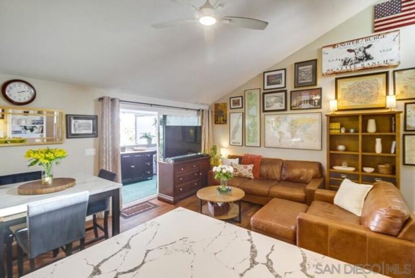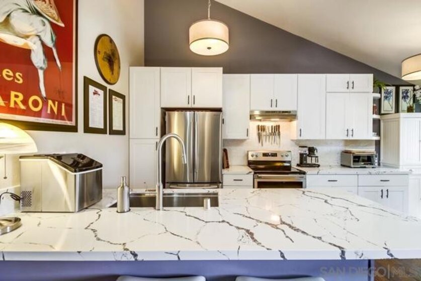 Stunning top floor unit nestled in University City! This gorgeous 1br/1ba unit features a GOURMET kitchen w/newer cabinets, quartz counters & stainless steel appliances. Vaulted ceilings, luxury vinyl floors, updated bath, 1 garage space & permit parking spot. When you step in the door you will be impressed! The large balcony overlooks trees & greenery. This centrally located beauty is close to the beach, freeways, shopping, public library & food. The complex is well maintained & has a sparkling pool. Why on earth would you rent, when you could call this home?!!