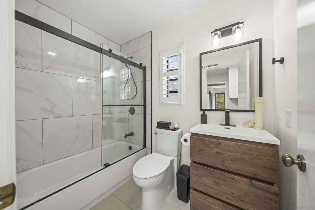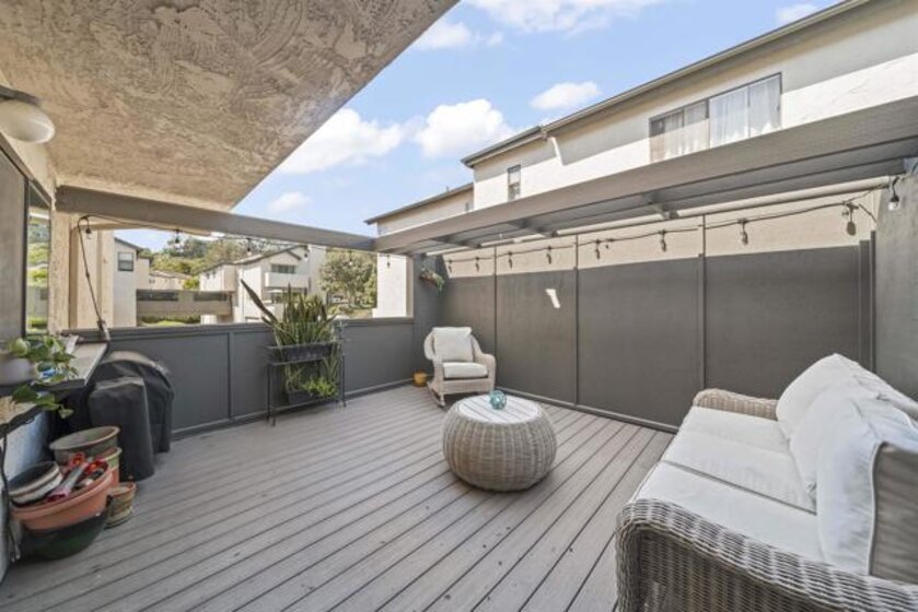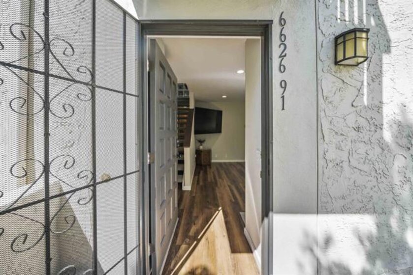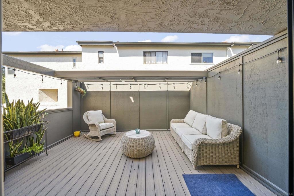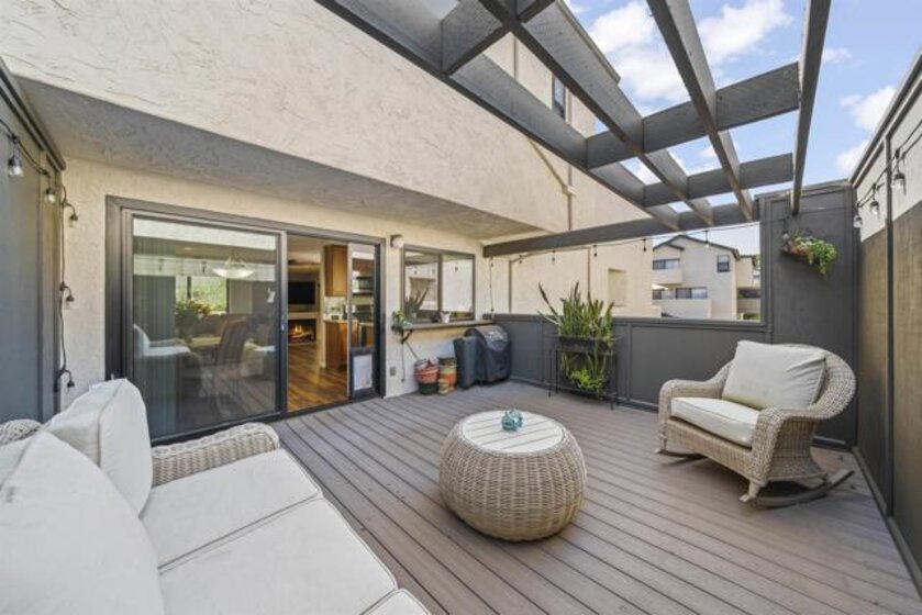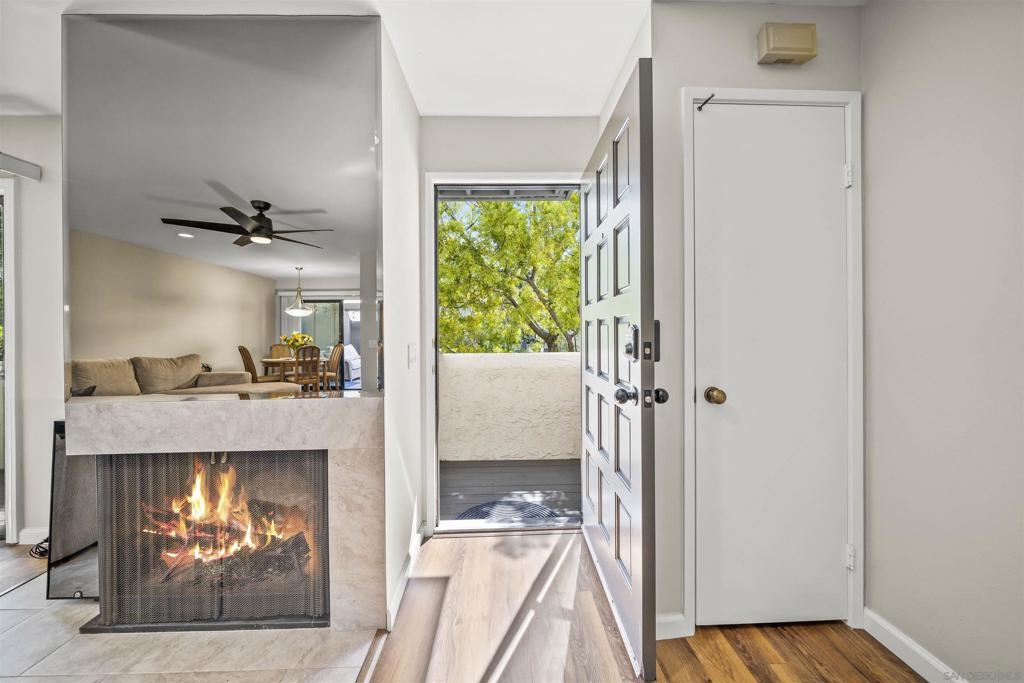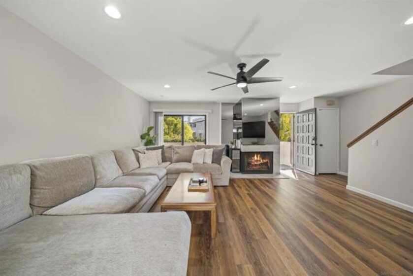 Stunning 2 bed, 2 bath home with updated finishes in the desirable North Rim community. The open and spacious living area features abundant natural light and flows seamlessly into the dining area, kitchen, and private patio deck—perfect for relaxing or entertaining. Going up the stairs are soaring ceilings with a skylight, illuminating the stairway & upper level; generously sized bedrooms, two private balconies overlooking lush greenery, and beautifully fully remodeled bathrooms with designer finishes. Additional features include a 2-car garage with washer and dryer and custom storage under the stairs. Community amenities include a pool, spa, clubhouse, and tennis courts. Conveniently located near freeways, shopping, dining, schools, USD, beaches & so much more! VA & FHA approved! HOA includes water, sewer, and trash!
