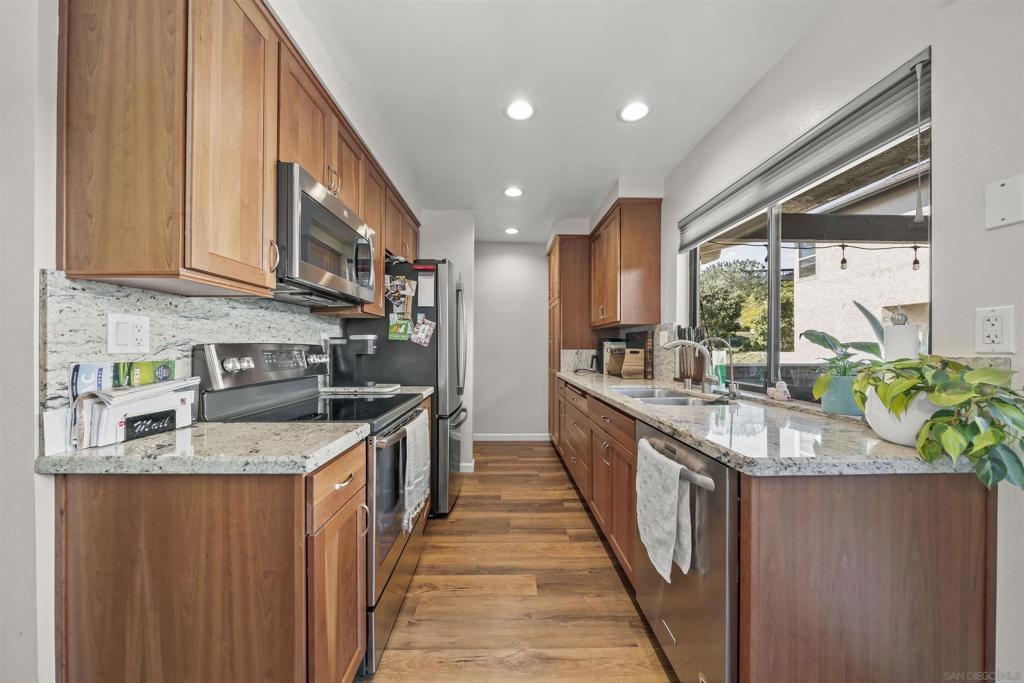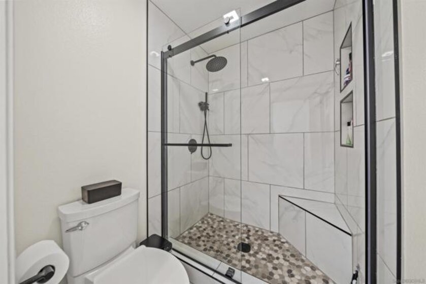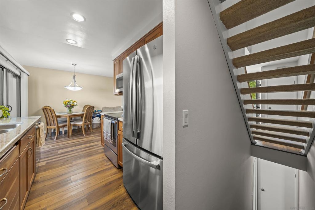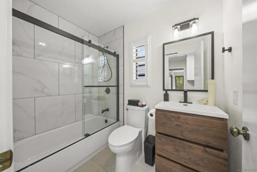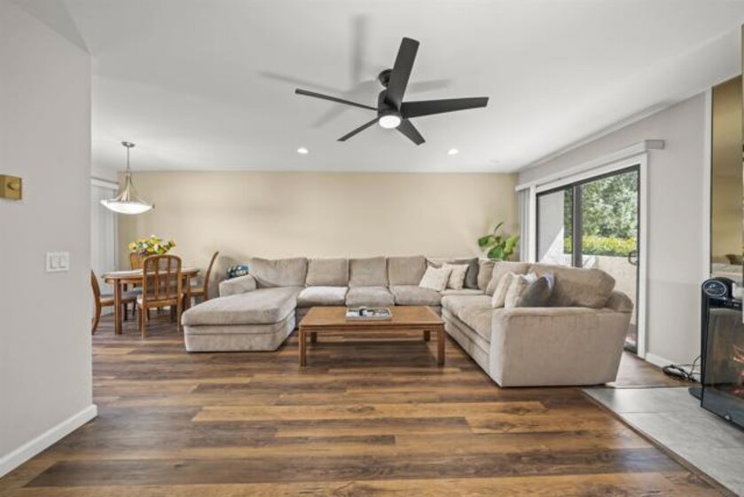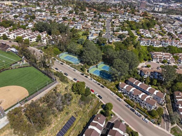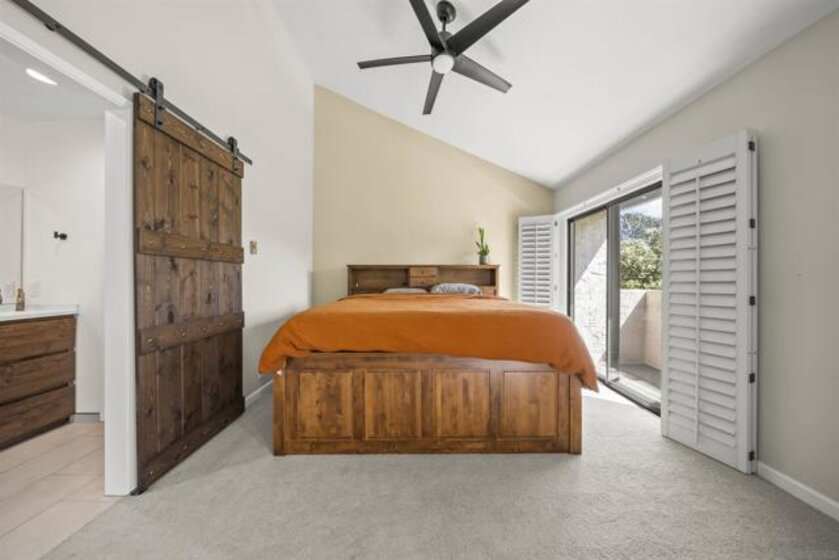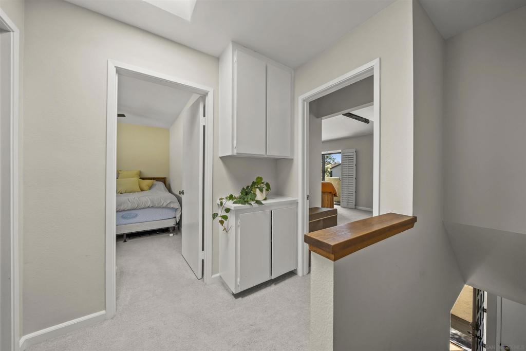 Stunning 2 bed, 2 bath home with updated finishes in the desirable North Rim community. The open and spacious living area features abundant natural light and flows seamlessly into the dining area, kitchen, and private patio deck—perfect for relaxing or entertaining. Going up the stairs are soaring ceilings with a skylight, illuminating the stairway & upper level; generously sized bedrooms, two private balconies overlooking lush greenery, and beautifully fully remodeled bathrooms with designer finishes. Additional features include a 2-car garage with washer and dryer and custom storage under the stairs. Community amenities include a pool, spa, clubhouse, and tennis courts. Conveniently located near freeways, shopping, dining, schools, USD, beaches & so much more! VA & FHA approved! HOA includes water, sewer, and trash!