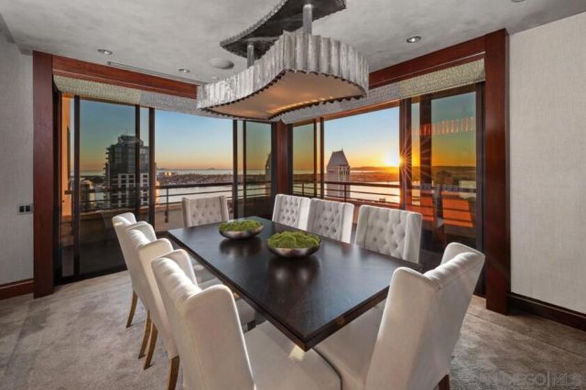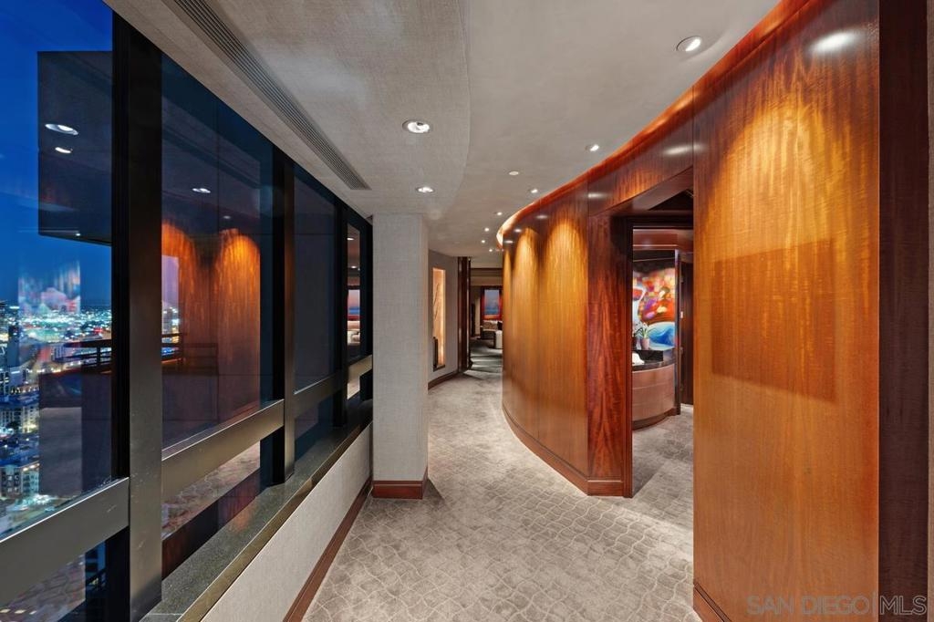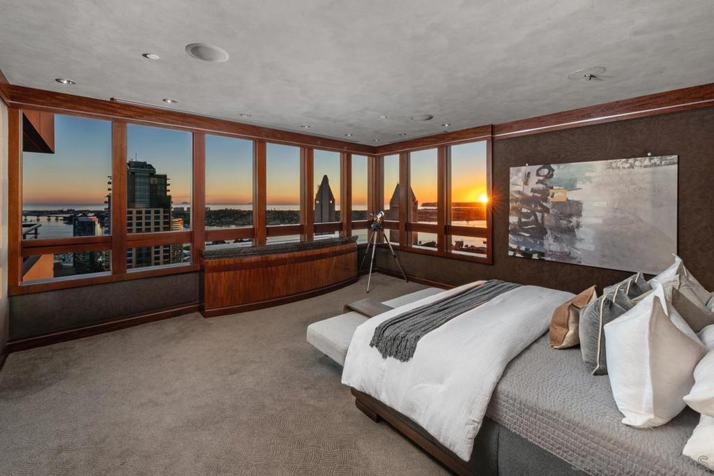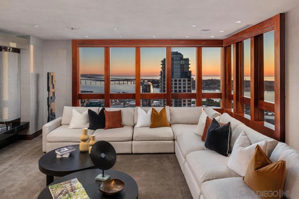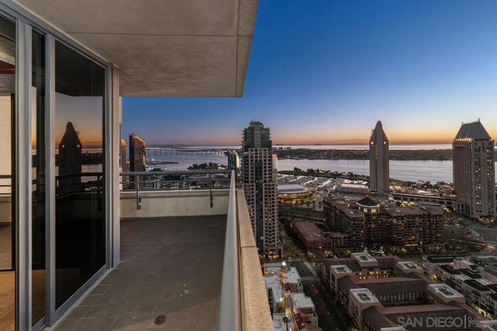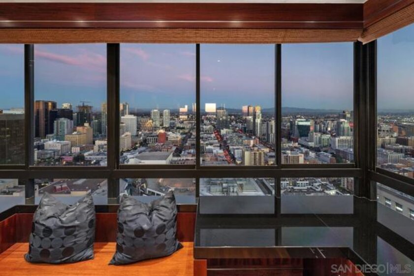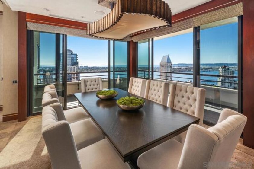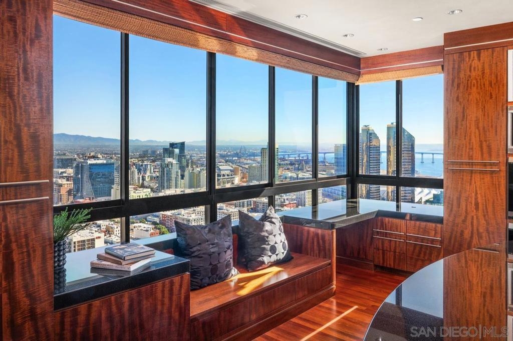 One Of A Kind. Penthouse 2701 stands as a unique testament to architectural brilliance, nestled in the dynamic core of downtown San Diego. Transformed and meticulously maintained, this residence boasts nearly 3,400 square feet of artfully crafted living space. It offers unobstructed vistas of the ocean, city, bay, and mountains. Designed to provide serene seclusion while showcasing art, light, and volume, the home gracefully unfolds through expansive open areas, sculptural forms, and fluid indoor-outdoor transitions that captivate from dawn to dusk. Positioned at the very top, this exceptional penthouse is a rare offering of scale, privacy, and prestige. Meticulously curated, with panoramic views spanning downtown San Diego, the waterfront, coastline, and ocean. A formal gallery-style entry sets the tone, leading to expansive living and dining areas framed by floor-to-ceiling windows, automated custom blinds, and wraparound terraces. The exhibition kitchen is a showpiece, featuring custom book-matched Cuban mahogany cabinetry, single-slab granite counters, premium appliances including Sub-Zero and Gaggenau, an eat-at island, integrated workspace, and balcony access. Entertaining is seamless with a theater-style media wall, central audio-visual system, specialty lighting for artwork, and designer wall treatments throughout. The primary suite is a private retreat with upholstered walls, wool carpeting, stunning views, dual custom dressing rooms, and a spa-inspired bath with steam shower, jetted tub, and bespoke finishes. A second bedroom/office suite offers custom cabinetry, built-in desk, morning bar, and ensuite bath. Additional highlights include two balconies, 12’6” custom ceilings, sound-enhanced construction, motorized shades with UV-protective glass treatments, and two parking spaces. Renowned for its cutting-edge technology and forward-thinking design, this penthouse offers enduring appeal and timeless style. Truly an irreplaceable opportunity, tailored for those who cherish space, perspective, and distinction above all else. The Meridian offers unparalleled amenities: 24-hour concierge and 24-hour valet parking, 2 state-of-the-art fitness centers with sauna and steam room, and a resort-style deck with heated pool and spa, cabanas, lounging area with firepit, outdoor grills, and lush gardens. Designed for both elegance and privacy, this iconic building delivers a lifestyle of ease, beauty, and cultural connection—just steps from San Diego’s finest dining, arts, and waterfront experiences.