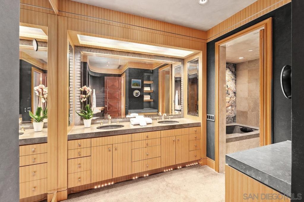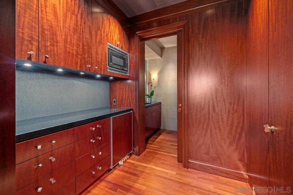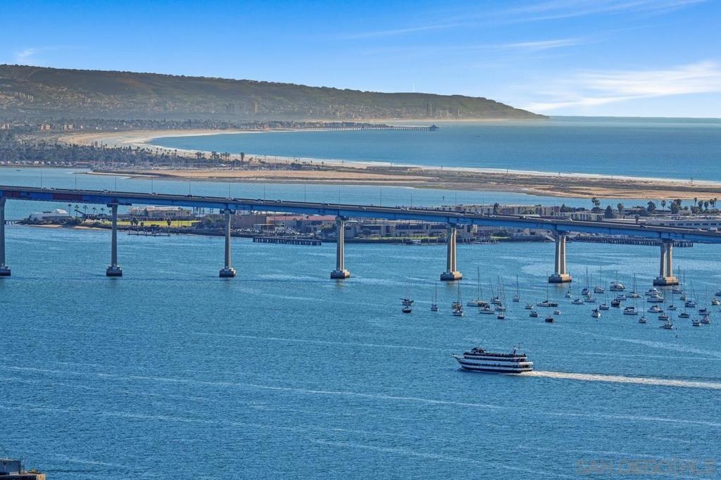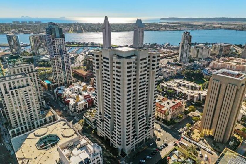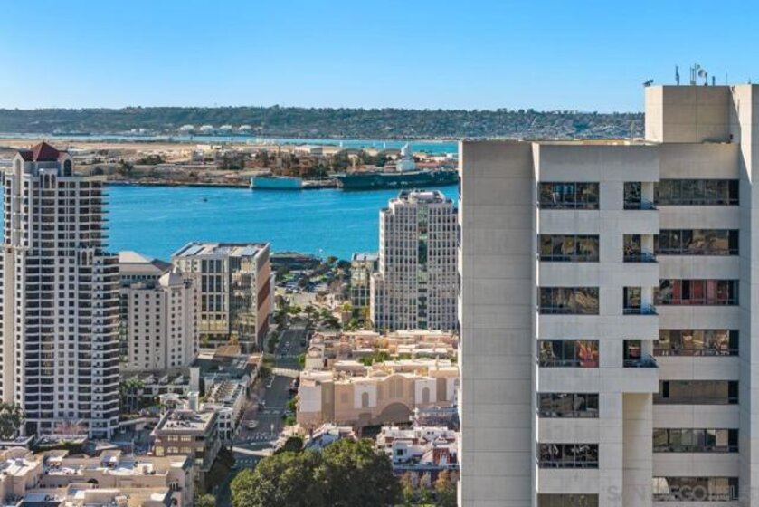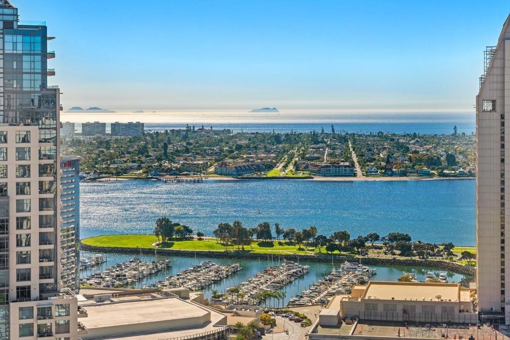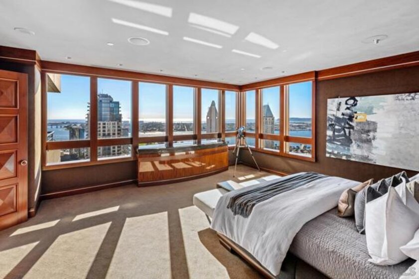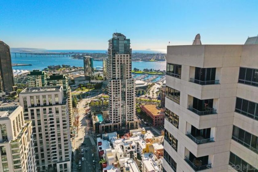 One Of A Kind. Penthouse 2701 stands as a unique testament to architectural brilliance, nestled in the dynamic core of downtown San Diego. Transformed and meticulously maintained, this residence boasts nearly 3,400 square feet of artfully crafted living space. It offers unobstructed vistas of the ocean, city, bay, and mountains. Designed to provide serene seclusion while showcasing art, light, and volume, the home gracefully unfolds through expansive open areas, sculptural forms, and fluid indoor-outdoor transitions that captivate from dawn to dusk. Positioned at the very top, this exceptional penthouse is a rare offering of scale, privacy, and prestige. Meticulously curated, with panoramic views spanning downtown San Diego, the waterfront, coastline, and ocean. A formal gallery-style entry sets the tone, leading to expansive living and dining areas framed by floor-to-ceiling windows, automated custom blinds, and wraparound terraces. The exhibition kitchen is a showpiece, featuring custom book-matched Cuban mahogany cabinetry, single-slab granite counters, premium appliances including Sub-Zero and Gaggenau, an eat-at island, integrated workspace, and balcony access. Entertaining is seamless with a theater-style media wall, central audio-visual system, specialty lighting for artwork, and designer wall treatments throughout. The primary suite is a private retreat with upholstered walls, wool carpeting, stunning views, dual custom dressing rooms, and a spa-inspired bath with steam shower, jetted tub, and bespoke finishes. A second bedroom/office suite offers custom cabinetry, built-in desk, morning bar, and ensuite bath. Additional highlights include two balconies, 12’6” custom ceilings, sound-enhanced construction, motorized shades with UV-protective glass treatments, and two parking spaces. Renowned for its cutting-edge technology and forward-thinking design, this penthouse offers enduring appeal and timeless style. Truly an irreplaceable opportunity, tailored for those who cherish space, perspective, and distinction above all else. The Meridian offers unparalleled amenities: 24-hour concierge and 24-hour valet parking, 2 state-of-the-art fitness centers with sauna and steam room, and a resort-style deck with heated pool and spa, cabanas, lounging area with firepit, outdoor grills, and lush gardens. Designed for both elegance and privacy, this iconic building delivers a lifestyle of ease, beauty, and cultural connection—just steps from San Diego’s finest dining, arts, and waterfront experiences.