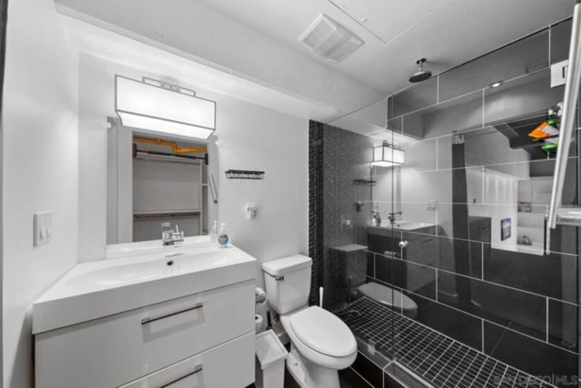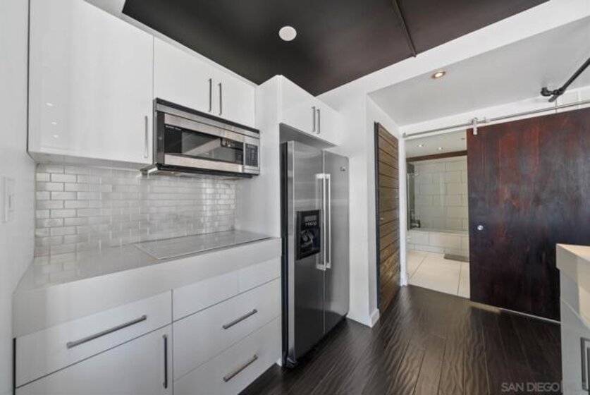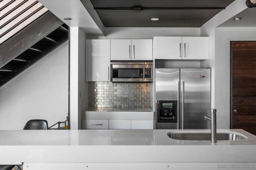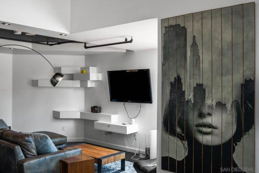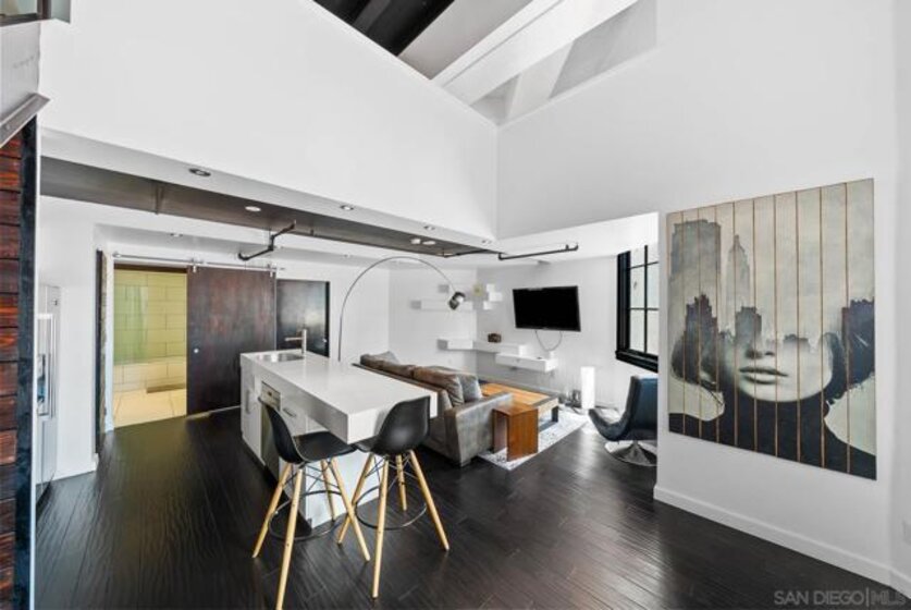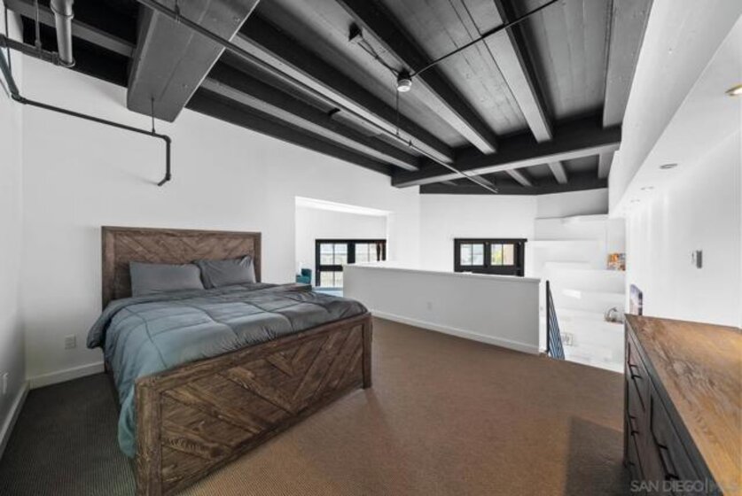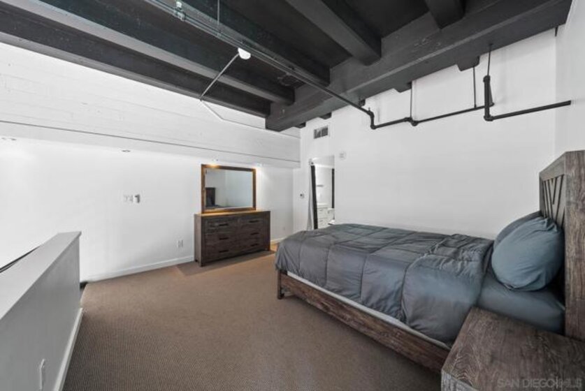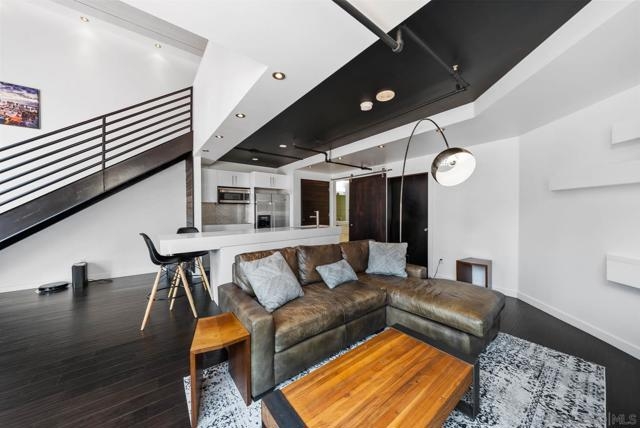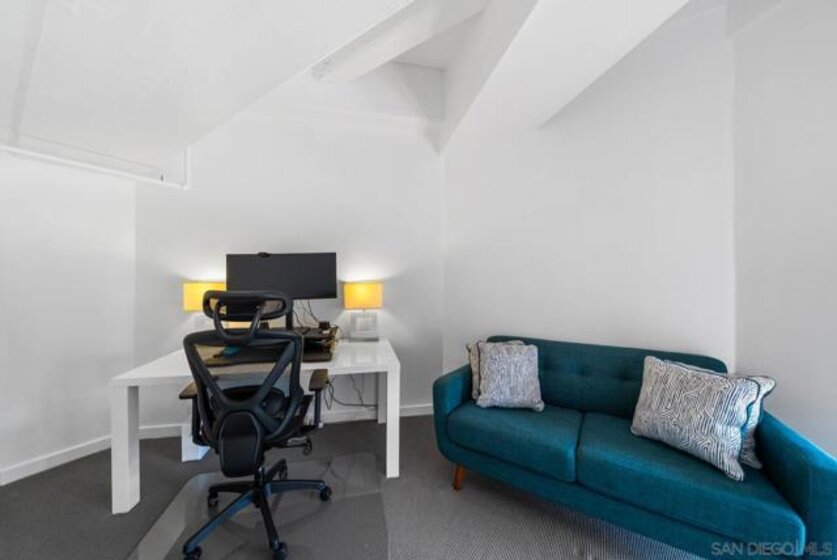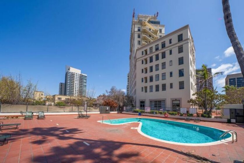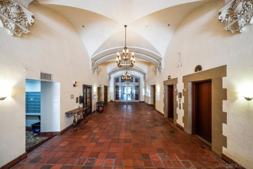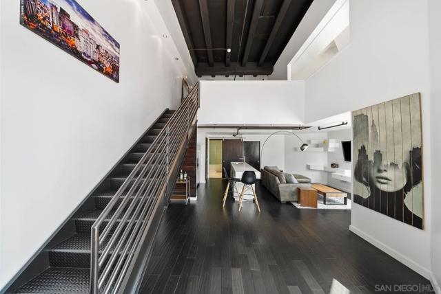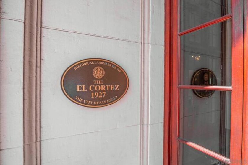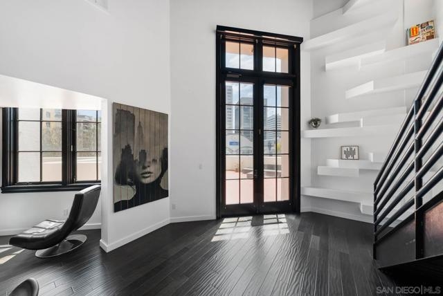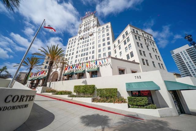Rare & stylish bachelor(ette) loft featuring striking 20-foot ceilings & an outdoor patio. Don't be discouraged by monthly HOA. The current owner is paying only $2,200 ANNUALLY* in property taxes because of Mills Act Historic designation. Private entrance accessible from 1st floor of building, NO elevator needed! Step through elegant French doors into an expansive, sunlit open space with soaring ceilings, exposed beams, and an urban NYC loft ambiance ideal for art displays. The main level offers beautiful natural wood floors, a modern kitchen with island, spacious living area, full guest bath, and walk-in storage. Upstairs, the loft includes a roomy bedroom, dedicated office area, walk-in closet, and second full bath. Outside, relax on your private patio nestled among jacarandas with views of the city skyline. Perched 175 feet above sea level, the iconic El Cortez is a San Diego Historical Landmark listed on the National Register of Historic Places. Originally built in 1927, it has hosted notable guests like Eisenhower and Elvis Presley. Set in tranquil Cortez Hill, you're close to Petco Park, Gaslamp, Little Italy, and Balboa Park. Amenities include parking, fitness center, pool, and EV chargers. Visit this exceptional home today—Carpe Diem! *Mills Act subject to annual assessment and extension every 5 years. Buyer to satisfy themselves with Mills Act terms.