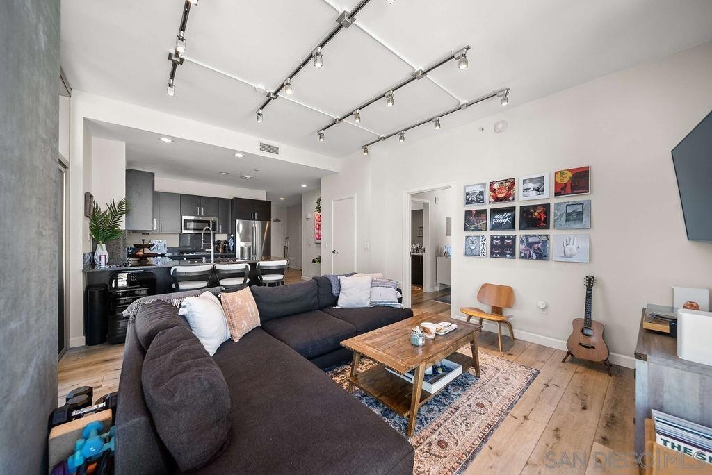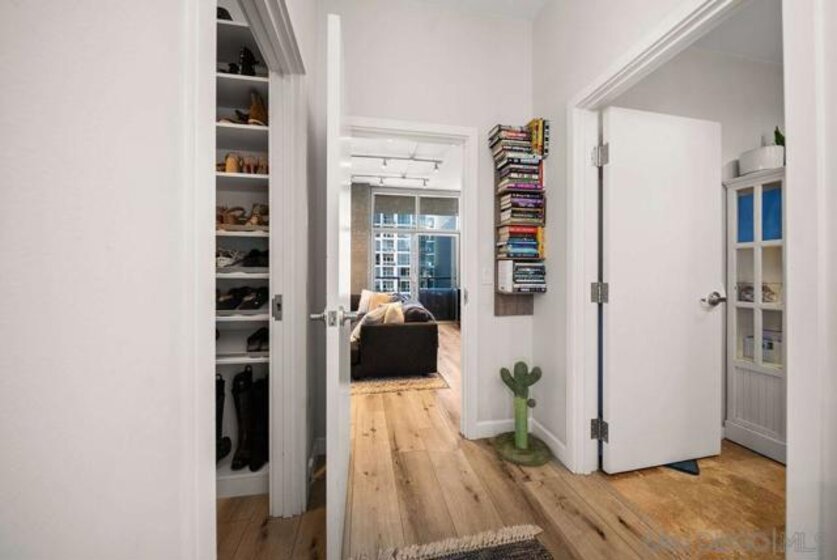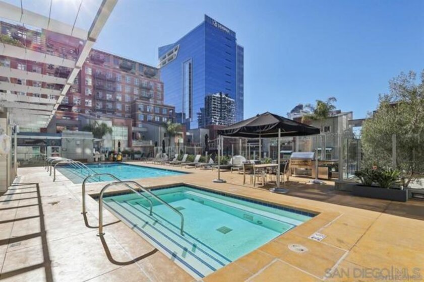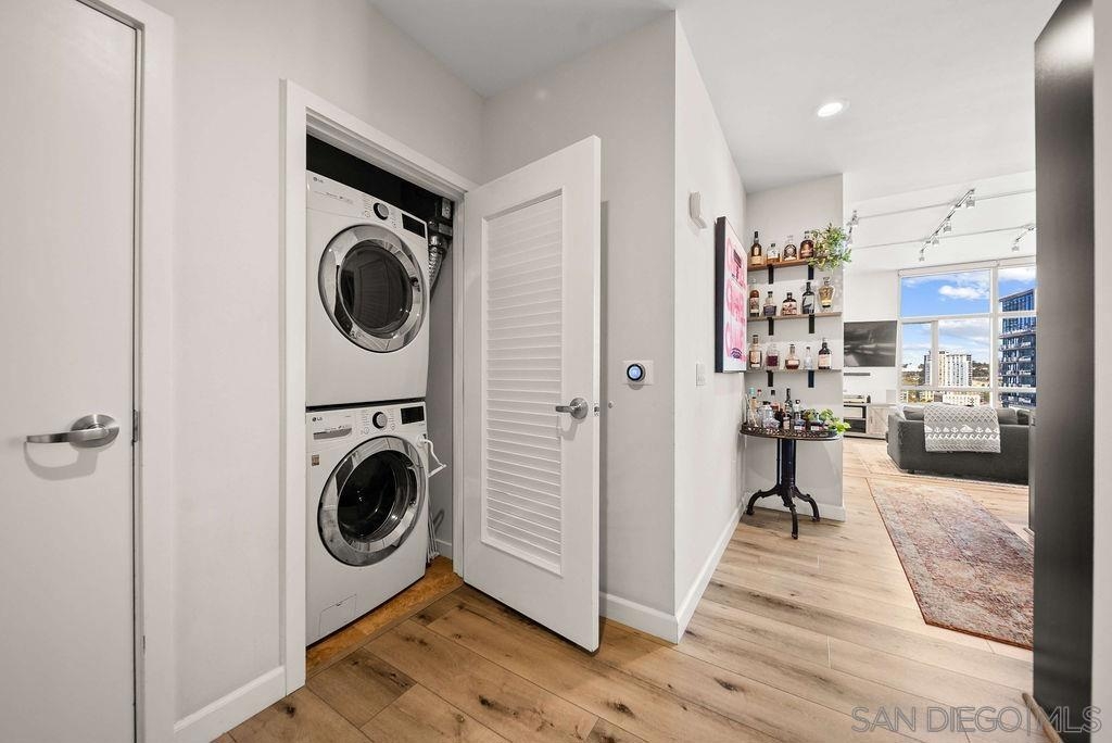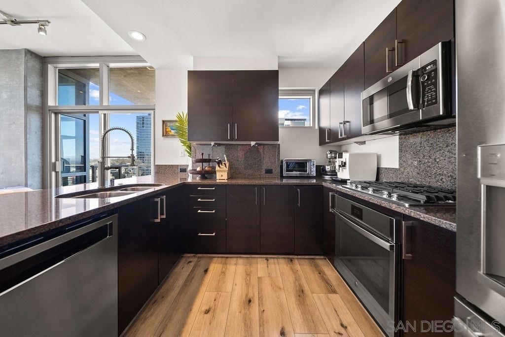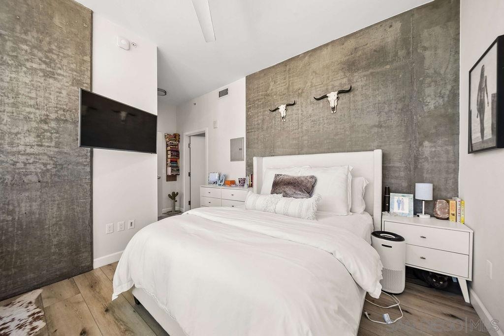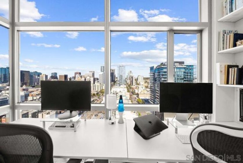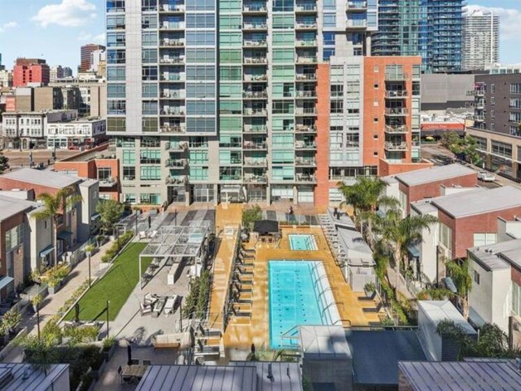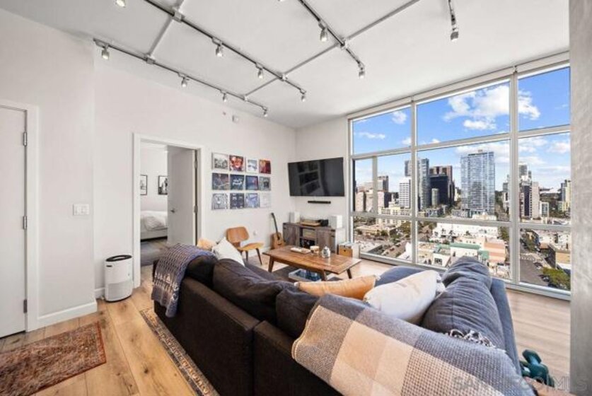 A true standout at The Mark, Residence 2104 is a fully remodeled high-floor residence that feels like a trophy in the sky. Offering sweeping skyline views, exceptional natural light, and a rare oversized private balcony that elevates everyday living. Floor-to-ceiling windows with custom automatic shades create a dramatic sense of openness, while the expansive balcony serves as an ideal setting for entertaining, unwinding, or simply enjoying the energy of the city from above. The thoughtfully redesigned interior showcases a refined, modern aesthetic and a layout that lives beautifully. The updated kitchen opens seamlessly to the living and dining areas, creating a comfortable yet sophisticated environment. Custom California Closets built-ins provide elevated storage and organization, complementing the home’s clean lines and high-quality finishes. Every detail has been carefully considered, making this one of the most desirable residences in the building. Residents enjoy resort-level amenities including a saltwater pool and spa, fully equipped fitness center, meeting spaces, BBQ patios, pizza ovens, lush common areas, and an on-site guard for added peace of mind. Secure parking and professional management complete the experience at The Mark. Just moments from Petco Park, the Gaslamp Quarter, top dining, nightlife, and the waterfront, this is Downtown living at its most refined!