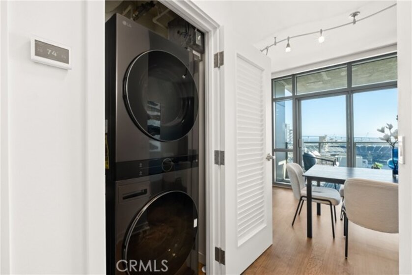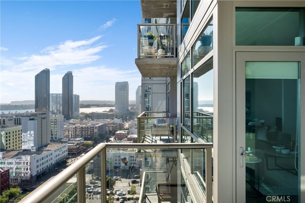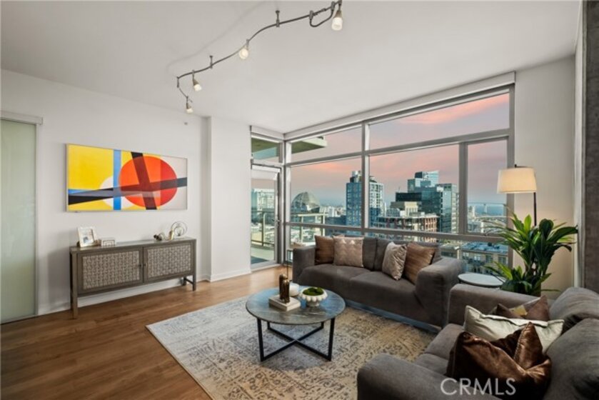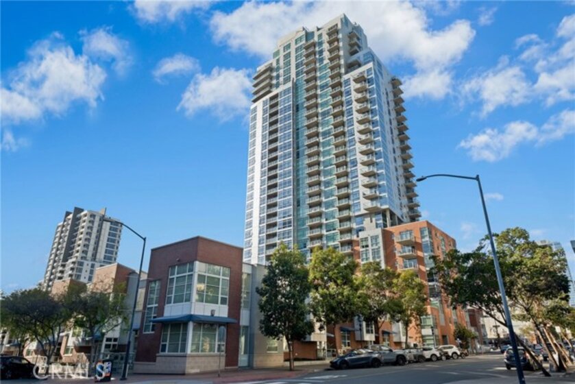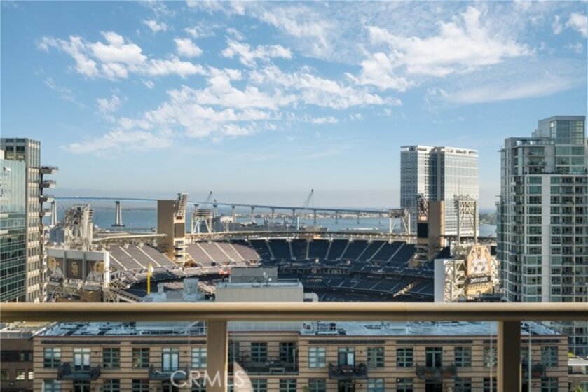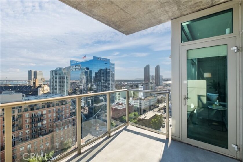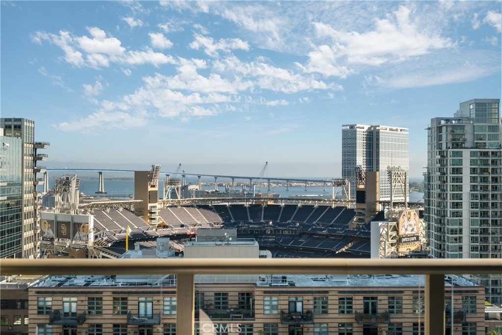 Experience the energy of Petco Park from your own home! This south-facing residence at The Mark offers panoramic stadium and water views, along with clear views of the Coronado Bridge and distant mountain vistas, framed by floor-to-ceiling windows and two private balconies that fill the space with natural light, creating a true downtown San Diego living experience. Recently and extensively upgraded, this truly turnkey home features brand new high-end Calacatta quartz countertops and new sinks w/ Delta fixtures throughout, premium GE Profile smart appliances (never used), refinished wood flooring and new wool Berber carpet in the bedroom and fresh interior paint throughout. Additional enhancements include a custom walk-in closet, light switches w/ integrated Alexa tech hub, designer lighting and a frosted glass sliding door, creating a modern and elevated feel. Significant recent improvements provide a level of finish and value rarely found at this price point, w/ additional upgrades throughout. With 1,051 sq ft of interior living space, plus an additional 200 sq ft of private outdoor space across two balconies, this residence offers an expansive layout rarely found in a one-bedroom residence in downtown San Diego. The flexible dining and flex area can be converted into a second bedroom if desired, but the expansive open layout, combined with a well-sized half bath, makes it ideal as a spacious one-bedroom with room to live, work, and entertain. The spacious primary suite offers balcony access, motorized shades, generous closet space, and a well-maintained design. Two secured parking spaces and a generous dedicated storage unit add exceptional convenience, with one premium parking space offering direct access to the storage unit, an especially convenient and highly valued setup in the building. Located in one of Downtown San Diego’s premier high-rise communities, The Mark offers resort-style amenities including pool, spa, fitness center, outdoor entertaining areas, and secure entry, just steps from Petco Park, the Gaslamp Quarter, dining, and entertainment, all w/ relatively low HOA compared to similar buildings in downtown. The building has approved plans for extensive upgrades to common areas, including the lobby, hallways, fitness center, and shared spaces, with a contractor selected, further enhancing long-term value and appeal. A rare opportunity to own a view-driven, sun-filled residence in one of downtown San Diego’s most sought-after locations.