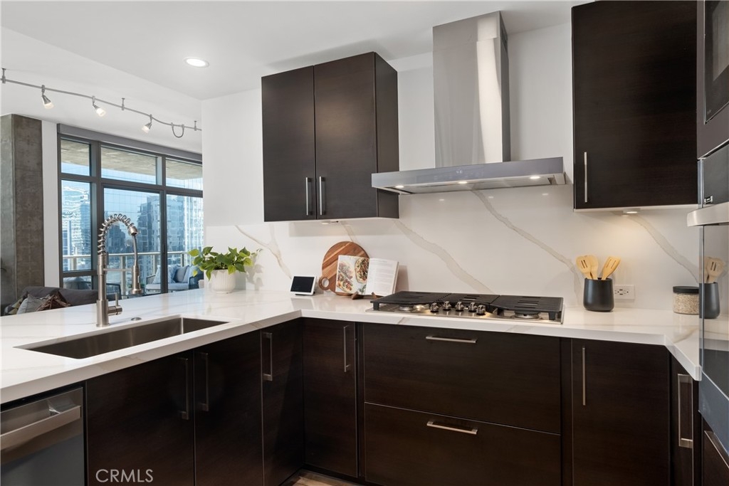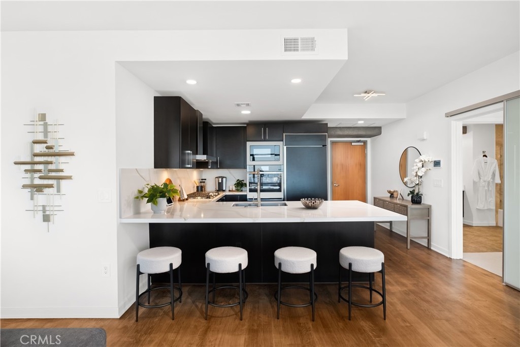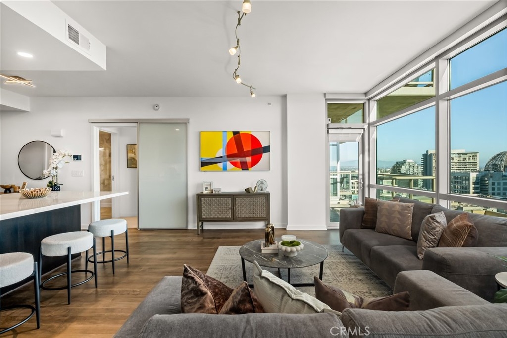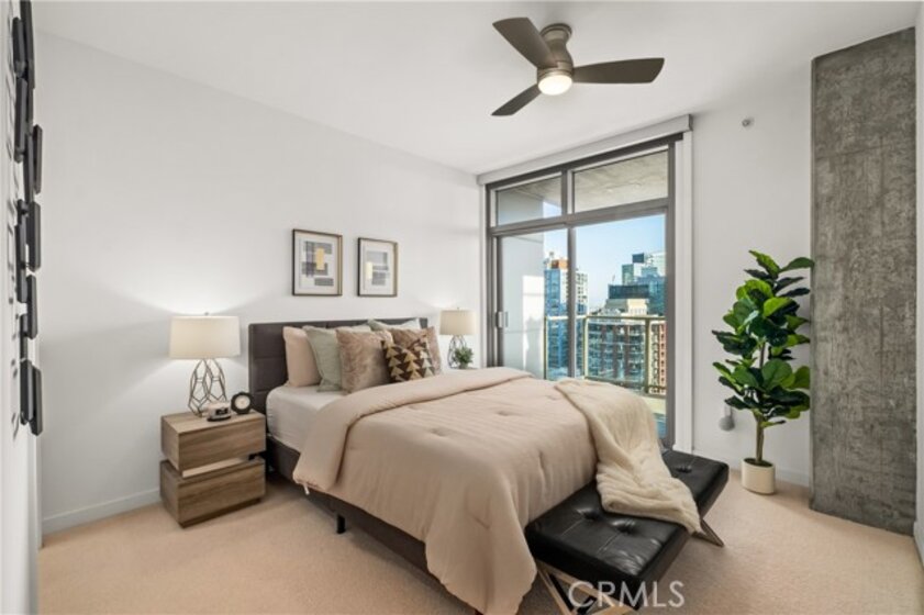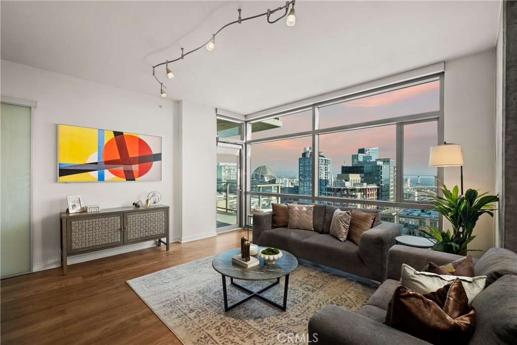 Experience the energy of Petco Park from your own home! This south-facing residence at The Mark offers panoramic stadium and water views, along with clear views of the Coronado Bridge and distant mountain vistas, framed by floor-to-ceiling windows and two private balconies that fill the space with natural light, creating a true downtown San Diego living experience. Recently and extensively upgraded, this truly turnkey home features brand new high-end Calacatta quartz countertops and new sinks w/ Delta fixtures throughout, premium GE Profile smart appliances (never used), refinished wood flooring and new wool Berber carpet in the bedroom and fresh interior paint throughout. Additional enhancements include a custom walk-in closet, light switches w/ integrated Alexa tech hub, designer lighting and a frosted glass sliding door, creating a modern and elevated feel. Significant recent improvements provide a level of finish and value rarely found at this price point, w/ additional upgrades throughout. With 1,051 sq ft of interior living space, plus an additional 200 sq ft of private outdoor space across two balconies, this residence offers an expansive layout rarely found in a one-bedroom residence in downtown San Diego. The flexible dining and flex area can be converted into a second bedroom if desired, but the expansive open layout, combined with a well-sized half bath, makes it ideal as a spacious one-bedroom with room to live, work, and entertain. The spacious primary suite offers balcony access, motorized shades, generous closet space, and a well-maintained design. Two secured parking spaces and a generous dedicated storage unit add exceptional convenience, with one premium parking space offering direct access to the storage unit, an especially convenient and highly valued setup in the building. Located in one of Downtown San Diego’s premier high-rise communities, The Mark offers resort-style amenities including pool, spa, fitness center, outdoor entertaining areas, and secure entry, just steps from Petco Park, the Gaslamp Quarter, dining, and entertainment, all w/ relatively low HOA compared to similar buildings in downtown. The building has approved plans for extensive upgrades to common areas, including the lobby, hallways, fitness center, and shared spaces, with a contractor selected, further enhancing long-term value and appeal. A rare opportunity to own a view-driven, sun-filled residence in one of downtown San Diego’s most sought-after locations.