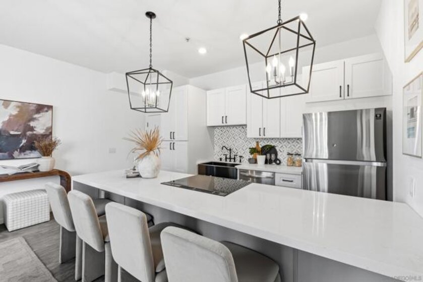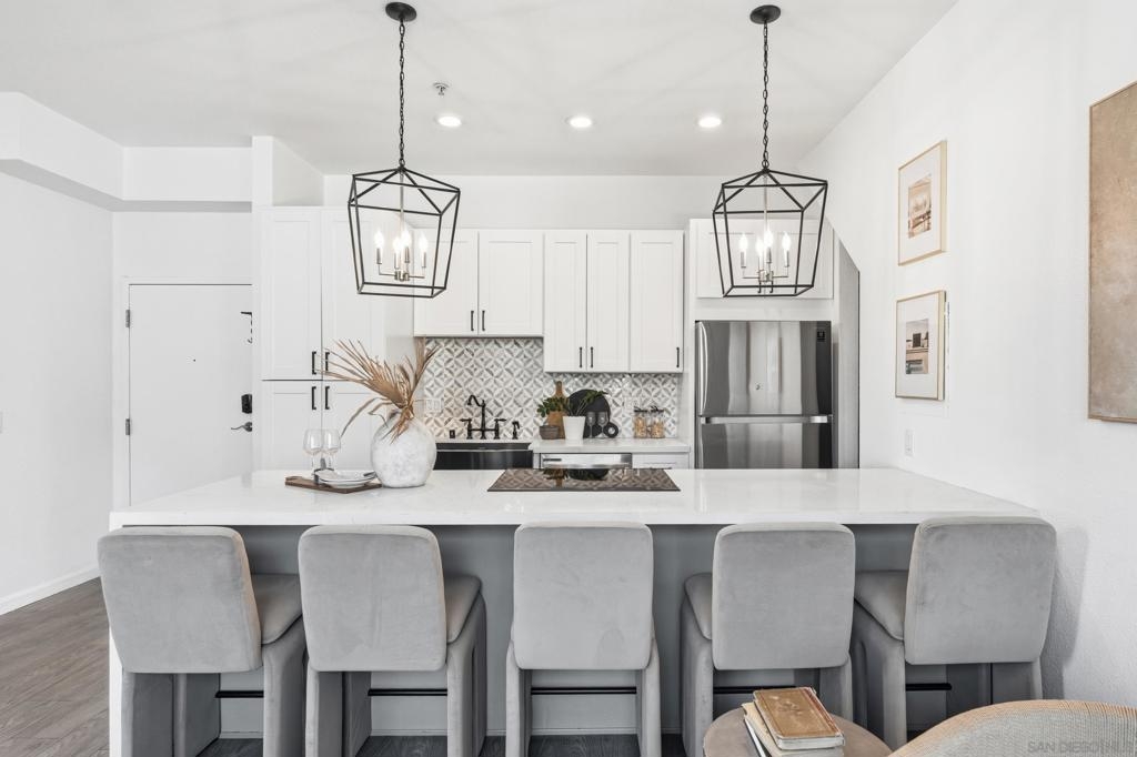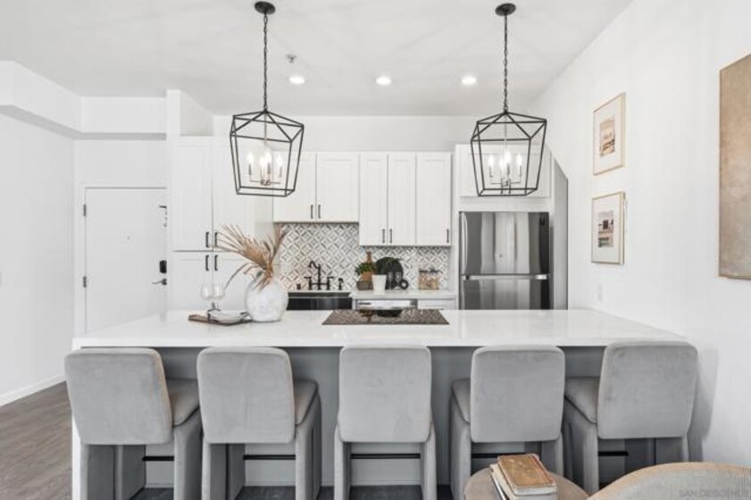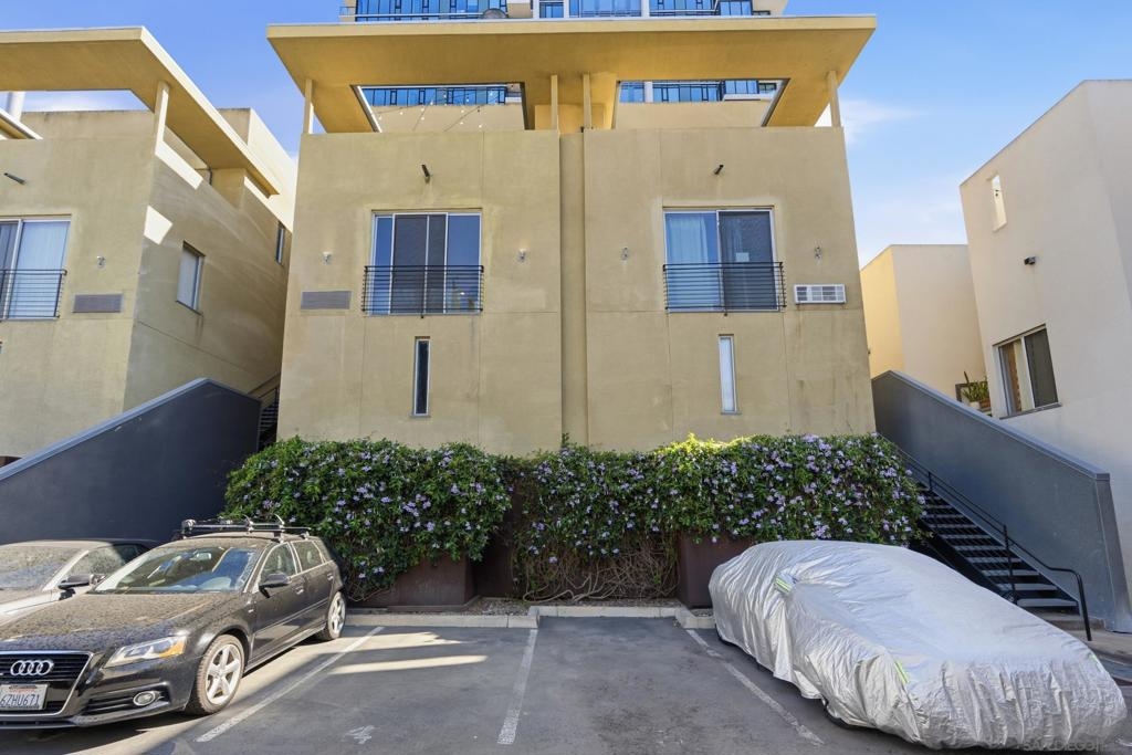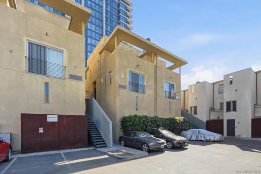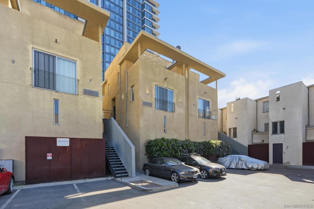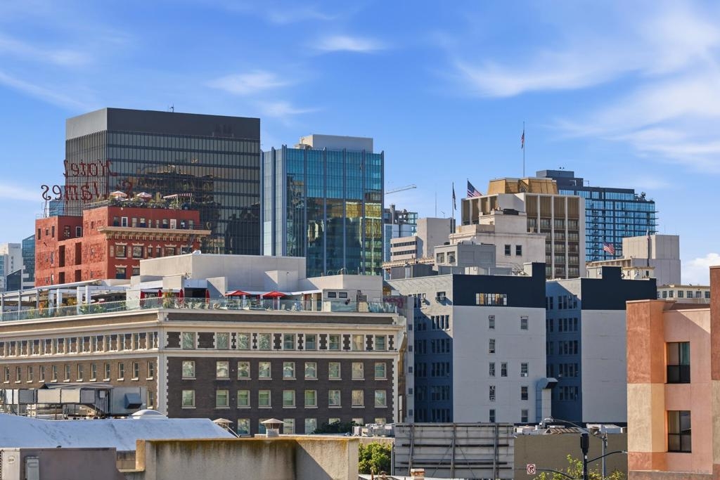 Experience iconic urban living in this beautifully renovated two-story corner loft designed by award-winning San Diego architect Jonathan Segal. Located in the sought-after Moto Villas Condos, this distinctive 1BD/1BA residence offers approximately 660 sq. ft. of thoughtfully designed living space with soaring 15–18 ft ceilings and oversized windows that flood the home with natural light. The open-concept layout blends industrial loft architecture with modern upgrades, featuring a renovated kitchen with stainless steel appliances, sleek cabinetry, and contemporary finishes. A convenient in-unit full-size washer and dryer plus added pantry storage enhance everyday functionality. Comfort is elevated with a mini-split heating and cooling system, providing efficient climate control year-round. Upstairs, the private loft bedroom opens to one of the home’s most unique features—an expansive ~150 sq. ft. private outdoor patio with a wood-burning fireplace and city views, creating an incredible extension of the living space. It’s the perfect setting for entertaining under the San Diego sky. Additional upgrades include modern bathroom fixtures, designer lighting, new concrete patio and stylish finishes throughout. Located within a gated community with one assigned parking space, this home offers privacy and convenience with one of the lowest HOAs around. Situated in vibrant Downtown East Village, just blocks from Petco Park, UCSD Extension, restaurants, coffee shops, and major freeways, this architectural loft offers the perfect blend of style, comfort, and walkable urban living.